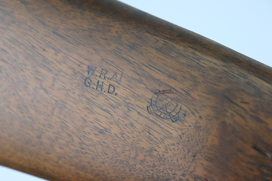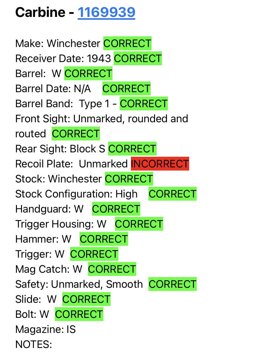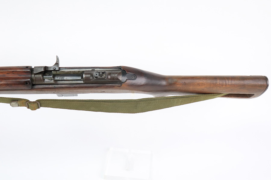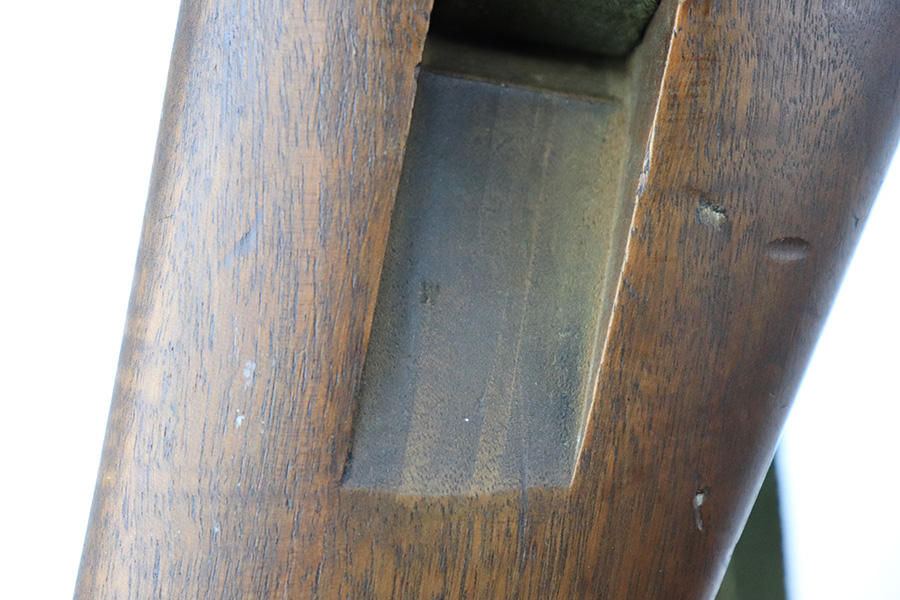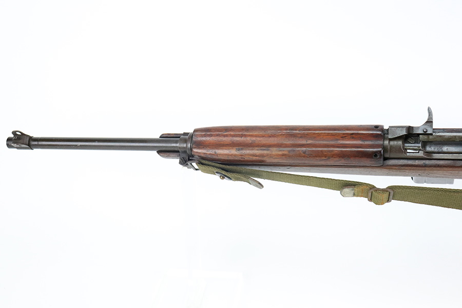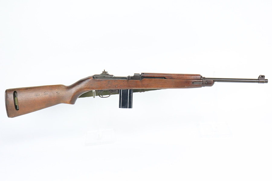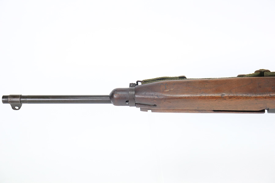6/17/22 – This is a scarce, early Winchester M1 Carbine from 1943. A full parts list is included, but the rifle is all original and correct except for the recoil plate, which was replaced. Scarce, original “pot belly” stock with proper inspection marks. The finish on the metal is original, with the receiver showing patina and minor thinning throughout. The stock has various dings and handling wear but no cracks. Bore is shiny with strong rifling but there’s a thin ring of wear near the muzzle end.