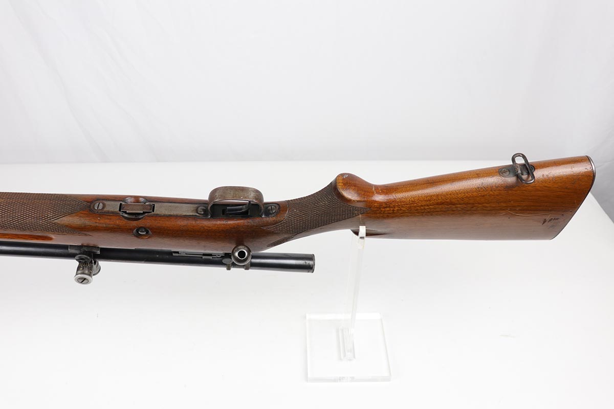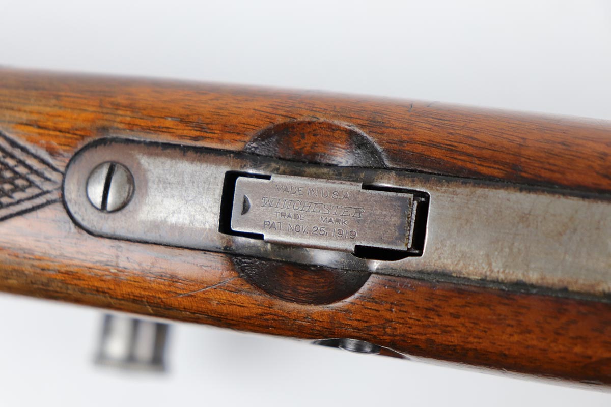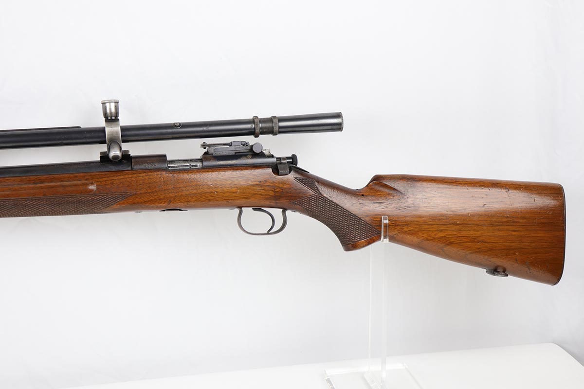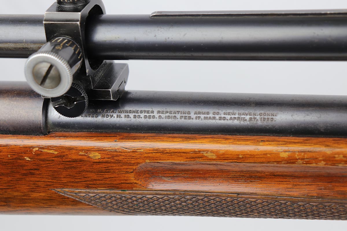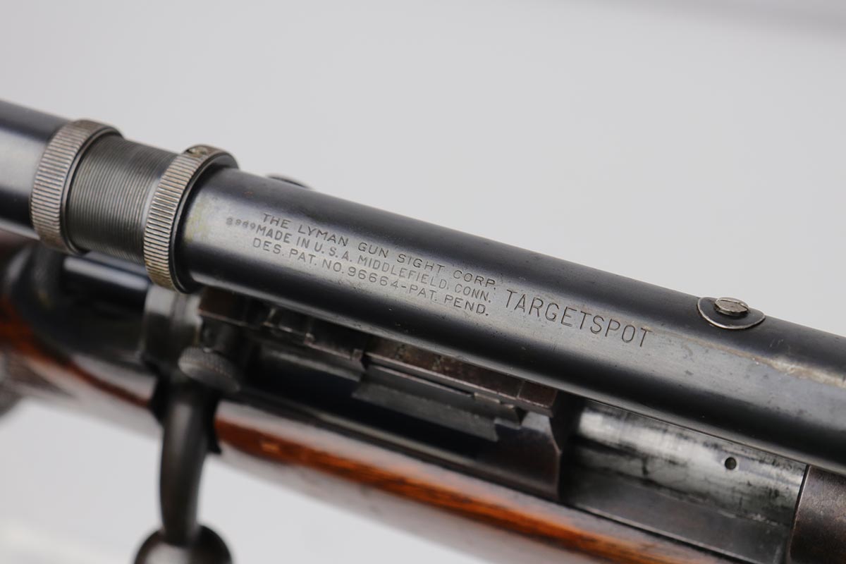 5/29/19 – This is an early example of a Winchester Model 52 target rifle with Lyman Targetspot scope. Production on the model 52 began in 1920, and has been referred to as the King of the .22’s, and called one of the “best 50 guns ever made” by Field & Stream. This example was produced in 1925 and retains about 80% of its original blue, with some thinning on the barrel but most finish loss on the trigger assembly and the top of the receiver. Smooth action and strong bore with only minor frost. Very nice, original stock with non-factory checkering. The early Lyman scope is a desirable addition, with crystal clear optics, though one arm of the crosshair is slightly bent but doesn’t affect functionality.