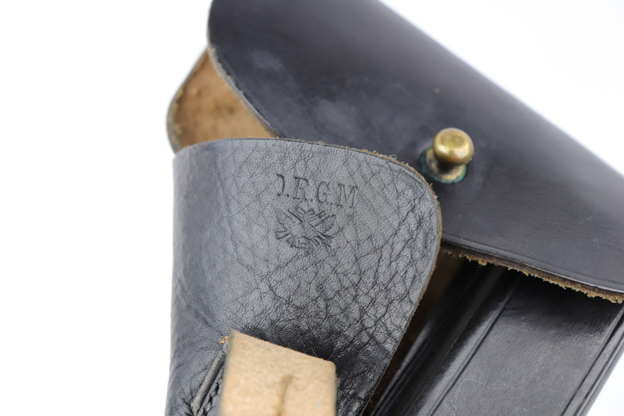 8/6/19 – This is a near mint and early example Walther PP holster by AKAH. The holster has early features like a brass closure knob and interior leather knob patch. The holster has very clean black leather with an interior ink stamp indicating Walther P.P. The black stitching is all original and in tact. Under the closure strap is an akah maker stamp. A very hard to upgrade and difficult to find, early PP holster.