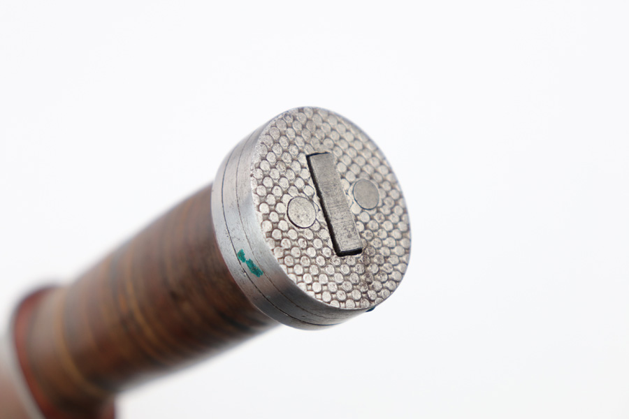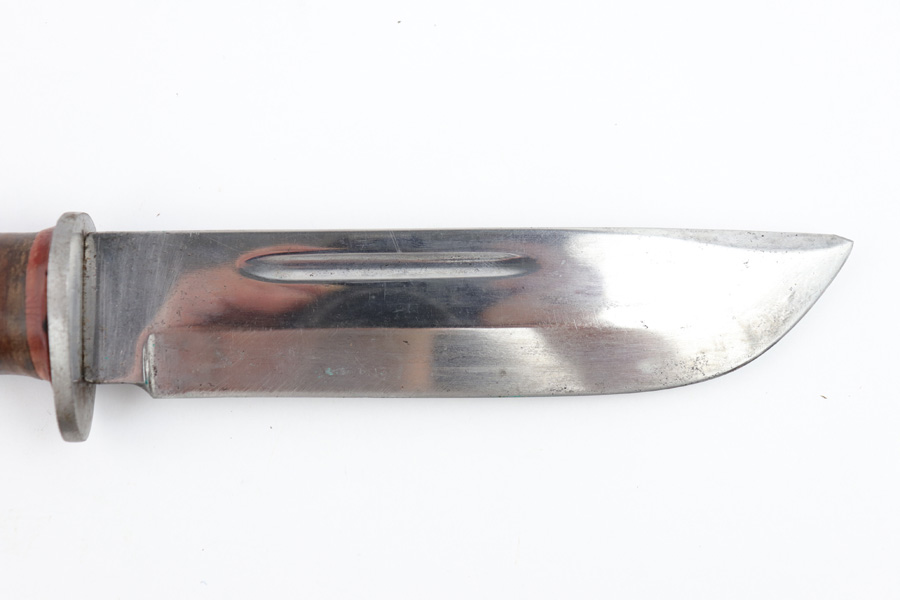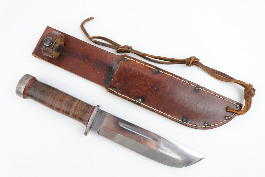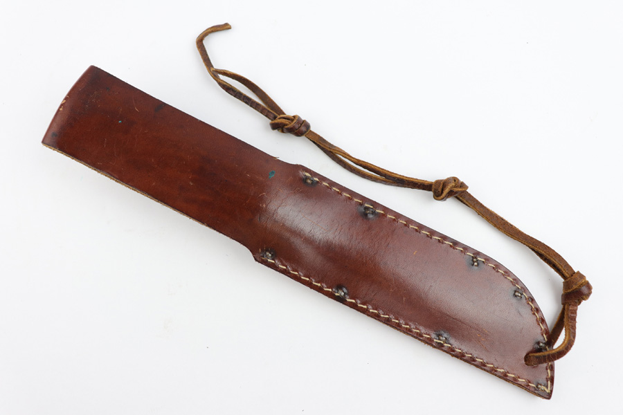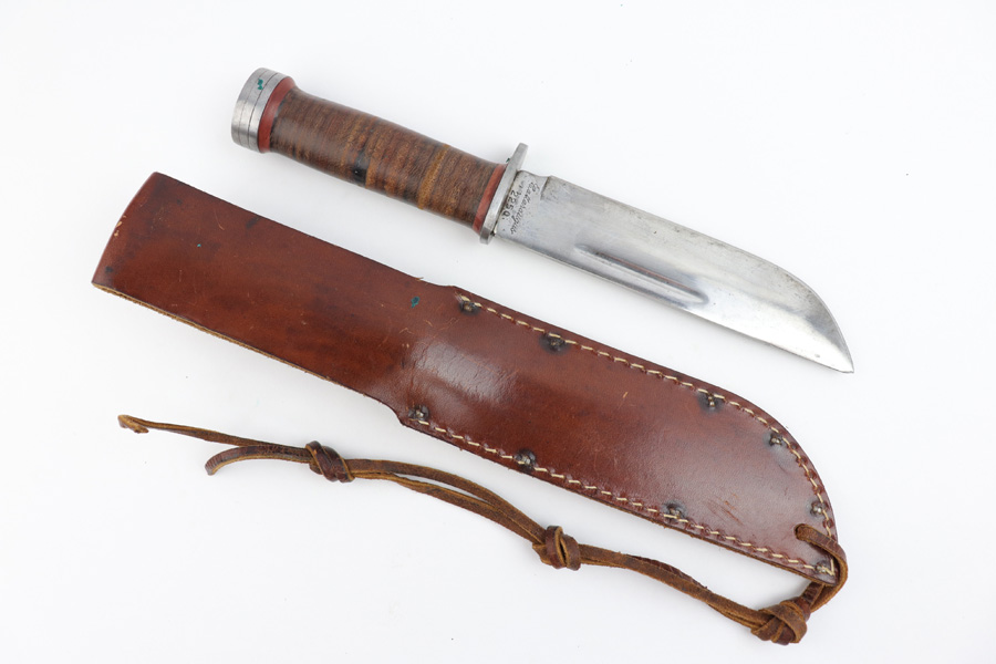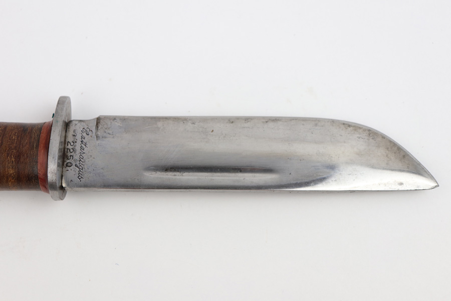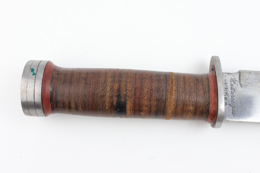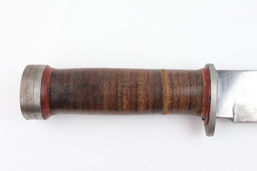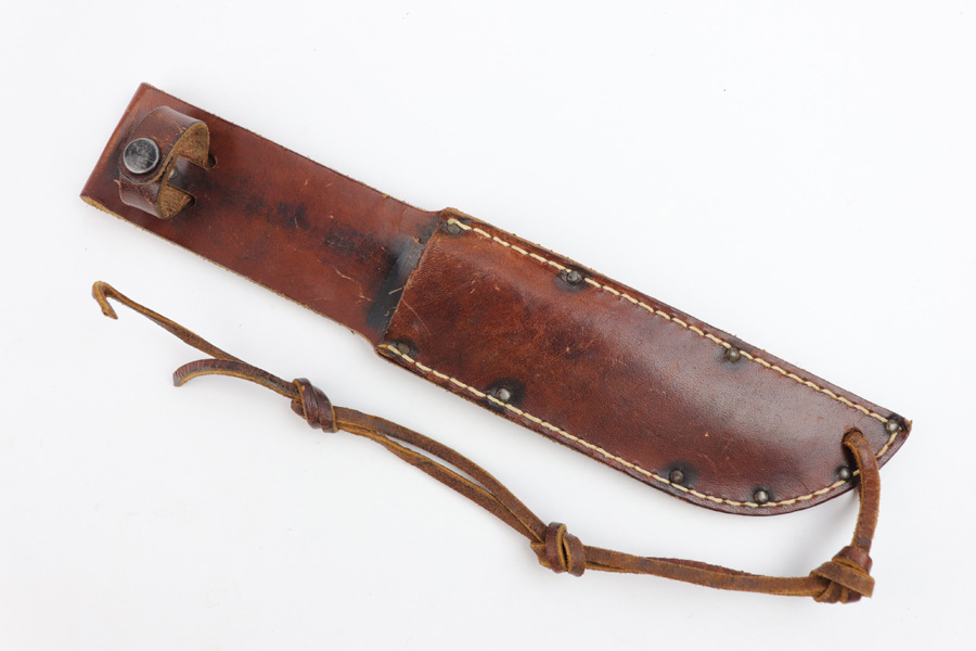 7/31/19 – This is an original WW2 era production Cattaraugus knife with the original leather sheath. The blade handle has early variation red spacers. Excellent pressed leather with no issues on the handle. The blade is very nice as well with no signs of sharpening. Some minor signs of use and light oxidation. The scabbard is excellent with no notable issues. All original and authentic.