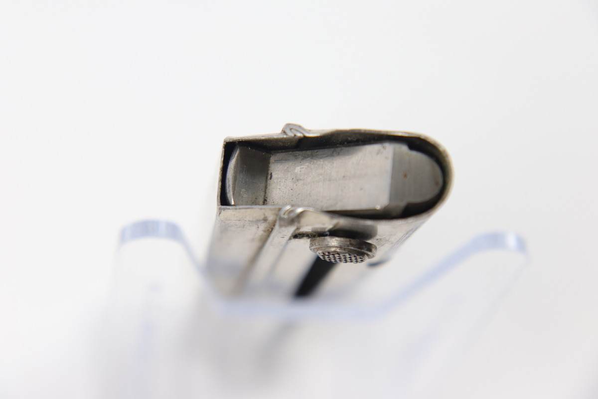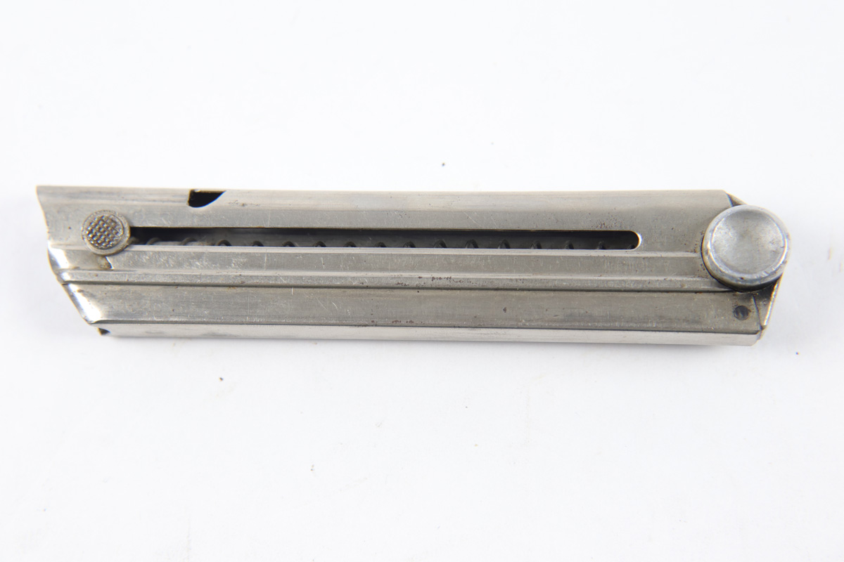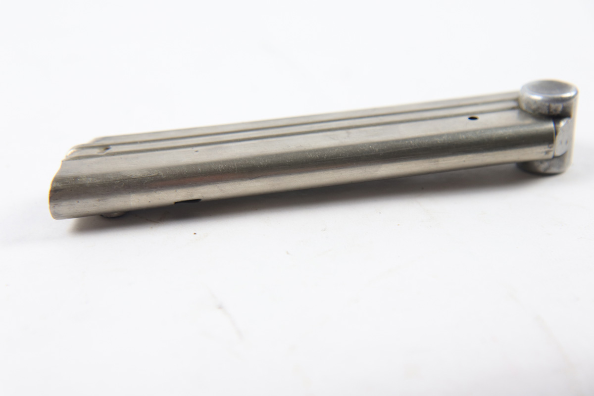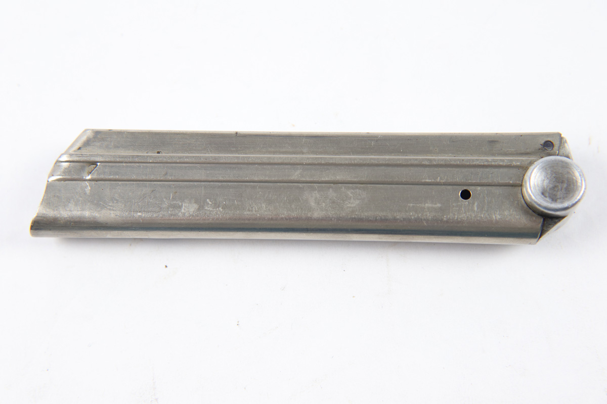 10/11/18 – This is an original early WW2 Mauser Luger magazine. The magazine has early features like an aluminum body and a droop winged eagle/63 on the base. The base is also serial numbered with a “g” suffix and “+” sign, indicating this as the spare magazine. The magazine has a strong fully functional spring. Some minor wear but overall excellent and guaranteed original.