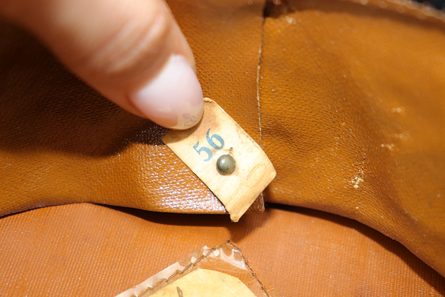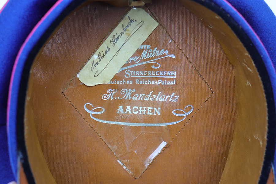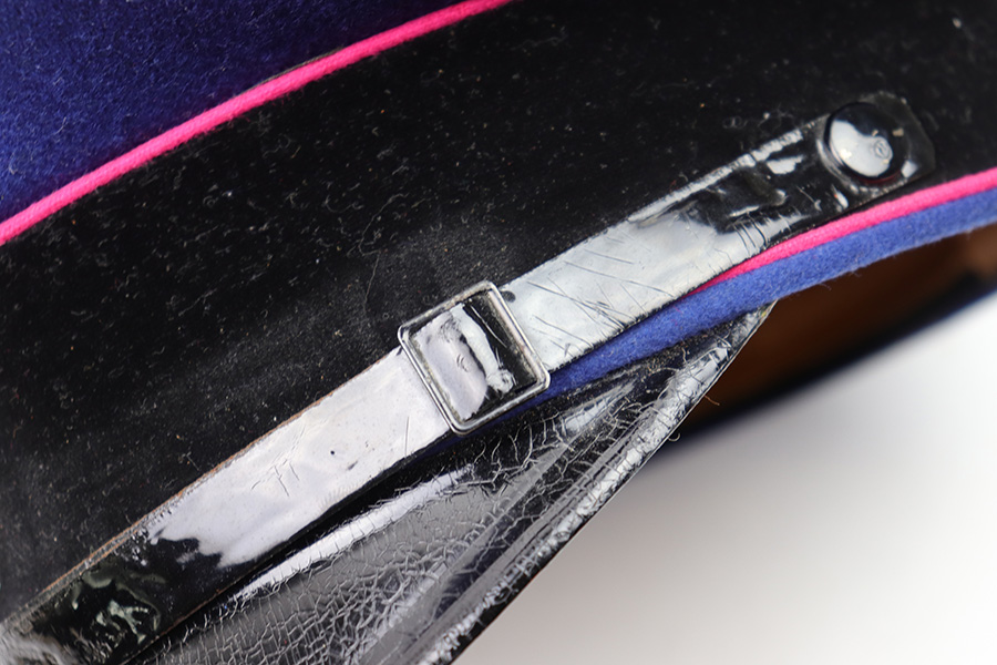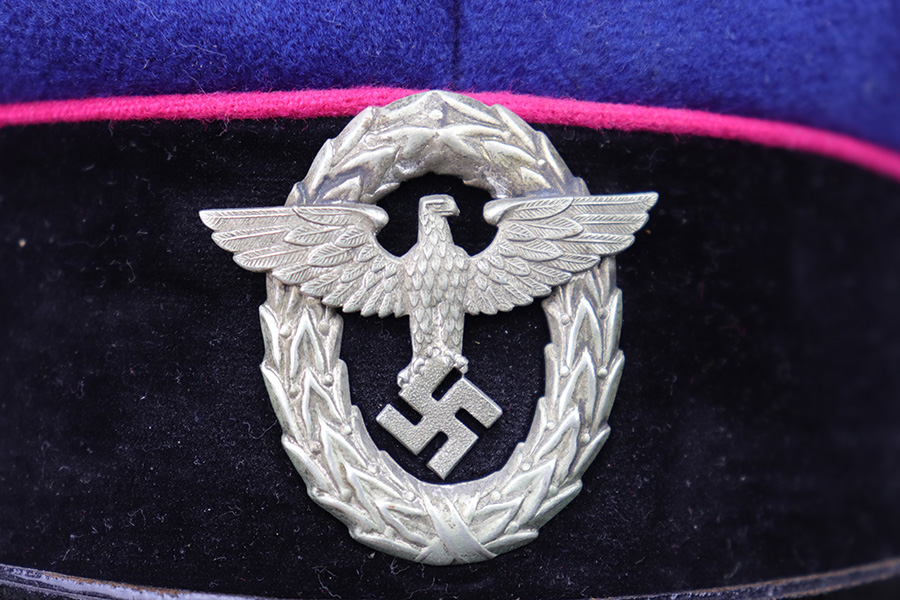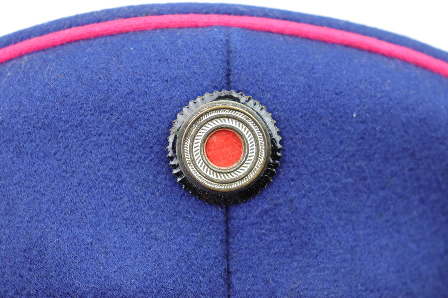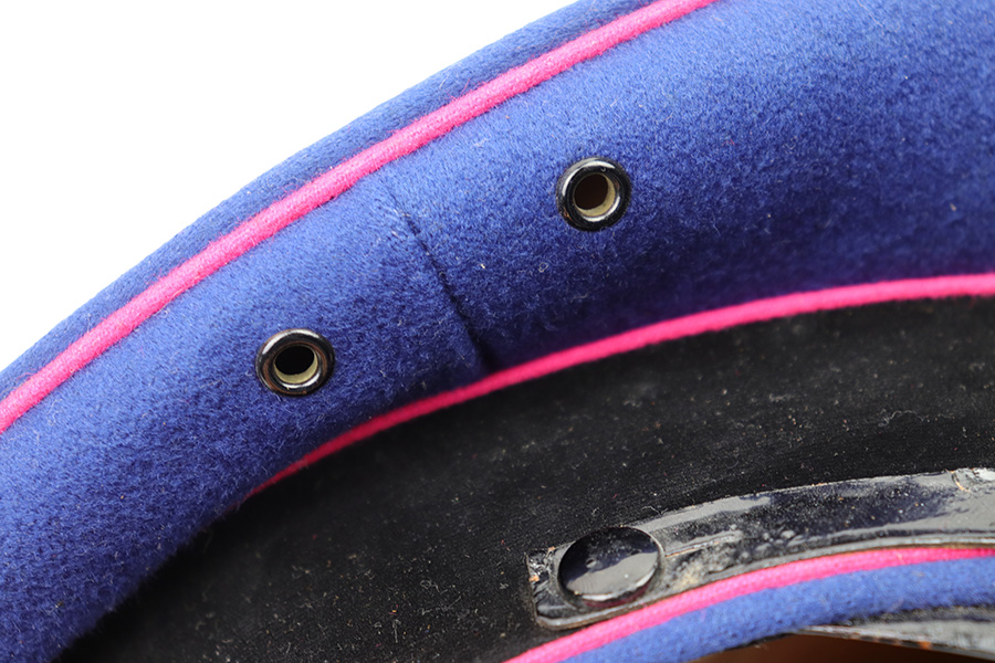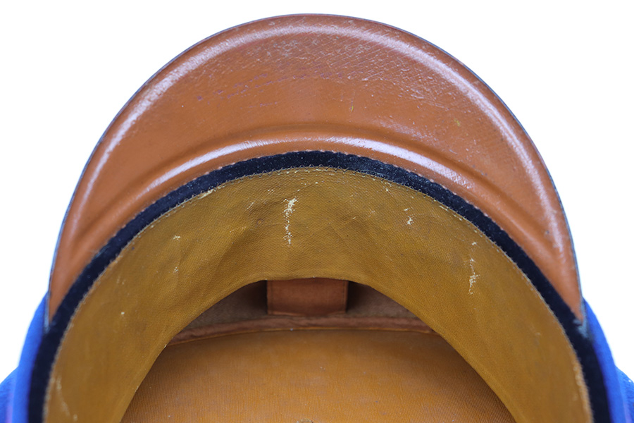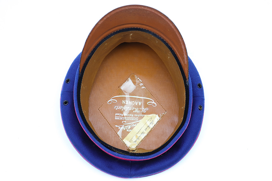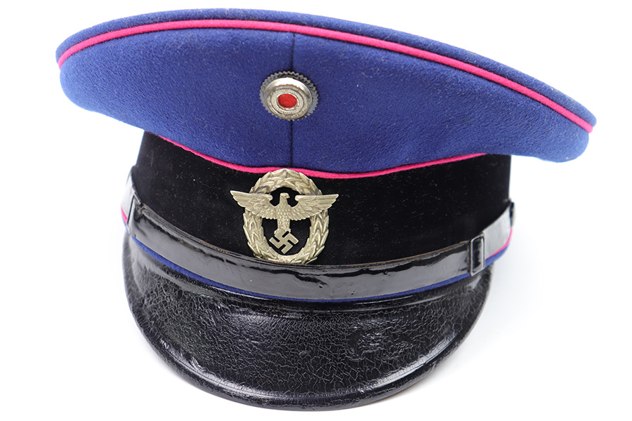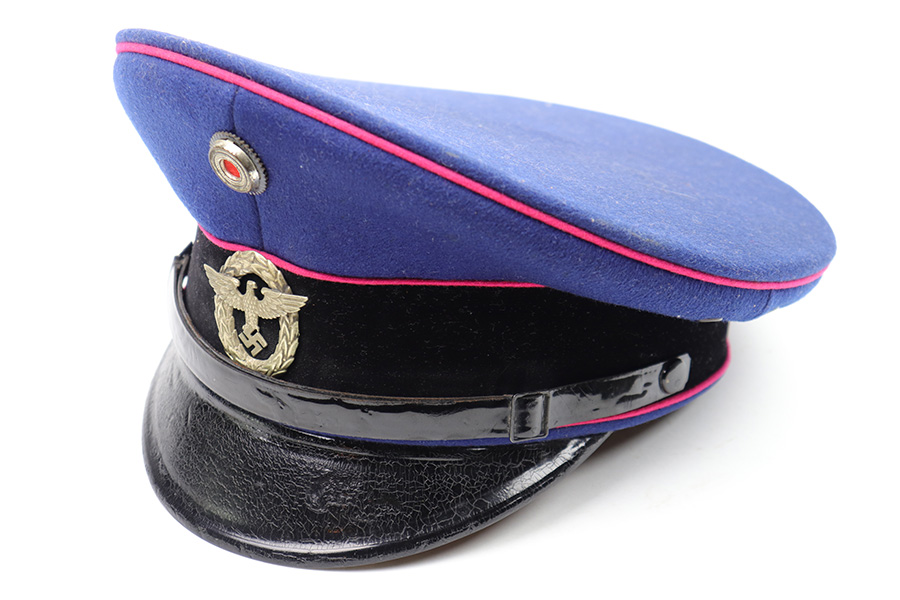 1/25/23 – This is an original WW2 German Fire Police Visor Cap. This example is in excellent overall condition with very clean blue wool exterior that has no holes or issues. The pink colored piping is excellent throughout as well. The front of the visor features an early style insignia and cockade. The original leather chinstrap is still attached and in great condition. The visor has some mild surface cracking as shown. The interior is very clean with some mild scuffing and surface wear on the leather. An original size 56 tag is still attached as shown.