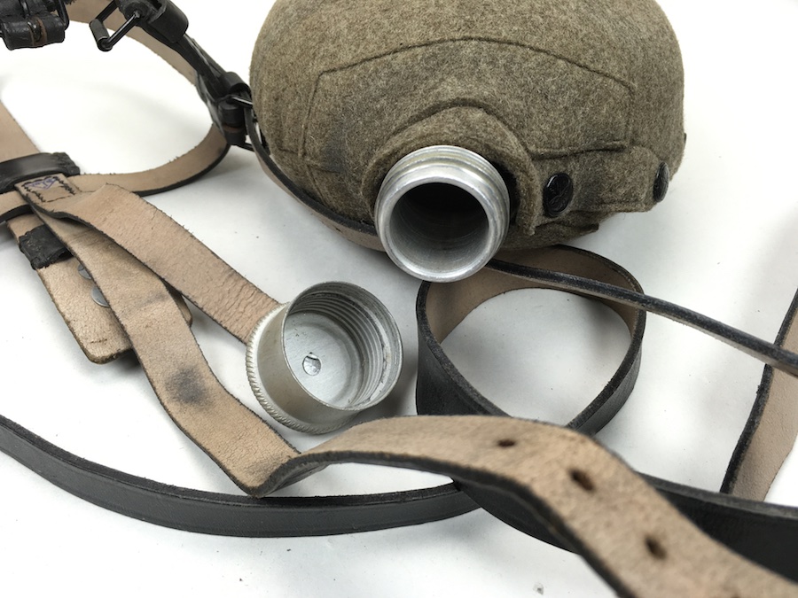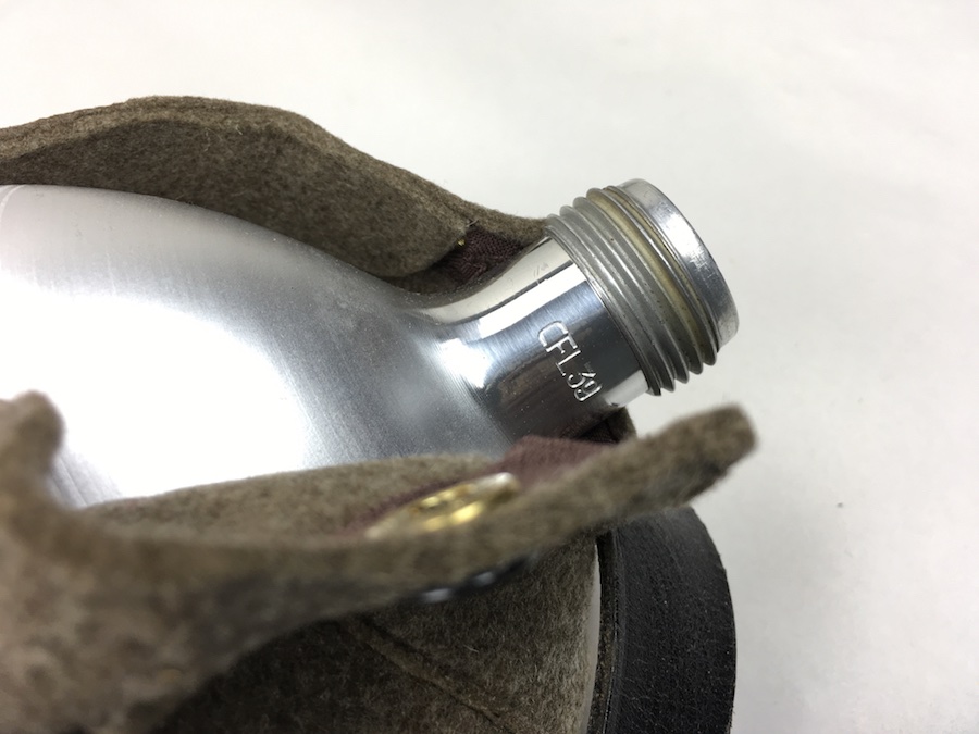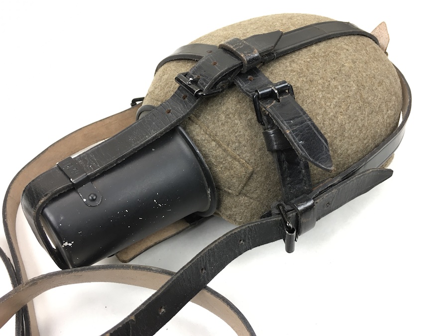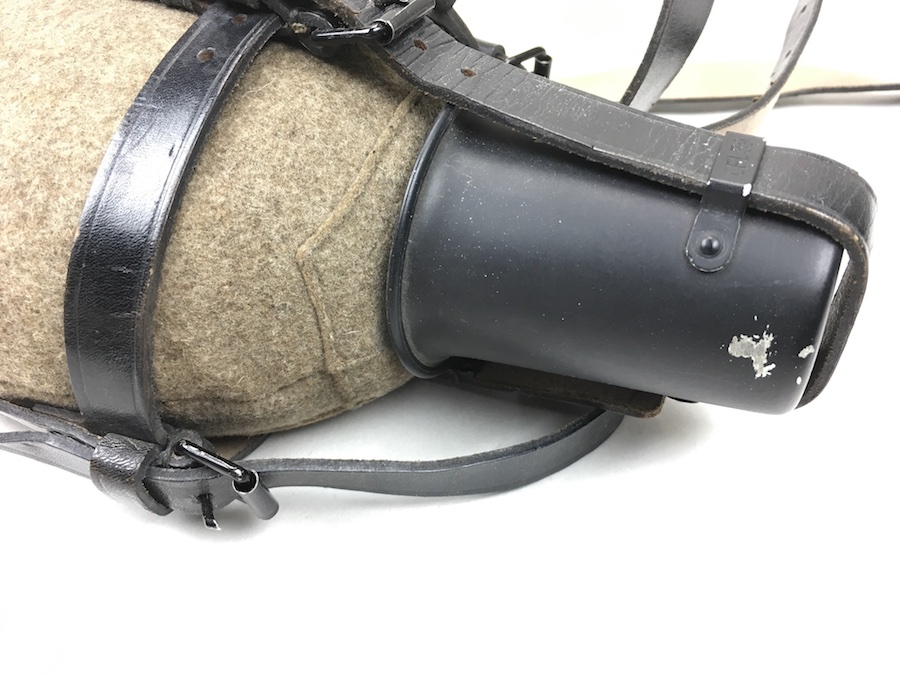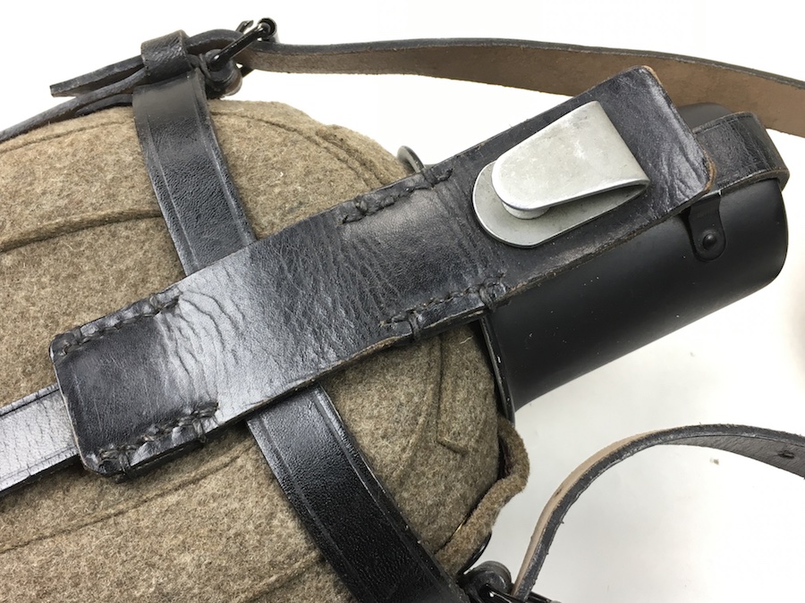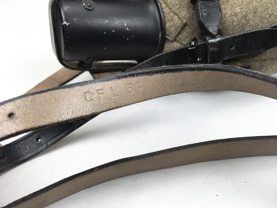 6/12/19 – This is an original and mint condition, 1939 dated German canteen from early WW2. The canteen comes with the original wool cover and leather harness. The harness has an aluminum cup attached, stamped “CFL 39”. Very small area of missing paint. The harness is also stamped “CFL 39” with various internal ink stamps as the photos show. All stitching and buckles are secure. The canteen cap and neck is stamped “CFL 39”. There are no dents in the canteen and is very clean. The wool is excellent with ink stamps under the closure flap. This item appears un-issued.
