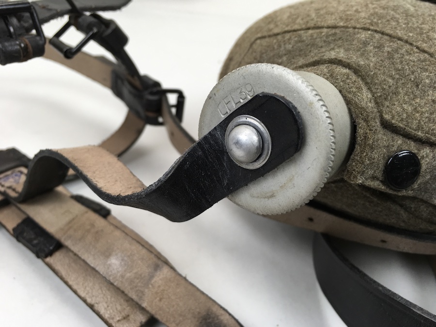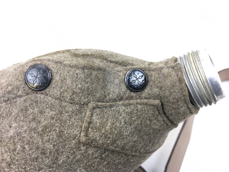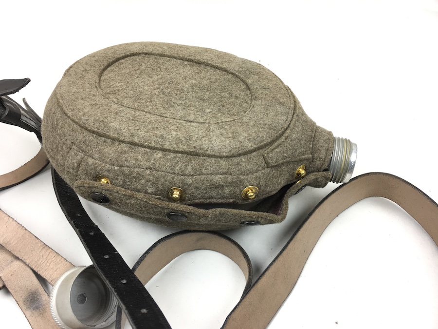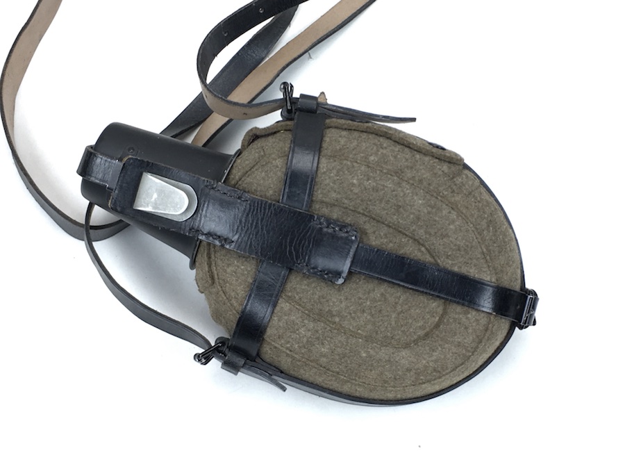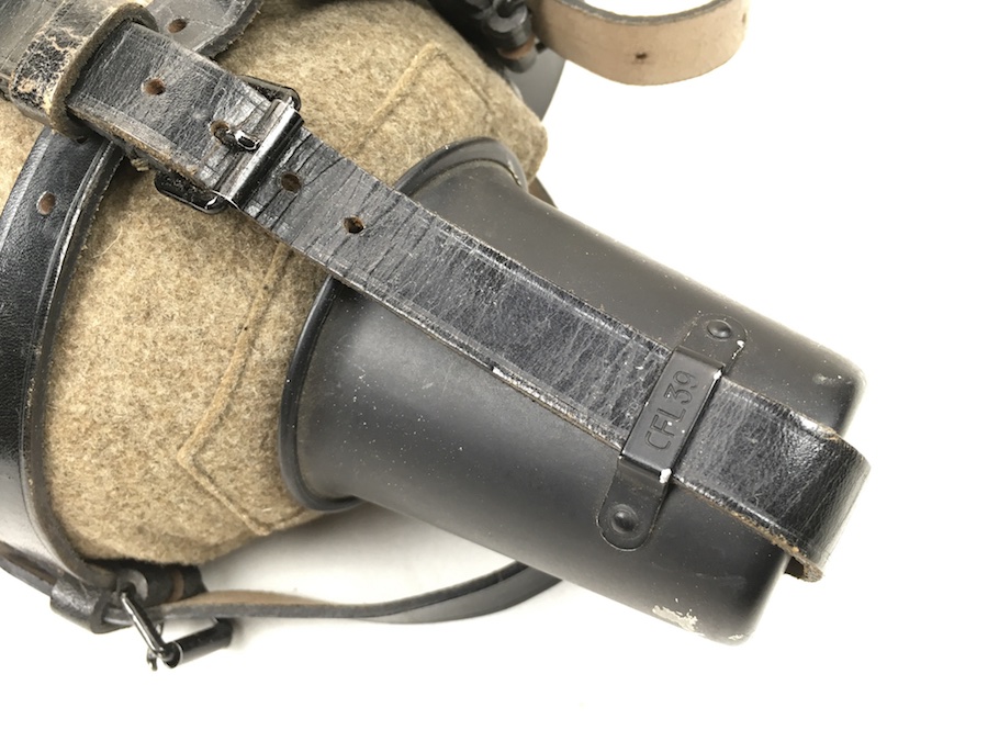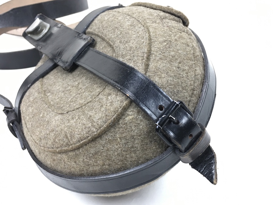 6/12/19 – This is an original and mint condition, 1939 dated German canteen from early WW2. The canteen comes with the original wool cover and leather harness. The harness has an aluminum cup attached, stamped “CFL 39”. Very small area of missing paint. The harness is also stamped “CFL 39” with various internal ink stamps as the photos show. All stitching and buckles are secure. The canteen cap and neck is stamped “CFL 39”. There are no dents in the canteen and is very clean. The wool is excellent with ink stamps under the closure flap. This item appears un-issued.