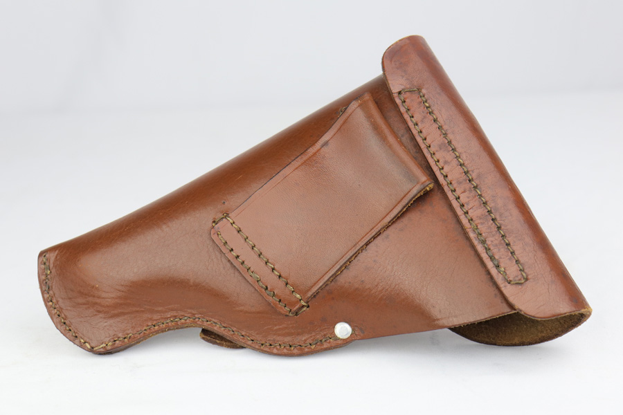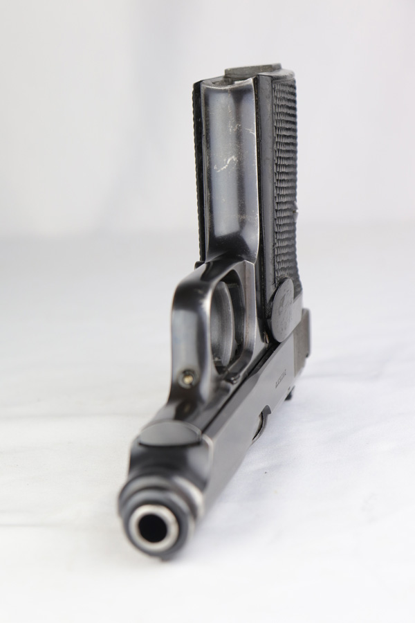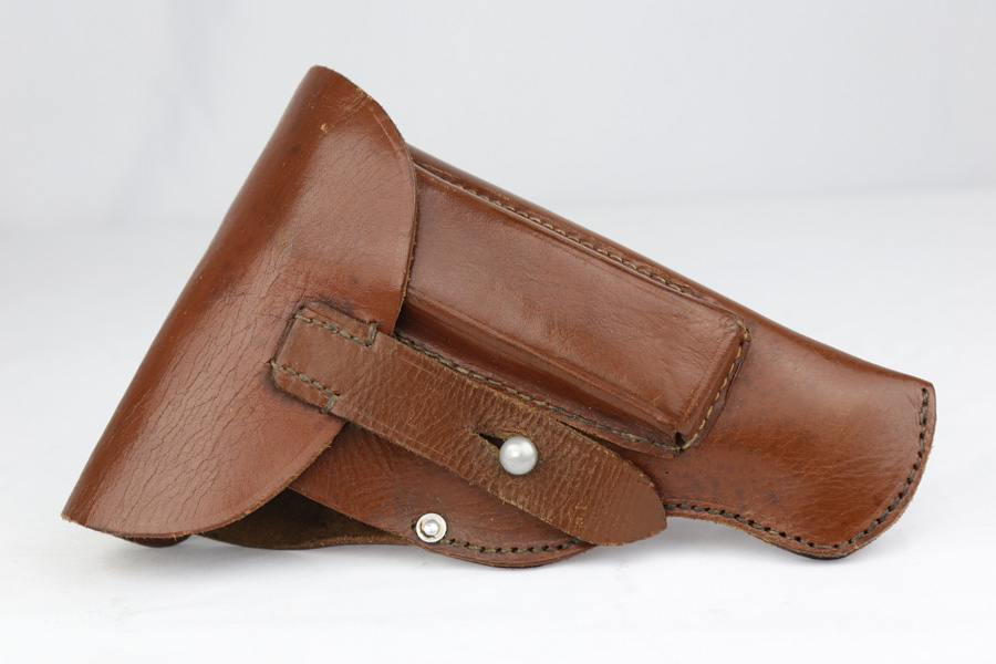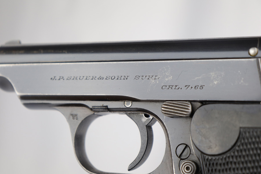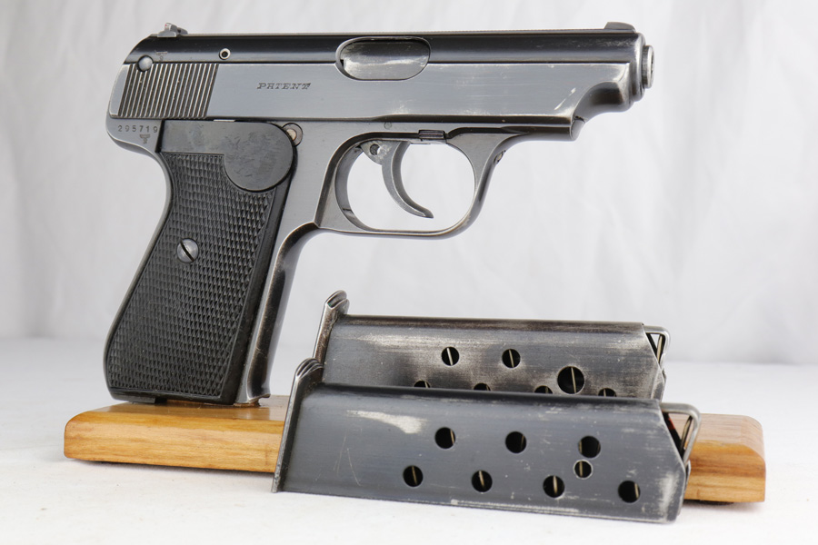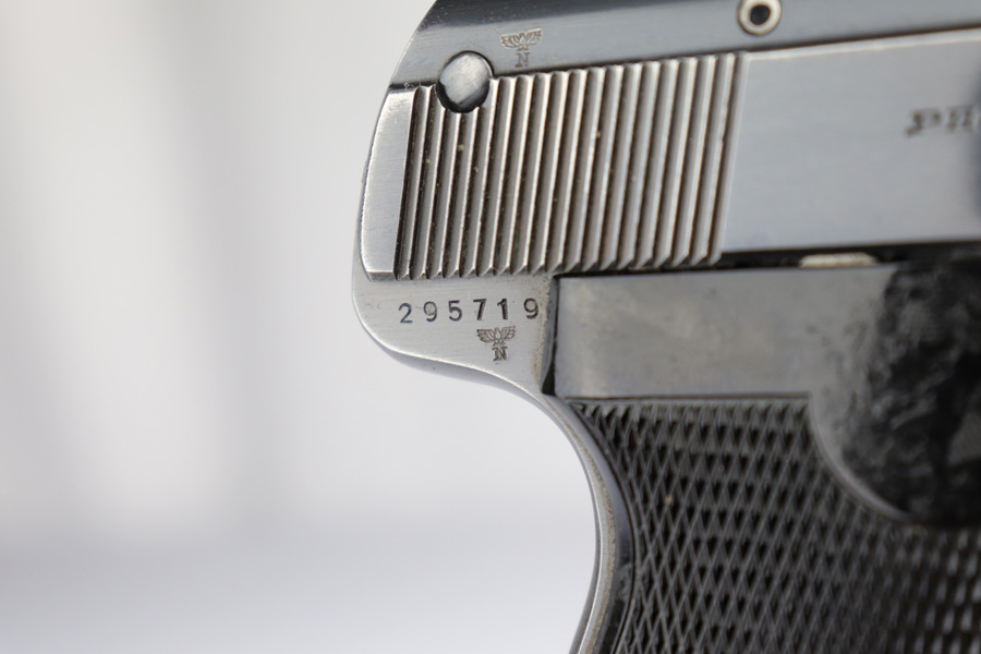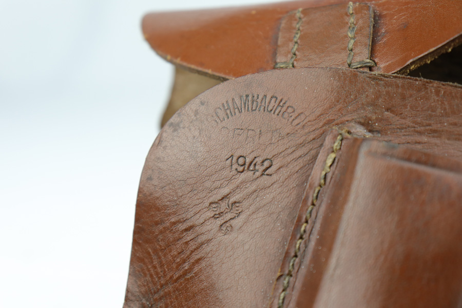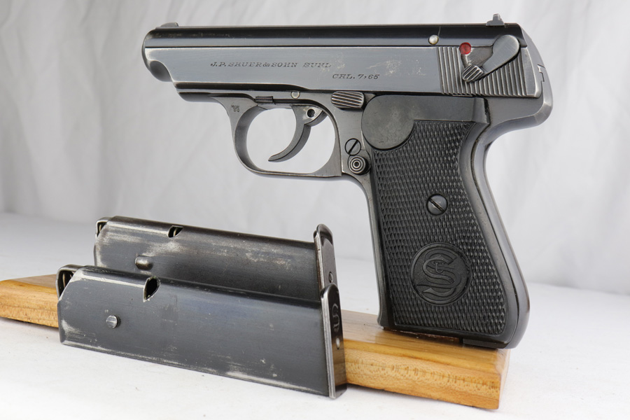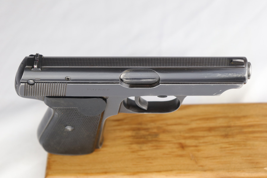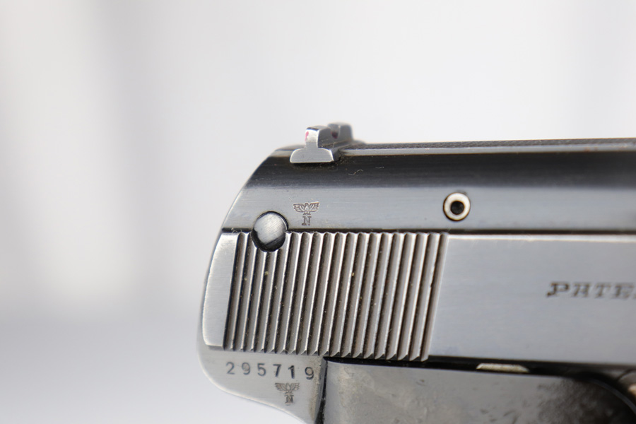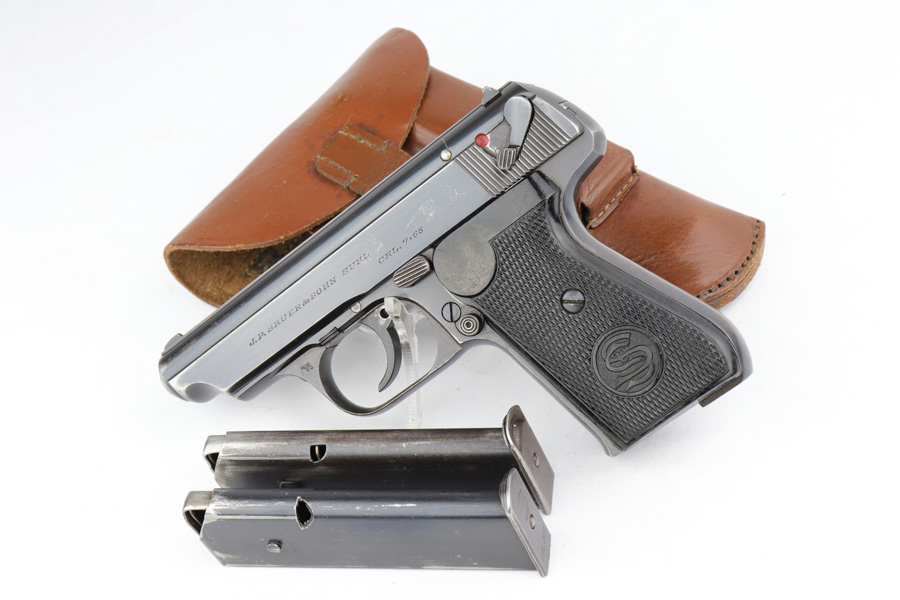 3/19/19 – This is an early, 1st variation Police high polish eagle/c stamped Sauer 38h. Approximately 30,000 of this variation were produced. The pistol has about 90-92% original finish in tact with finish loss on the muzzle and straps. The right side of the slide has thinning between the ejection port and muzzle, the reverse side has light surface scratches / bluing loss near the legend. Minty bore is 10/10. Original grips, and comes with two magazines, as well as a 1942 dated police holster. One magazine has early bottom, other is later with half-moon.