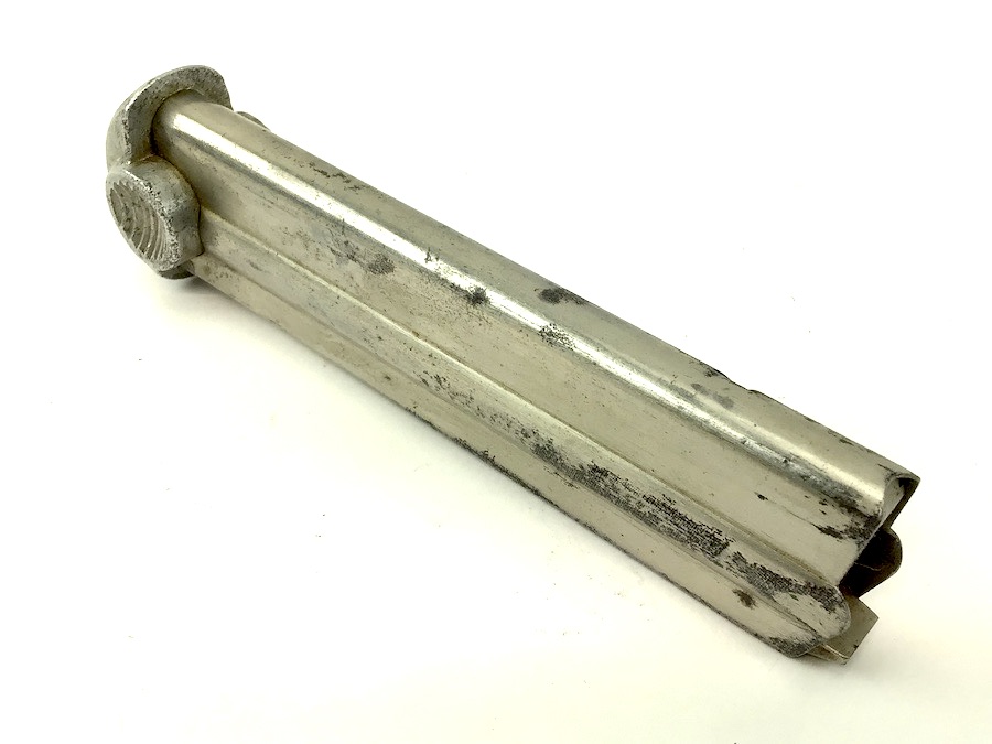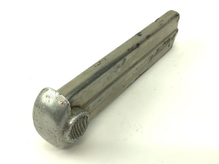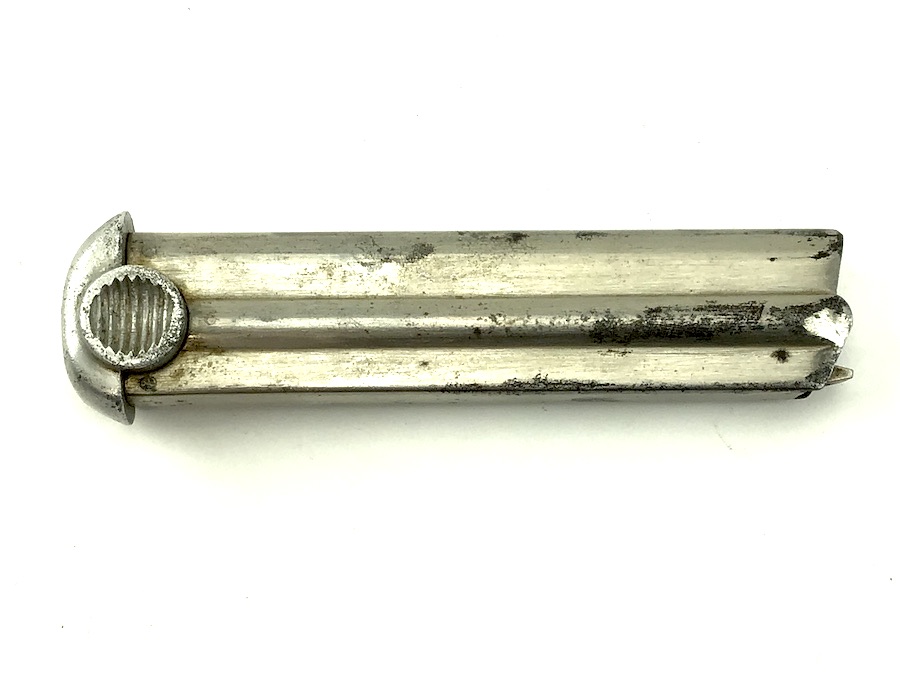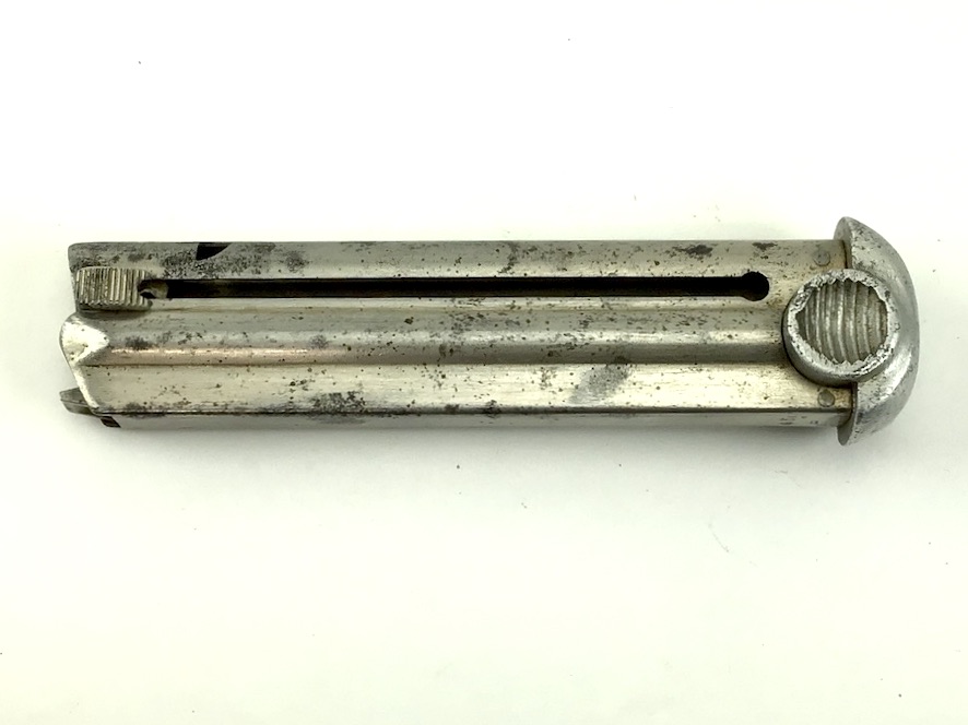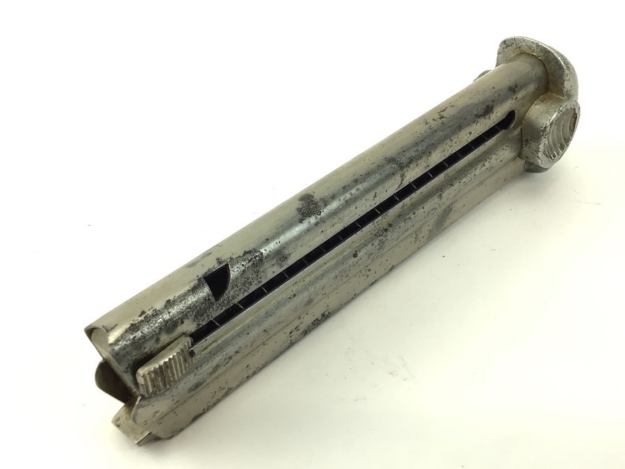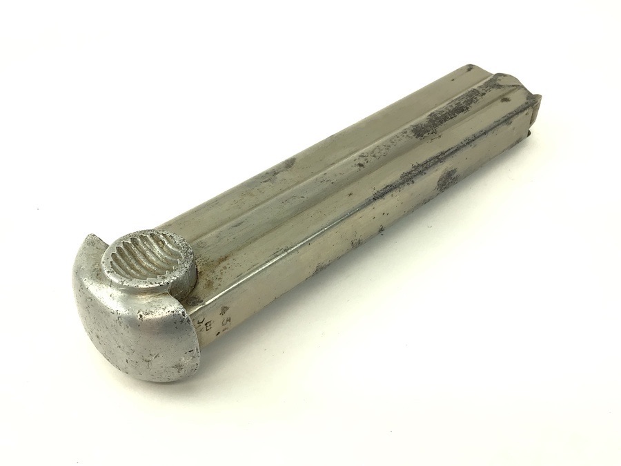 7/21/22 – This is an earlier / pre WW2 style T14 Nambu magazine. The magazine has a nickeled tube that’s in very good condition. There’s only minor discoloration – as shown in photos. No pitting. The spring is strong and fully functional. The spine of the magazine has serial number “437”. This magazine is in great overall condition.