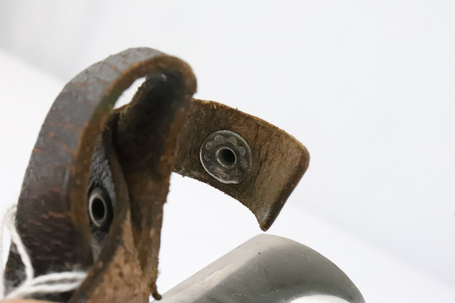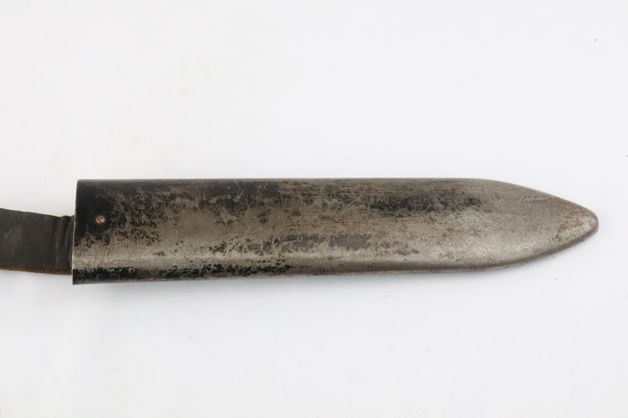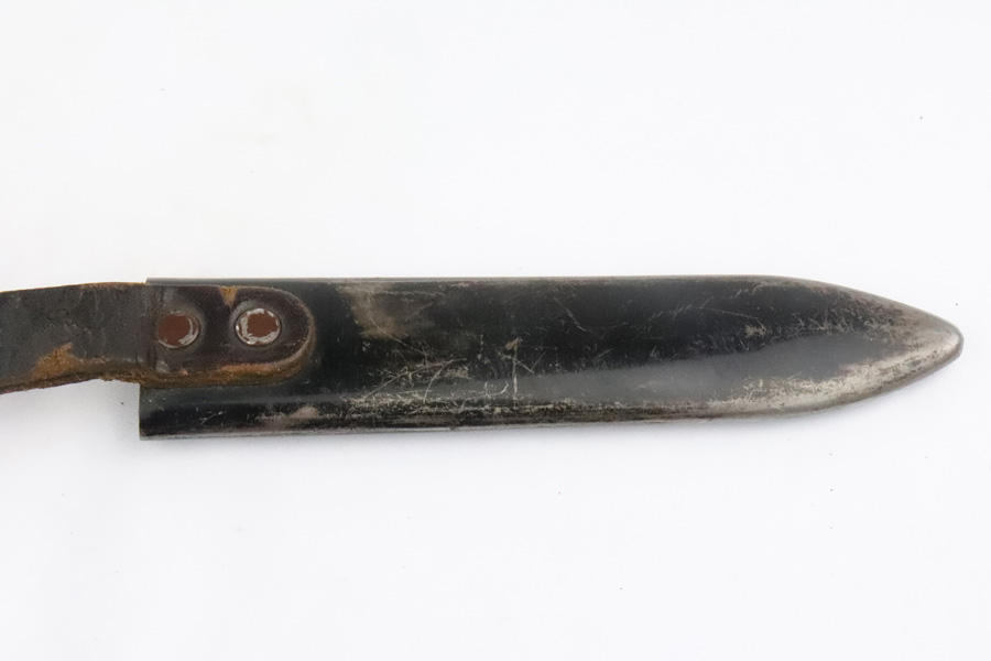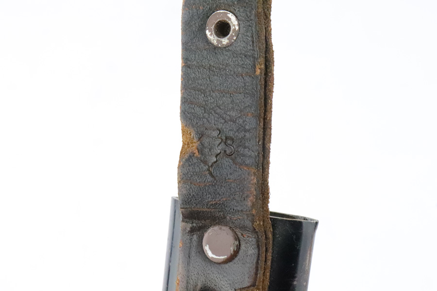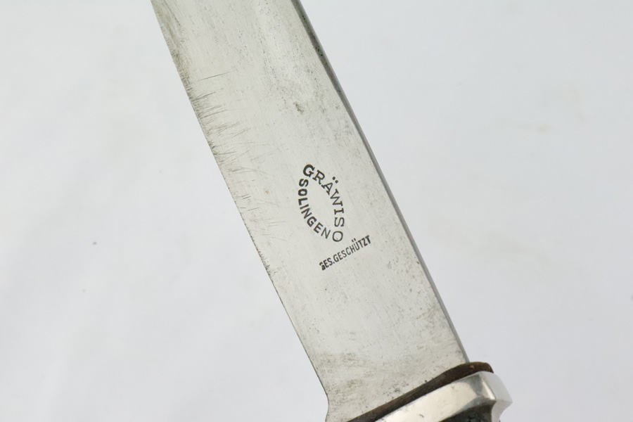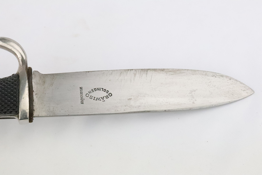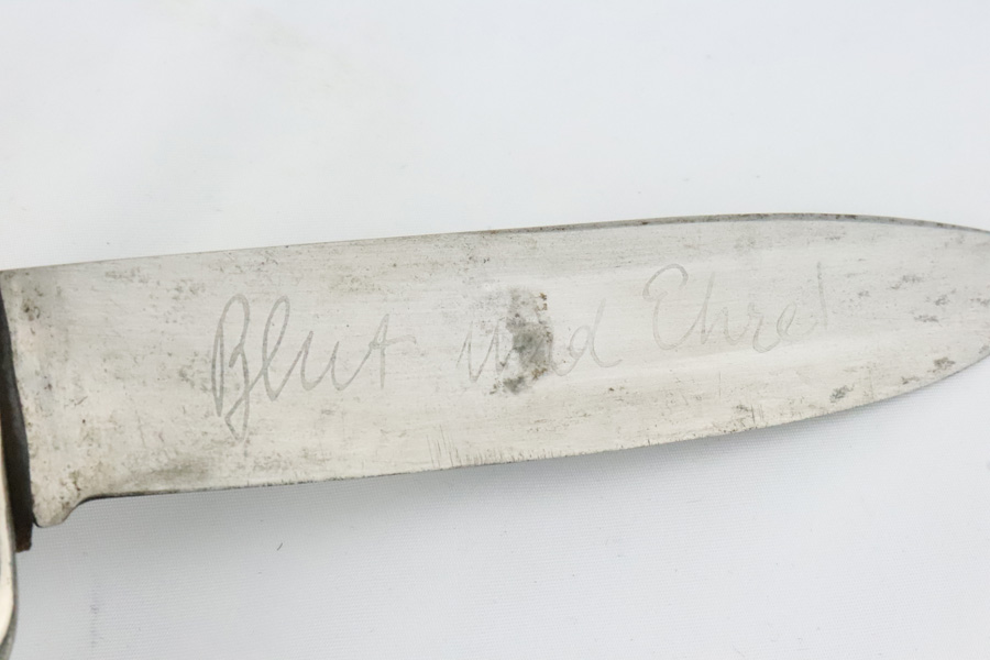 4/9/19 – This is an original, early variation DJ knife, or Hitler Youth knife as we like to call it. The blade is inscribed with the “Blood and honor” inscription on one side. This inscription is fairly faint as the blade has aged and shows light signs of wear throughout. The reverse side of the blade is maker stamped by Grawiso. The leather stopper is still in tact. The handle is in excellent condition. The paint of the scabbard is mostly worn off but there are no dents in the scabbard. The leather frog is in tact and original as well. There is a light what may be an oak leaf next to an “S” on the frog. See photos.