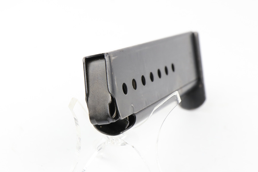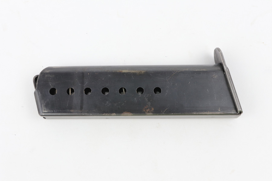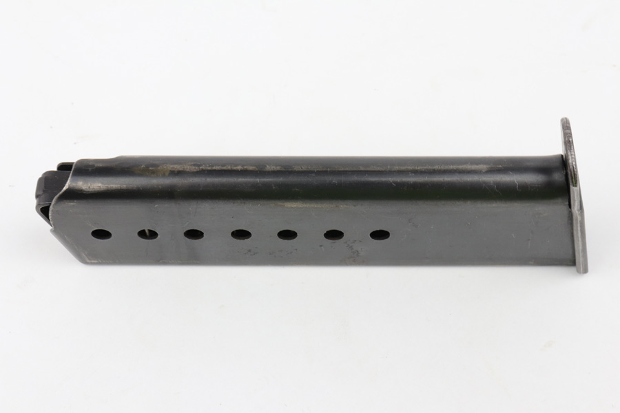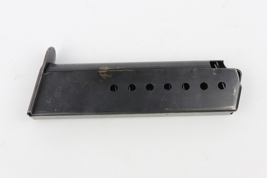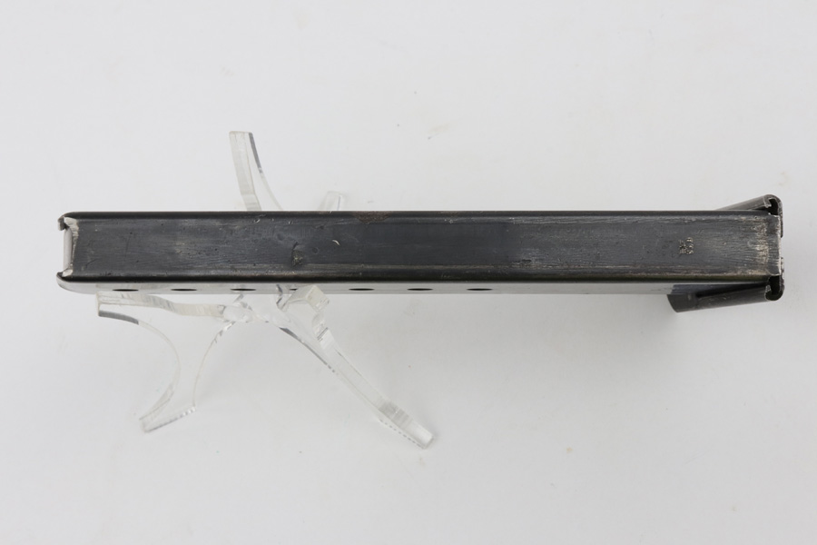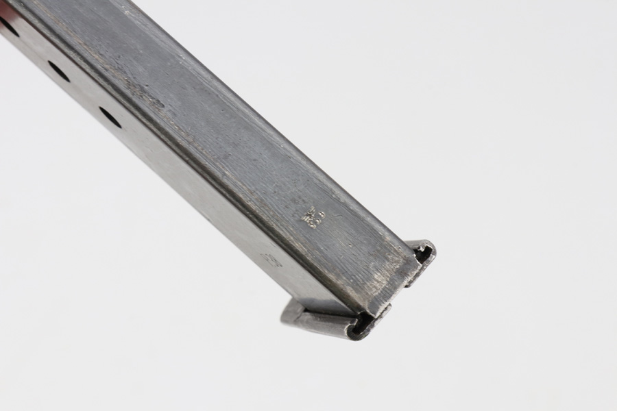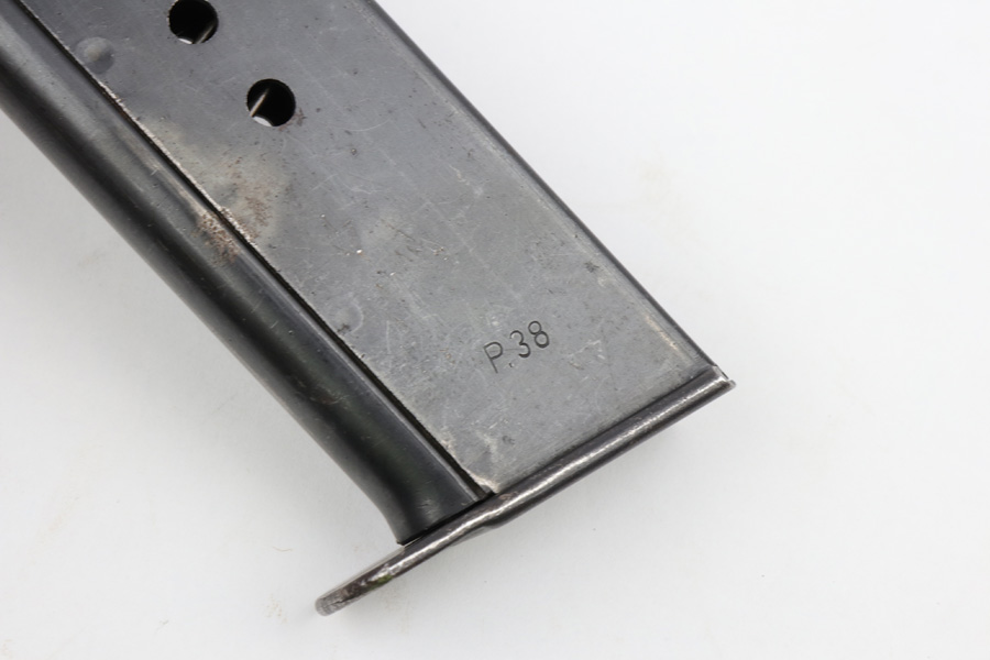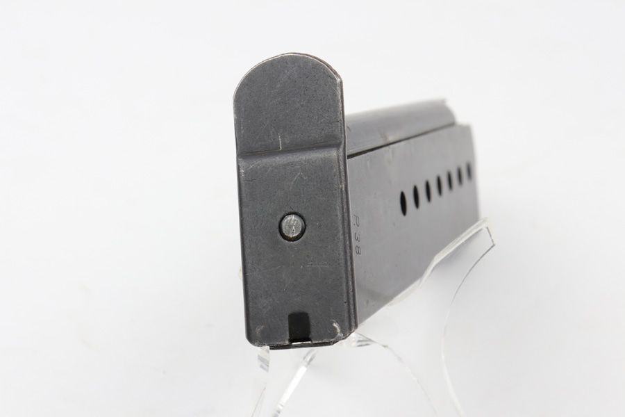 3/20/20 – This is an original Walther P.38 magazine from early WW2. The magazine has two eagle/359 proof stamps on the spine, as well as a “P.38” stamp on the left side of the tube. These are early and desirable features seen on P.38s up until 1942. The magazine is in great condition with some light discoloration in areas, but no rust or pitting and a majority of the bluing in tact. Strong, fully functional spring.