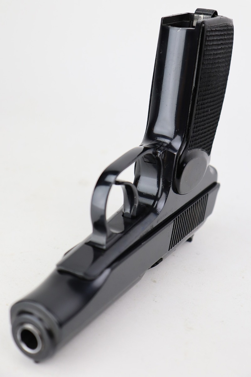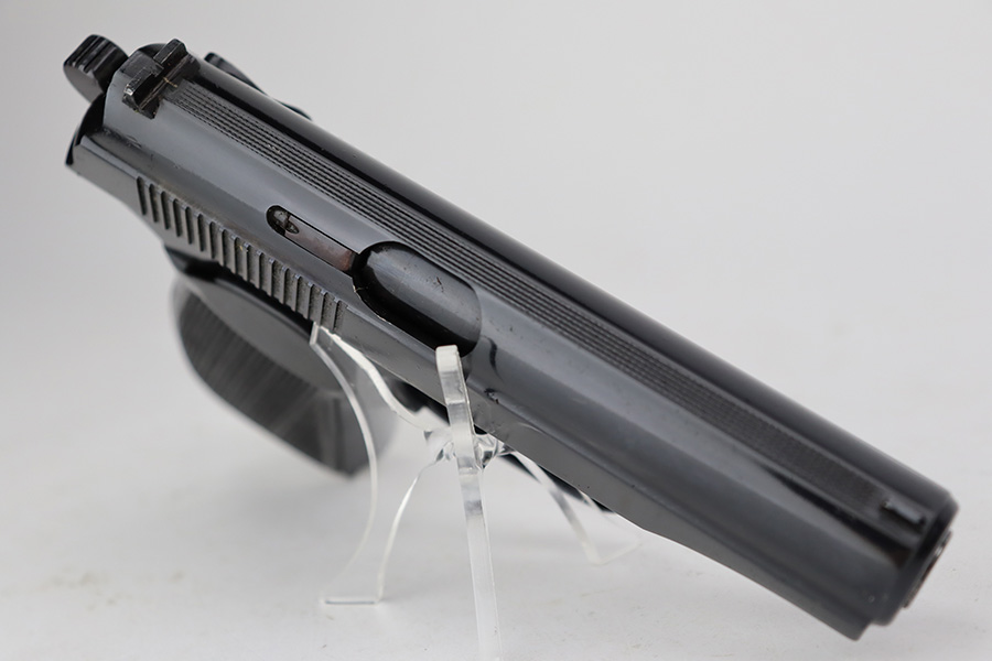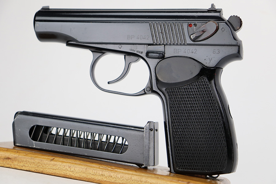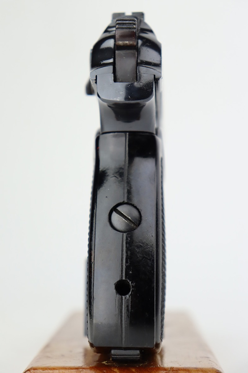 7/26/23 – This is a minty example of a Makarov PM made in East Germany in 1963. It is all matching but has an import mark on the right side of the frame. It has retained 98-99% of its high polish finish with only very minor holster wear on the slide and a few minuscule surface scratches on the front strap. Fitted with nice black bakelite grips. Comes with two proper magazines, though they are mismatched to this pistol. Includes an original Makarov holster that looks near-new. Mint bore.