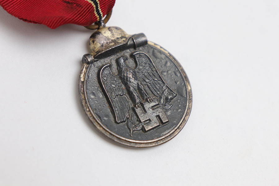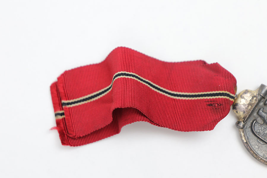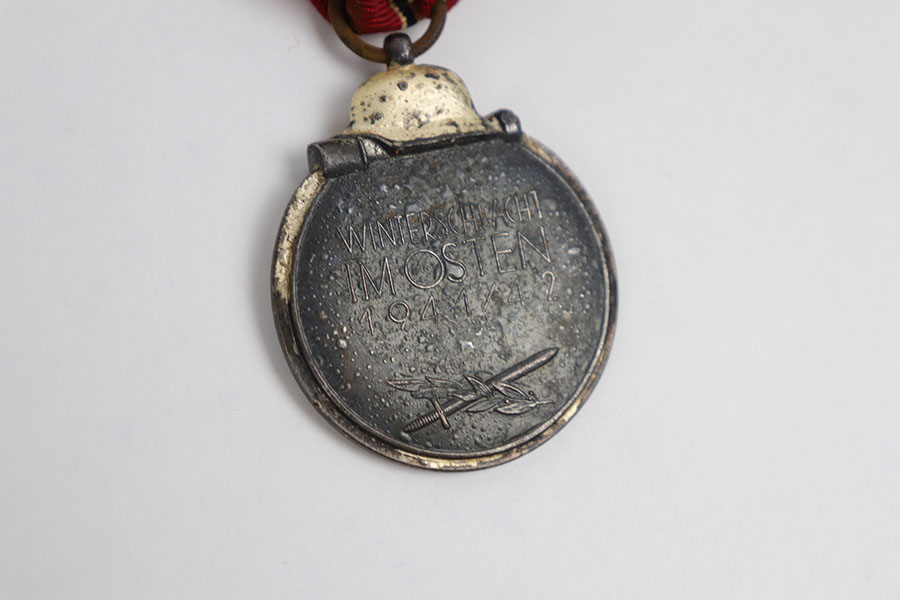 1/8/21 – This is an original Eastern Front medal with ribbon. The medal has some normal aging wear and there’s discoloration on the helmet and around the outer rim. The ribbon is in great overall condition. The reverse is marked “Winterschlacht im osten 1941/42”.