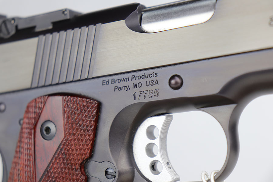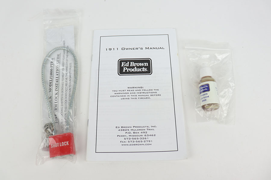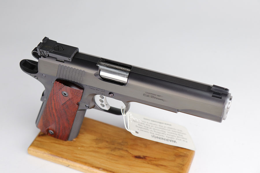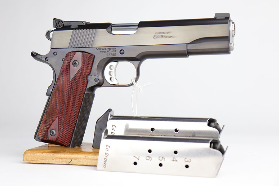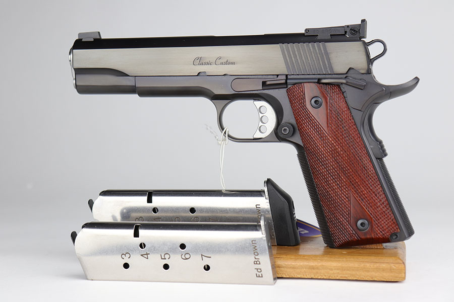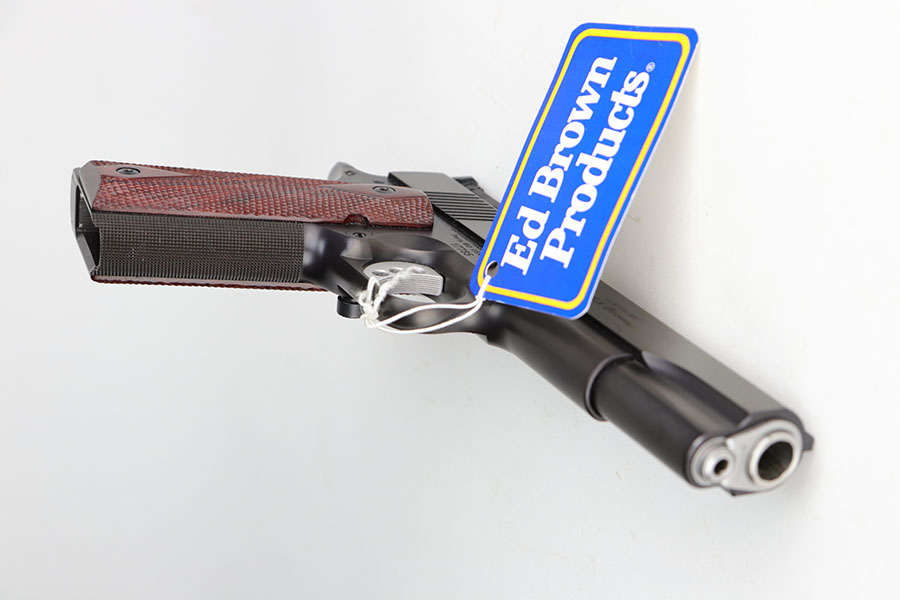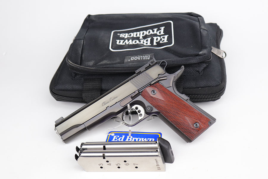 12/1/20 – This is a like-new Ed Brown 1911 Classic Custom Pistol, chambered in .45 ACP. The gun comes with the original soft carrying case, manual, two magazine (one is a finger-extension), gun lock, and oil. The gun is in like-new condition with no apparent signs of wear. The bore is mint – appears that it may have never been fired.
