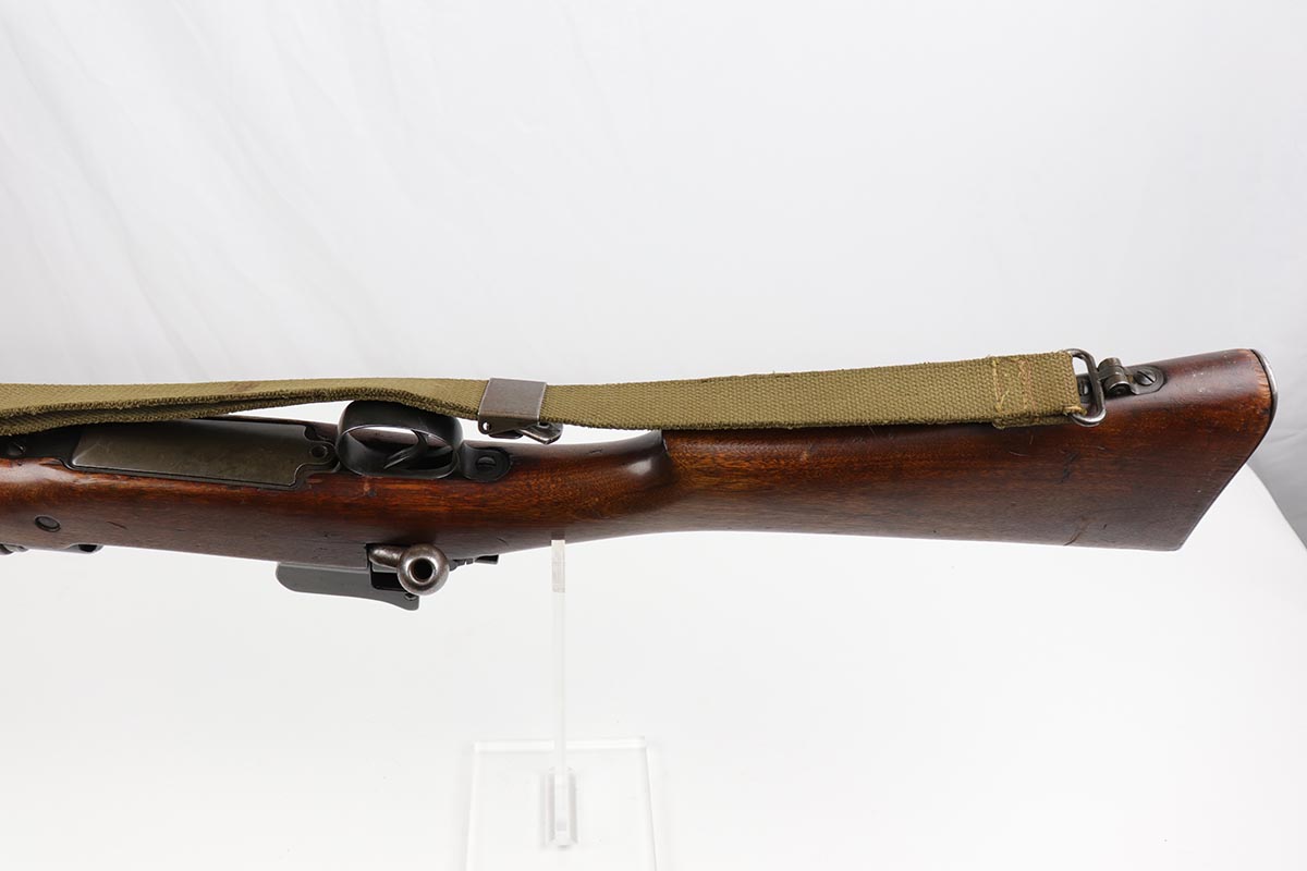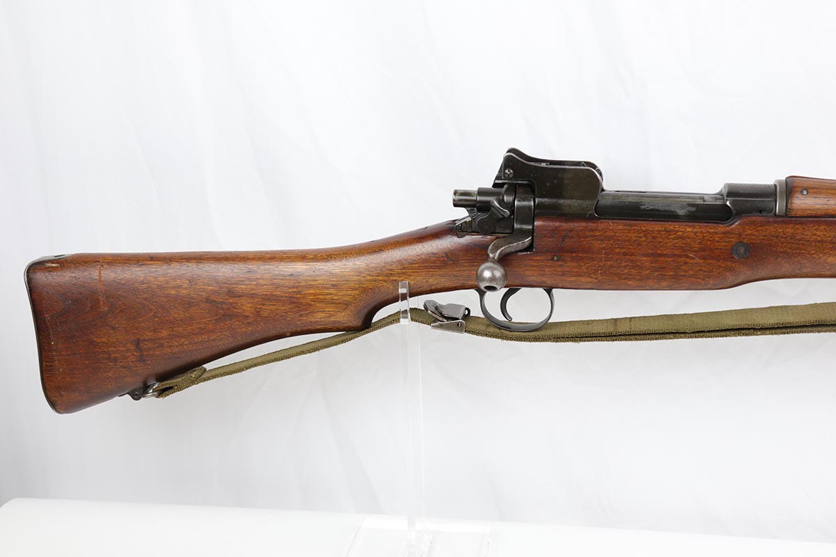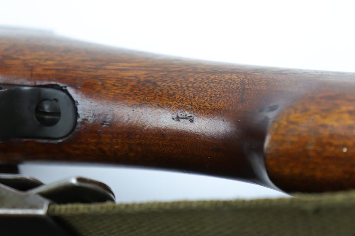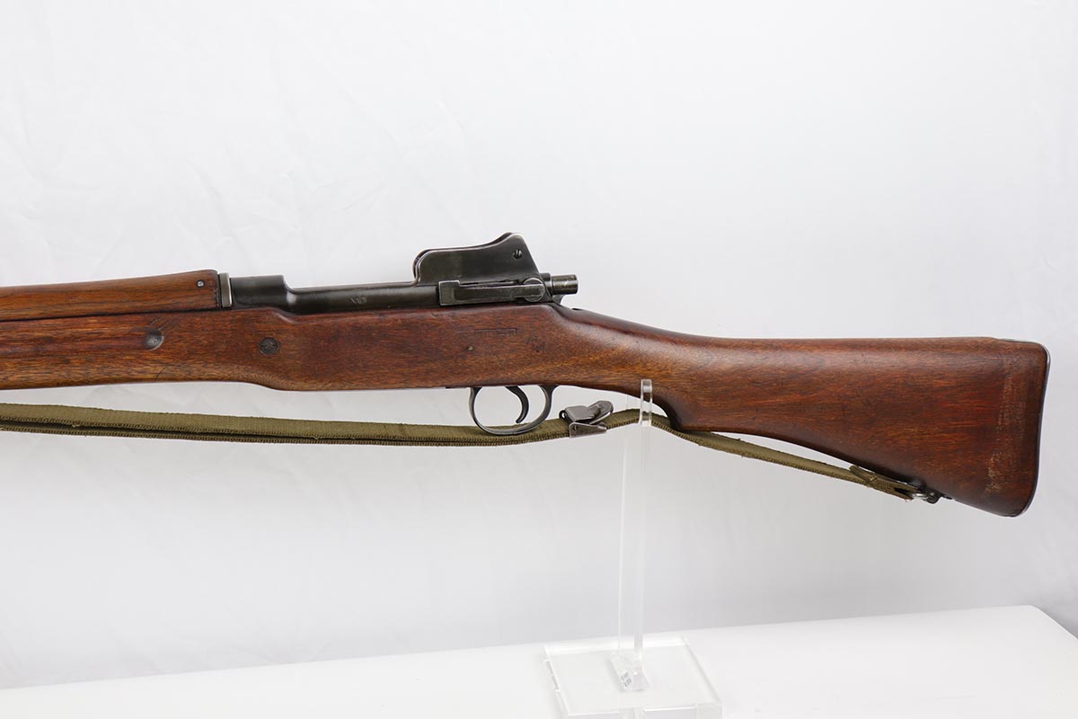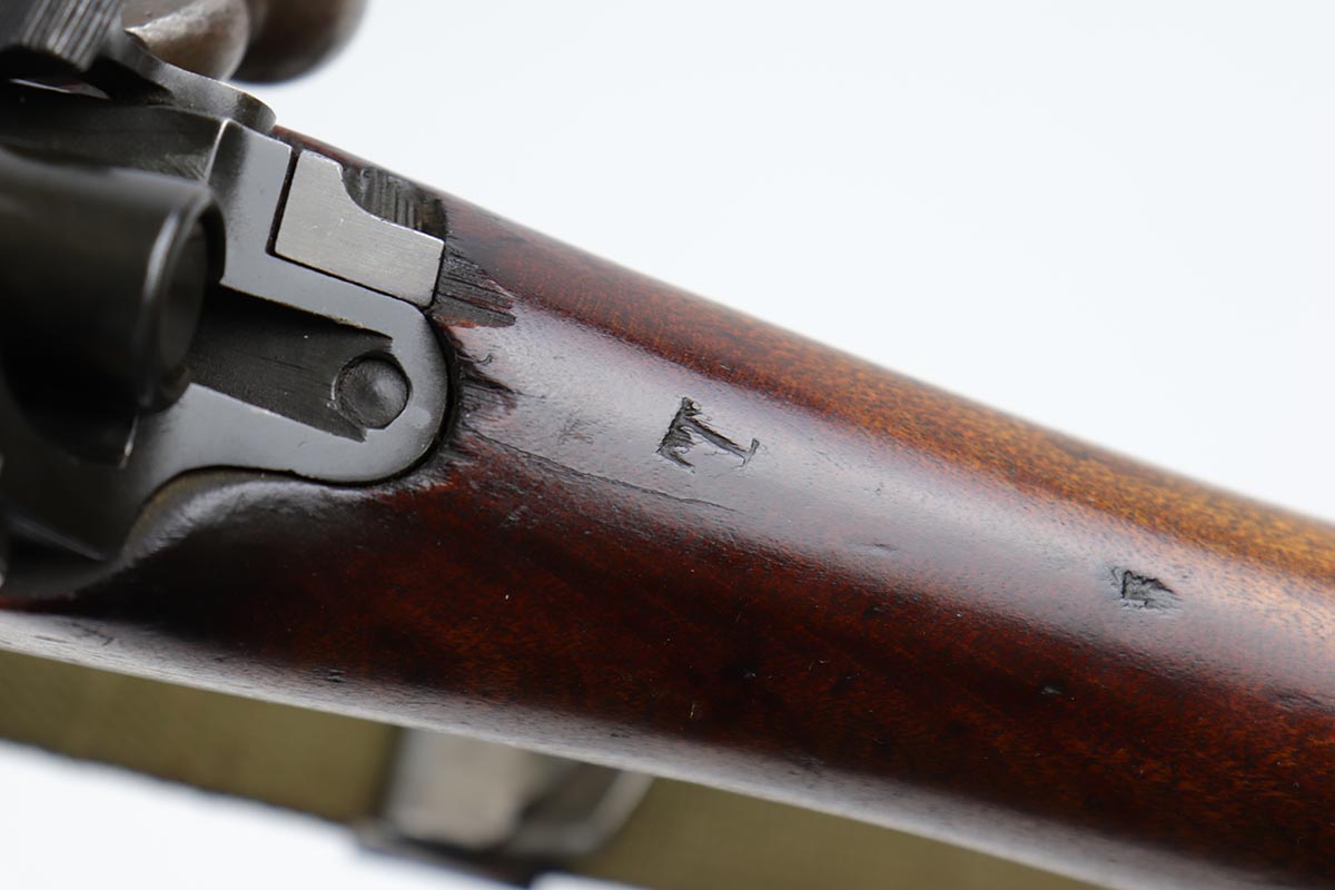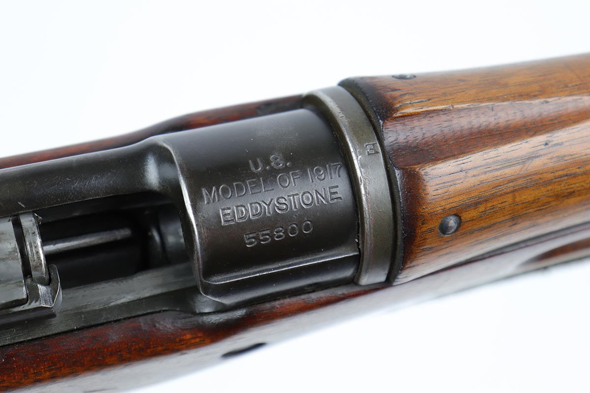 5/23/19 – This is a nice example of an Eddystone Model 1917 rifle. When the U.S. entered the Great War, it had a strong and urgent need to rifles to supply their military. The Springfield Armory had delivered approximately 843,000 M1903 Springfield rifles, but due to the difficulties in production, rather than re-tool the Pattern 14 factories to produce the standard U.S. rifle, the M1903 Springfield, it was realized that it would be much quicker to adapt the British design. The design was then modified to use the U.S. preferred .30-06 to simplify ammunition logistics. Eddystone would produced over 1,000,000 Model 1917 rifles over the course of the next few years. This particular rifle shows minor finish loss to the receiver and barrel, though it has a general dulling and some browning to the color. Some notable thinning of the bolt handle, buttplate and trigger housing assembly. Sharp flaming bomb proof on receiver, bolt and barrel. Barrel also marked ‘JA’. Stock is marked RA-P, and another proof that appears to be ‘3GM-K’ in rectangle. Very nice stock with no major chips or cracks, but a few dings and nicks. There is a minor surface crack behind the receiver, and some notches carved on the underside of the front portion. Bore has decent rifling but notable frost throughout. Original sling.