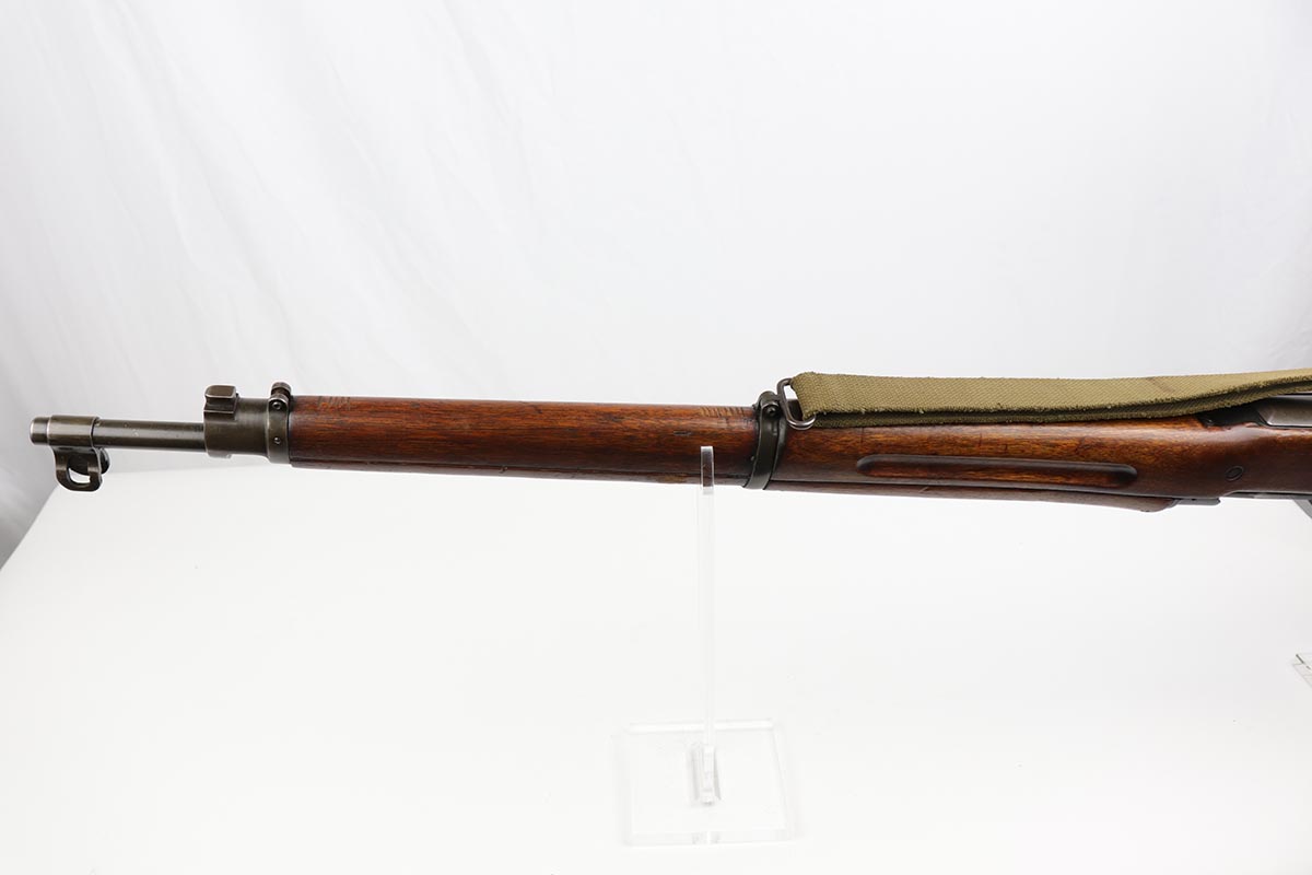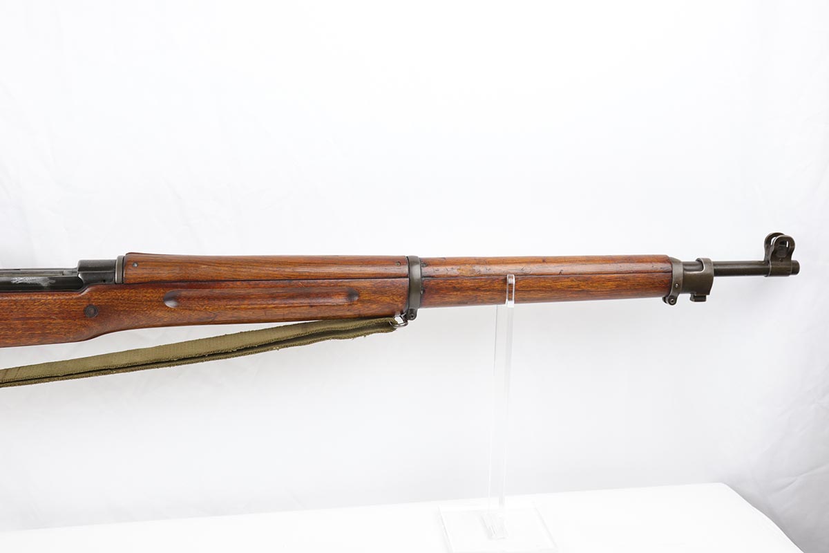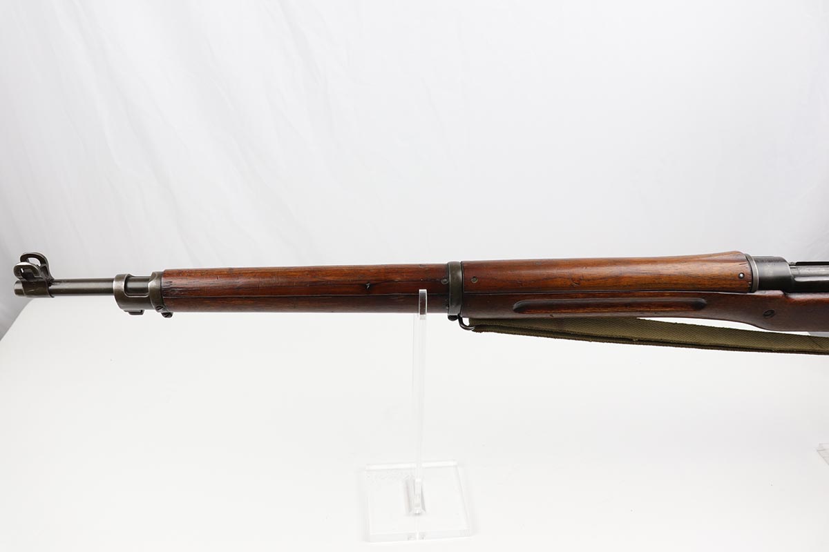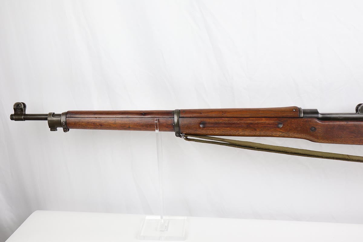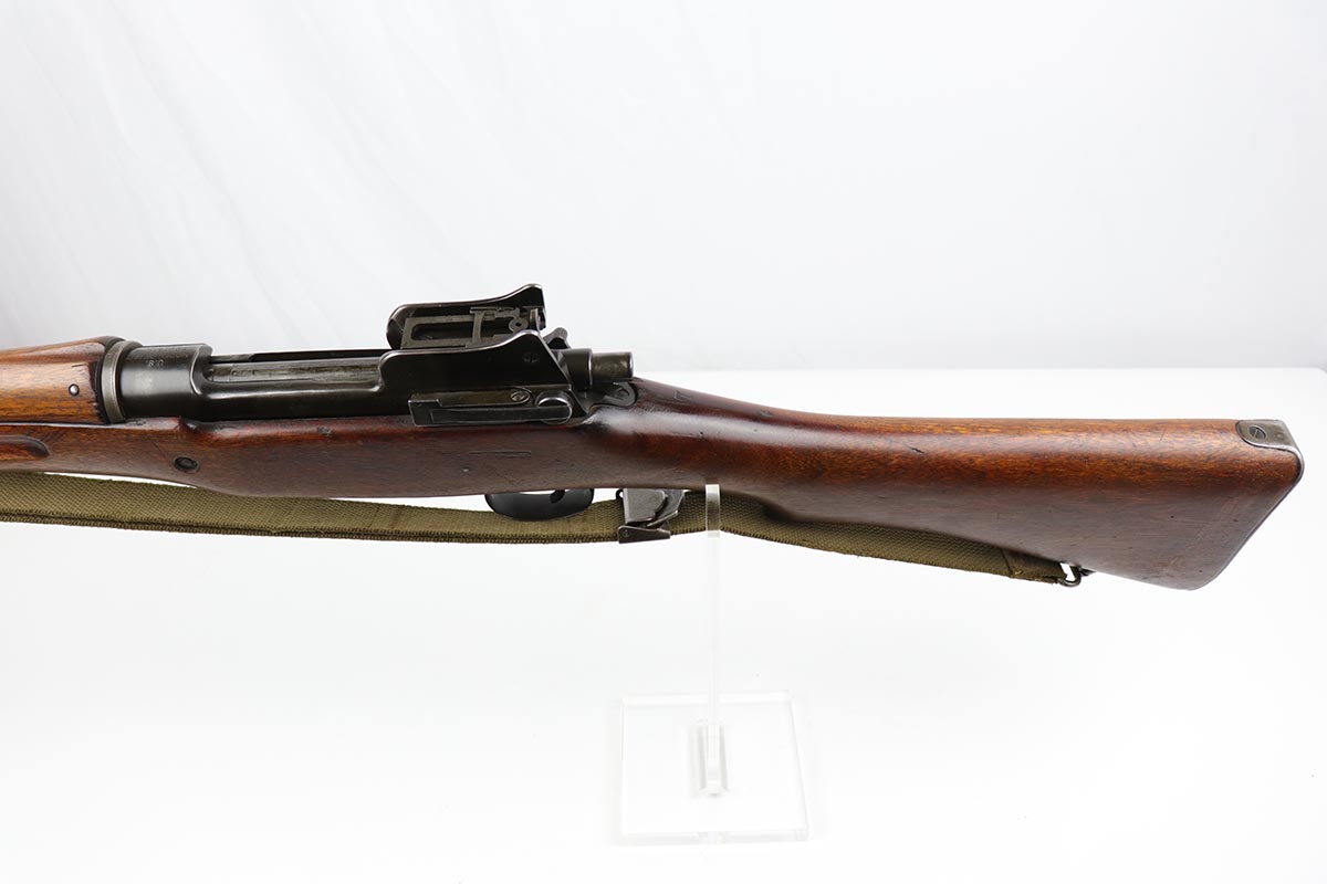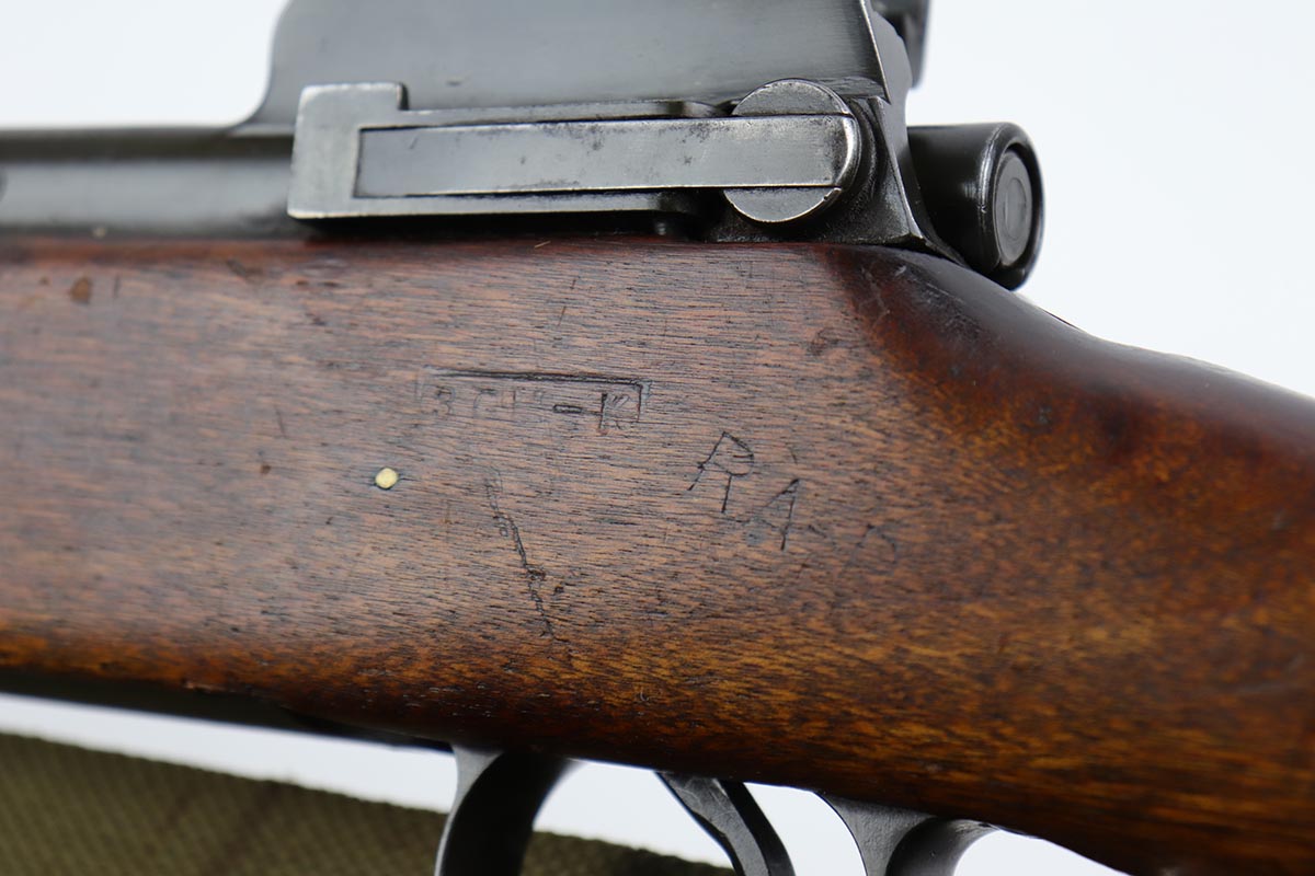 5/23/19 – This is a nice example of an Eddystone Model 1917 rifle. When the U.S. entered the Great War, it had a strong and urgent need to rifles to supply their military. The Springfield Armory had delivered approximately 843,000 M1903 Springfield rifles, but due to the difficulties in production, rather than re-tool the Pattern 14 factories to produce the standard U.S. rifle, the M1903 Springfield, it was realized that it would be much quicker to adapt the British design. The design was then modified to use the U.S. preferred .30-06 to simplify ammunition logistics. Eddystone would produced over 1,000,000 Model 1917 rifles over the course of the next few years. This particular rifle shows minor finish loss to the receiver and barrel, though it has a general dulling and some browning to the color. Some notable thinning of the bolt handle, buttplate and trigger housing assembly. Sharp flaming bomb proof on receiver, bolt and barrel. Barrel also marked ‘JA’. Stock is marked RA-P, and another proof that appears to be ‘3GM-K’ in rectangle. Very nice stock with no major chips or cracks, but a few dings and nicks. There is a minor surface crack behind the receiver, and some notches carved on the underside of the front portion. Bore has decent rifling but notable frost throughout. Original sling.