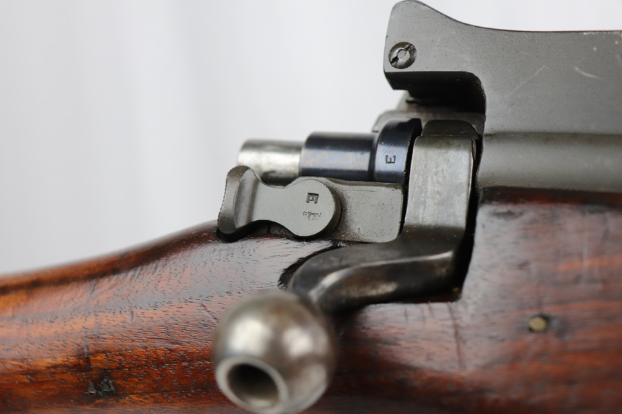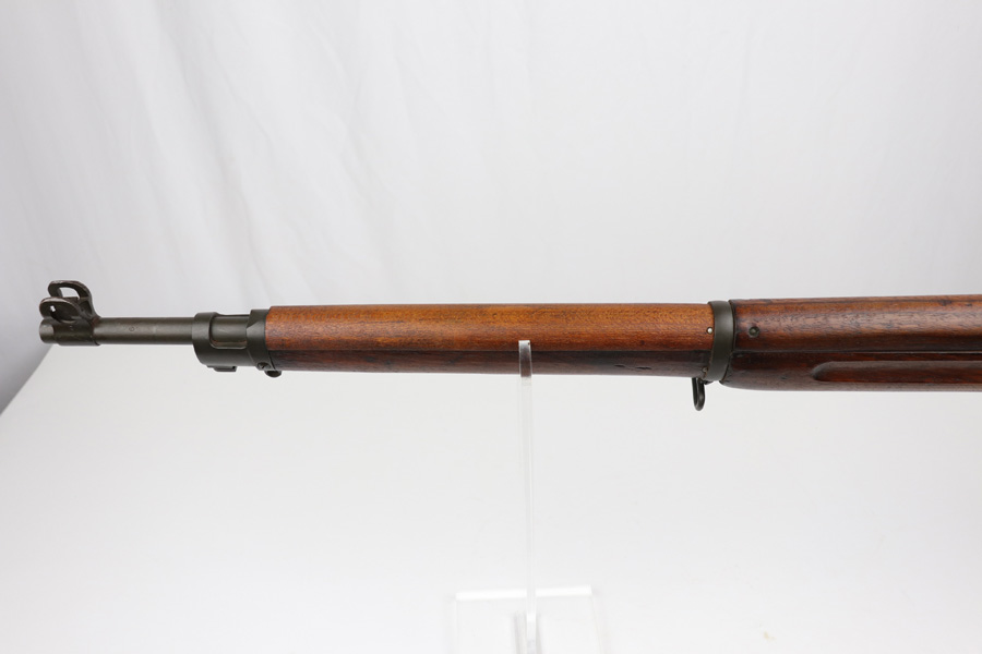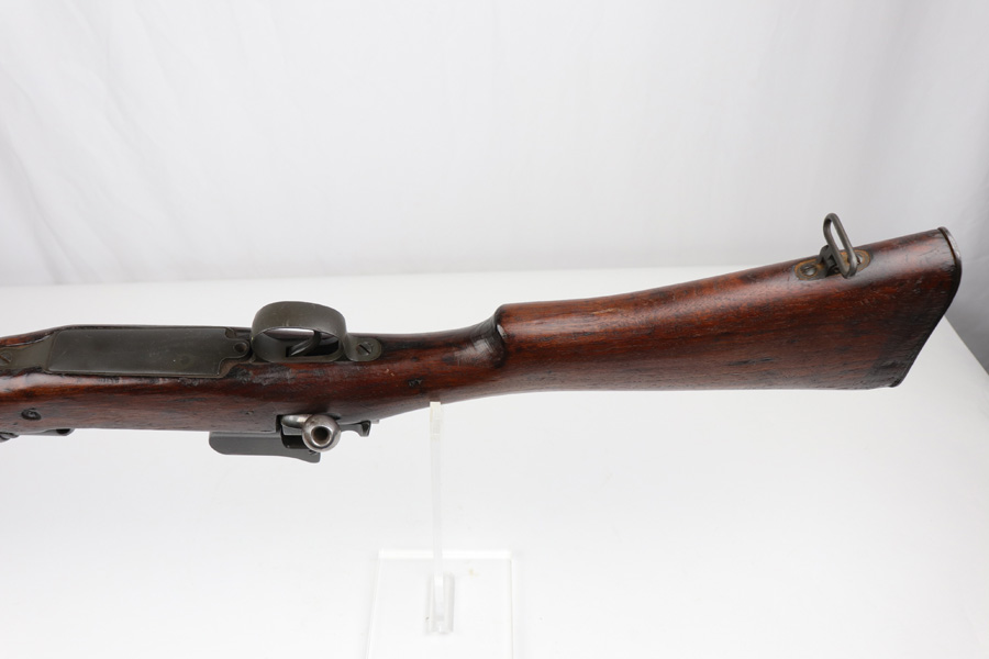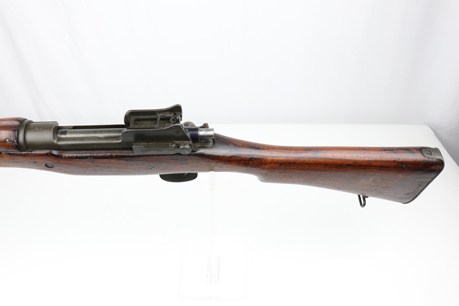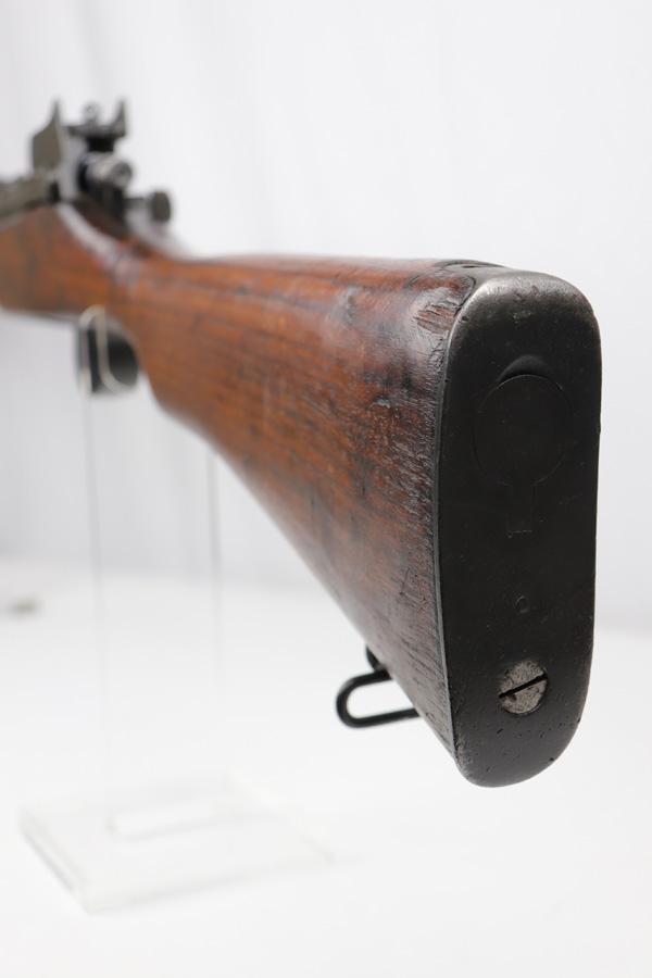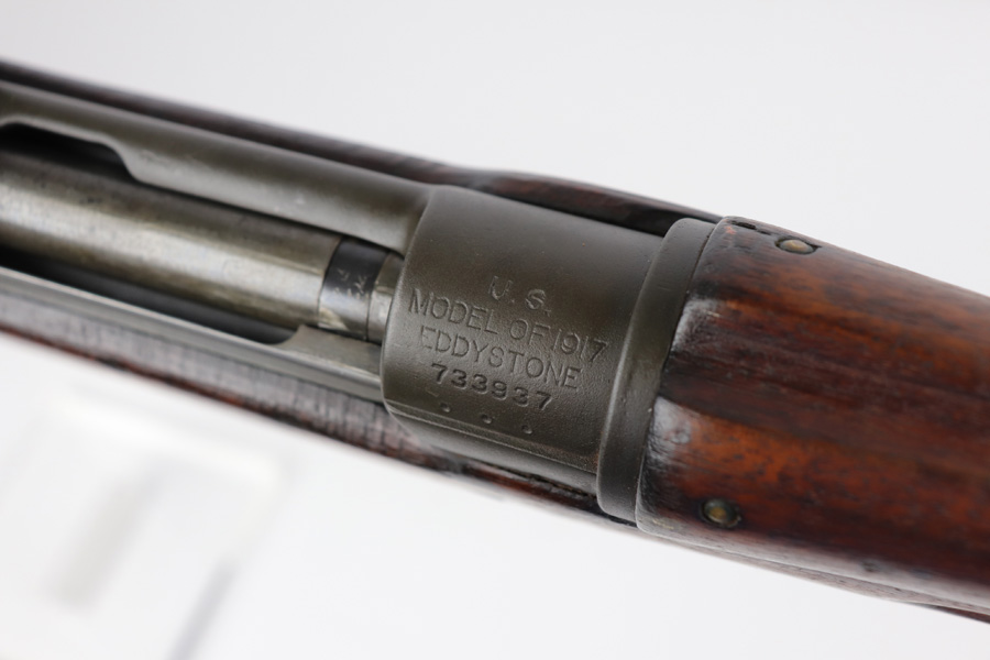 8/1/19 – This is an original late WW1 production 1918 dated Eddystone rifle. The rifle is in great to excellent condition overall. The metal has no rust or pitting, and almost all of the original bluing in tact. The receiver and barrel are flaming bomb ordnance stamped. The bore is the biggest (and only) issue with this rifle, being 5/10 rated due to corrosion and residue throughout. Would really benefit from a good cleaning, and would likely greatly improve as the rifling appears strong still. Externally there’s minimal wear of note on the metal and wood stock. 1918 dated on the barrel. Smooth action and fully functional.