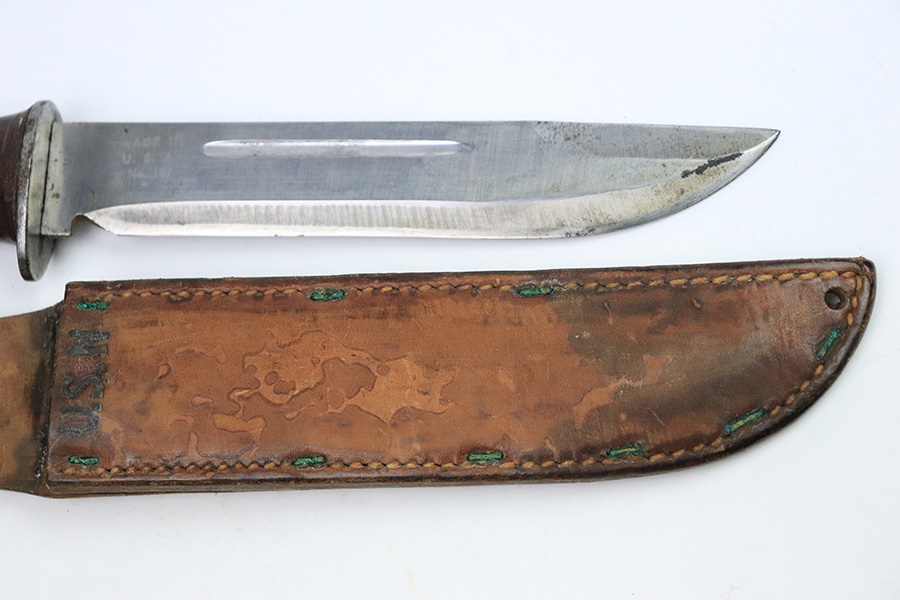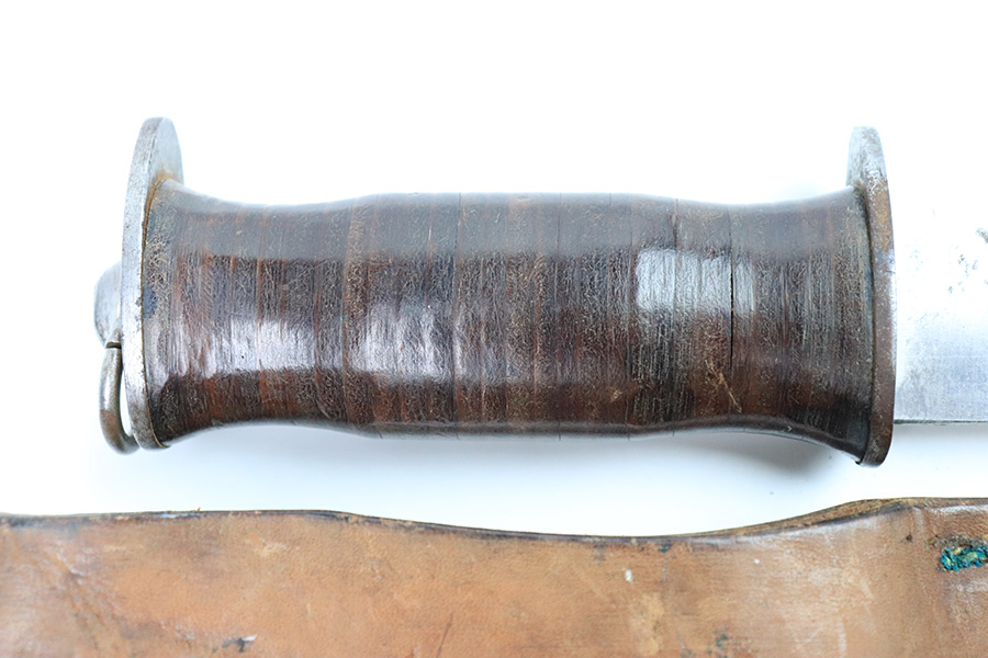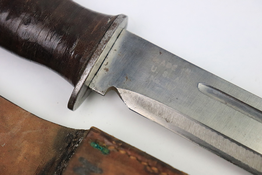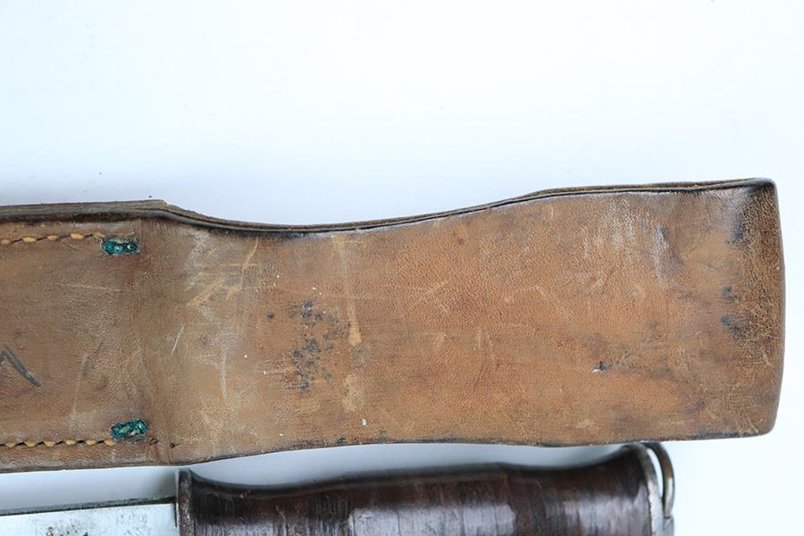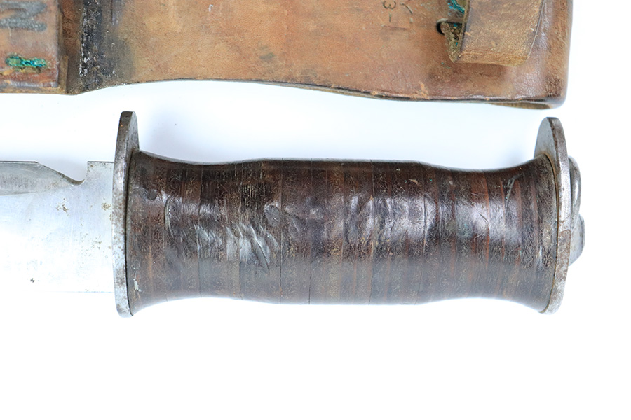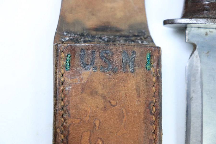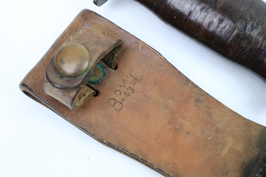 12/6/22 – This is an original WW2 era US Navy fighting / utility knife by EG Waterman. The knife blade is in great condition with Some mild signs of sharpening along the edge and some surface oxidation and discoloration. There are a few small chips along the edge as well from use. The blade is faintly marked “Made in USA No. 187” on one side. The leather handle is in great condition and shows handling wear. Comes with a USN marked leather scabbard that’s maker stamped “BOYT 43” on the frog.