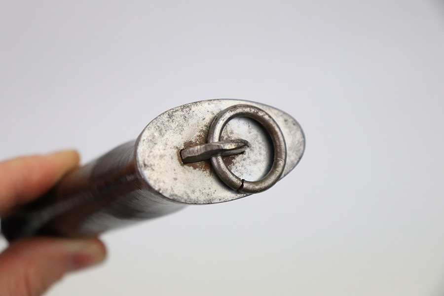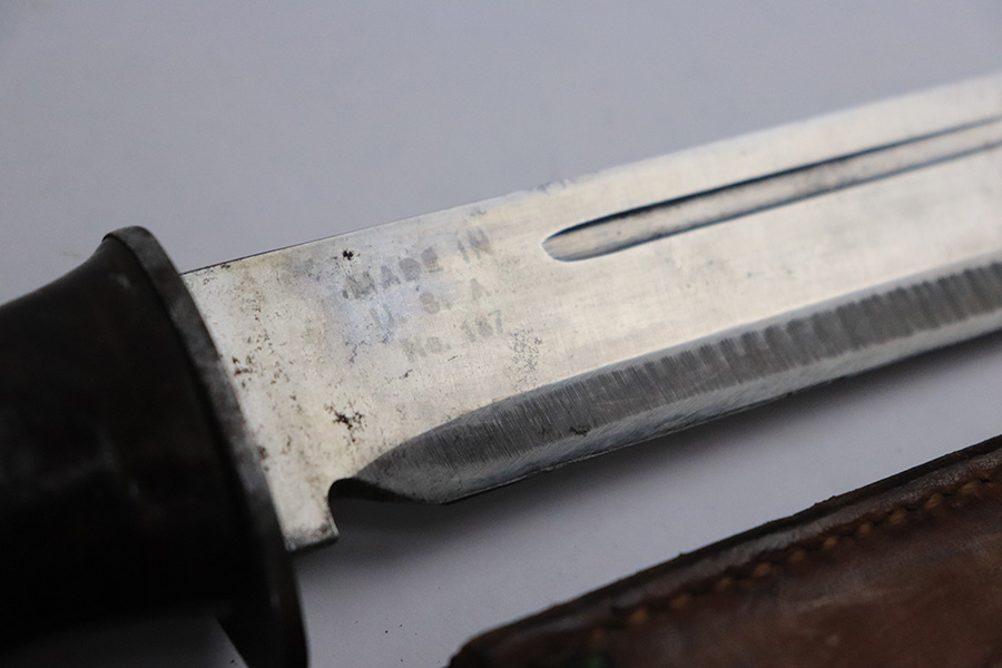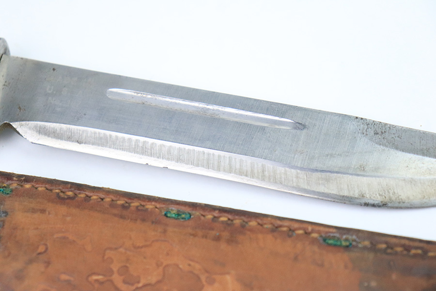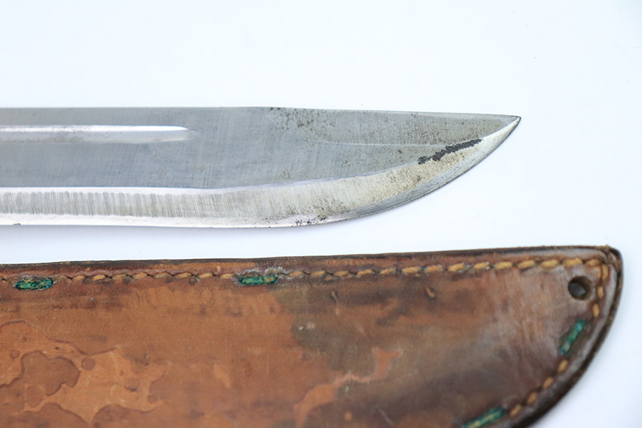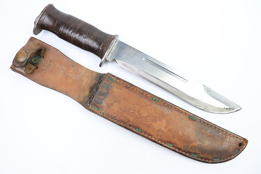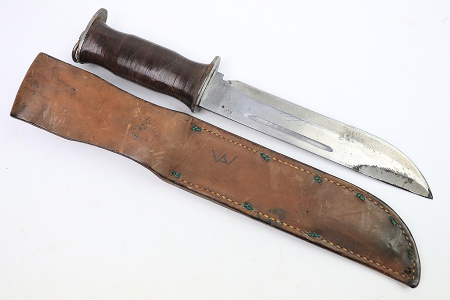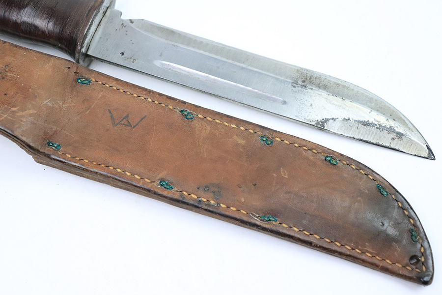 12/6/22 – This is an original WW2 era US Navy fighting / utility knife by EG Waterman. The knife blade is in great condition with Some mild signs of sharpening along the edge and some surface oxidation and discoloration. There are a few small chips along the edge as well from use. The blade is faintly marked “Made in USA No. 187” on one side. The leather handle is in great condition and shows handling wear. Comes with a USN marked leather scabbard that’s maker stamped “BOYT 43” on the frog.