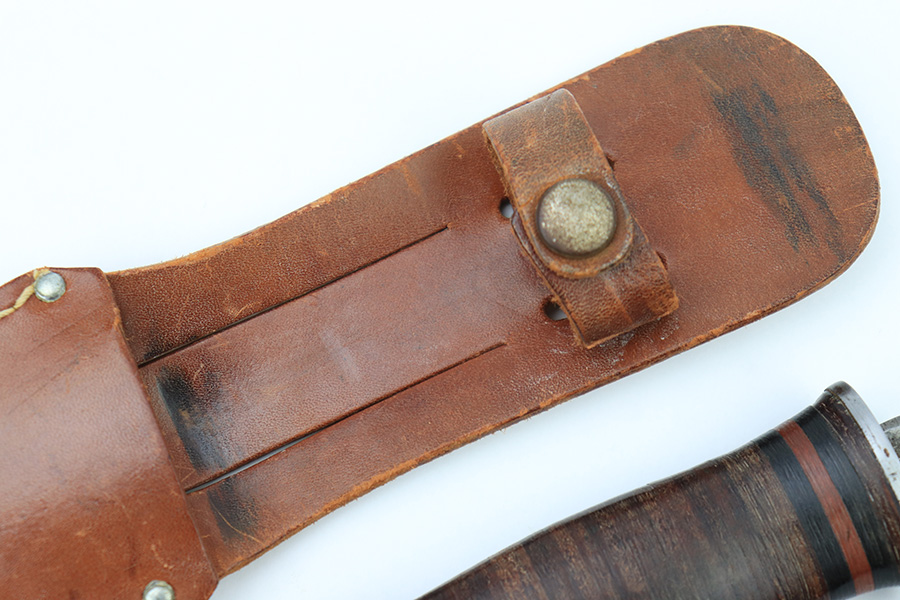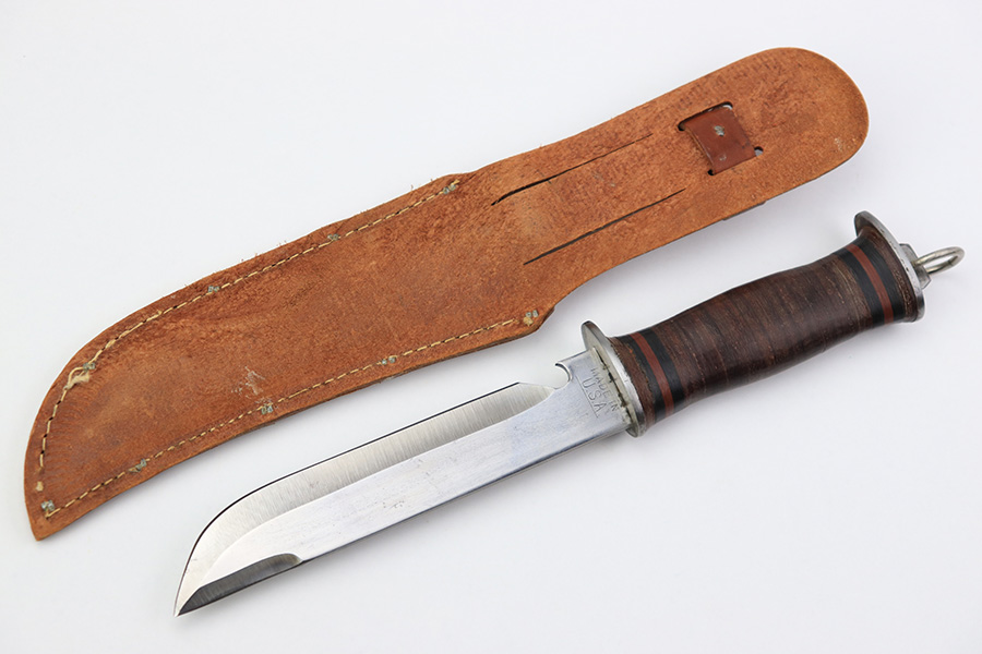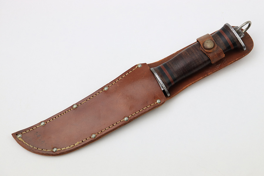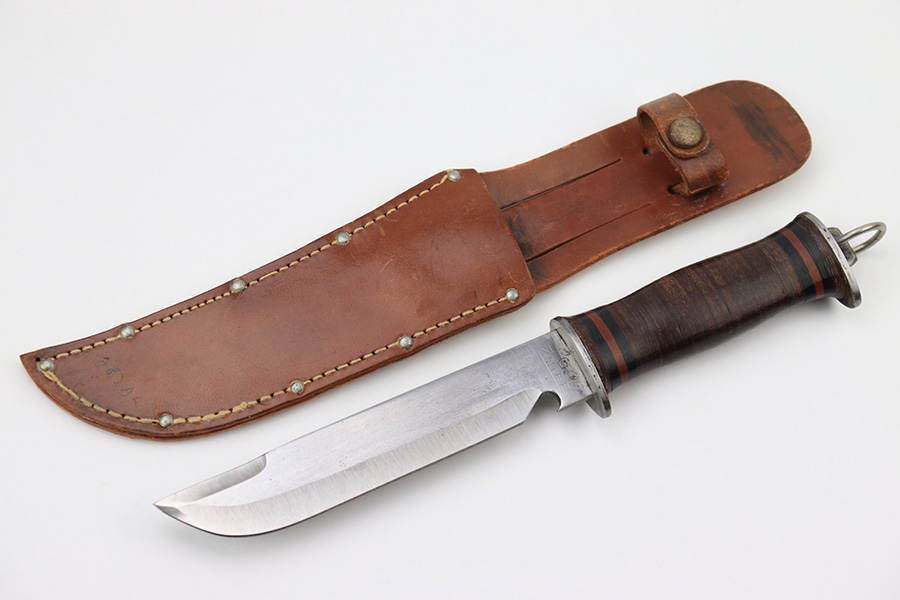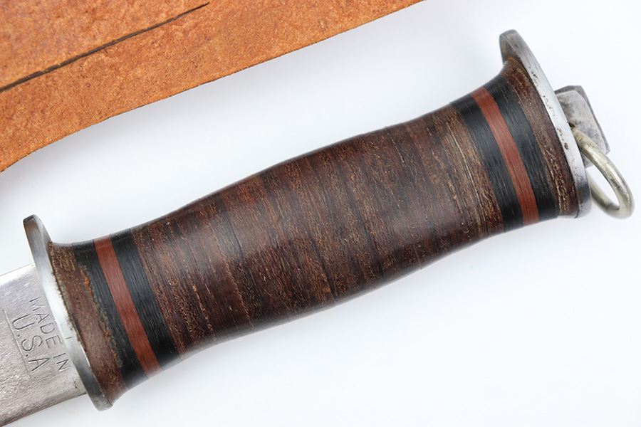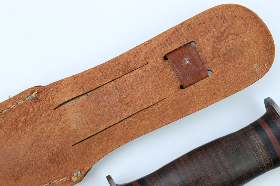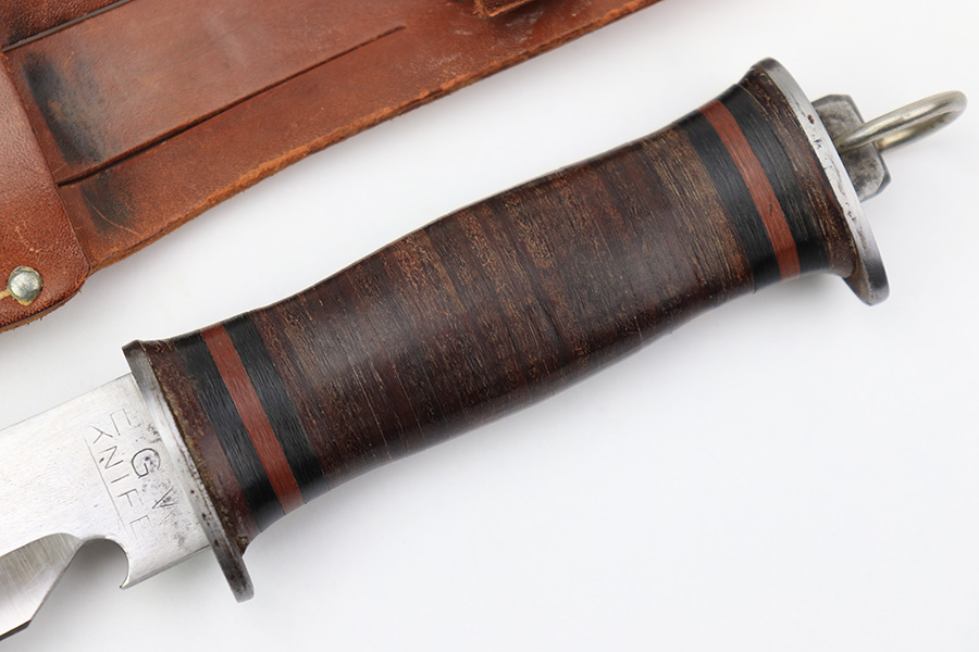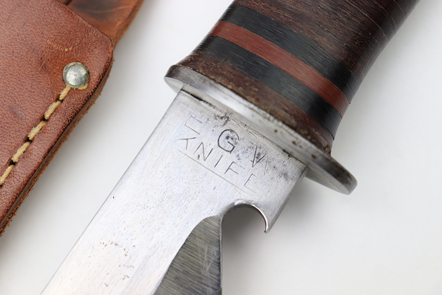 7/7/22 – This is an original WW2 era US fighting / utility knife. The knife blade is in excellent condition with a maker stamp by “E.G.W.” on one side. The reverse is marked “Made in USA”. The edge is very sharp and shows no signs of sharpening. The leather handle is excellent with black and red spacers. Comes with an unmarked leather scabbard.