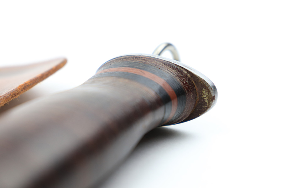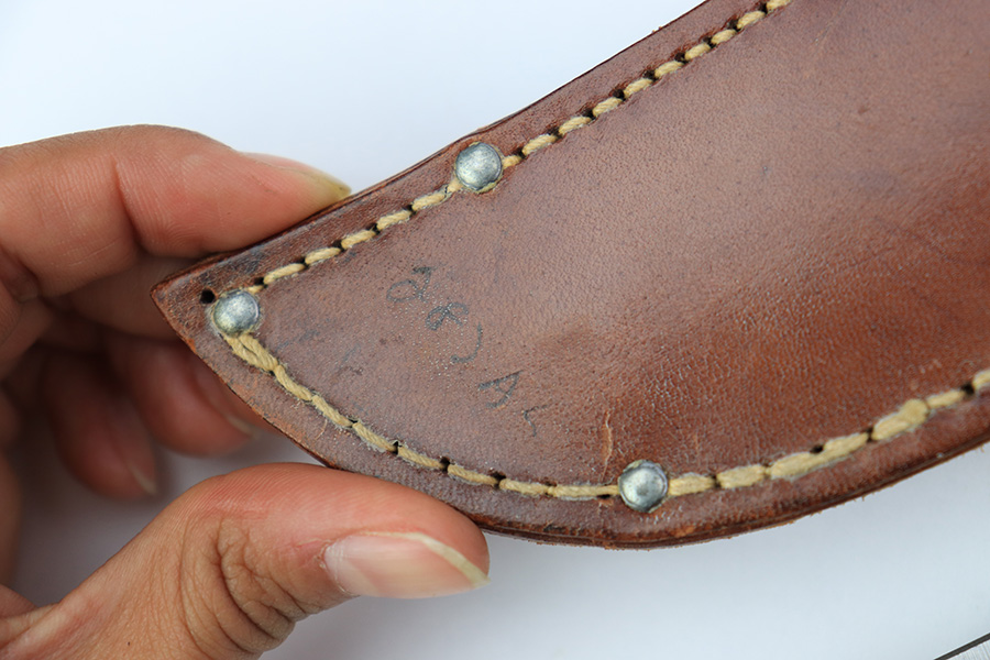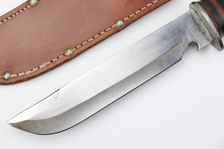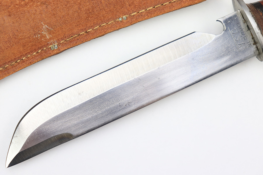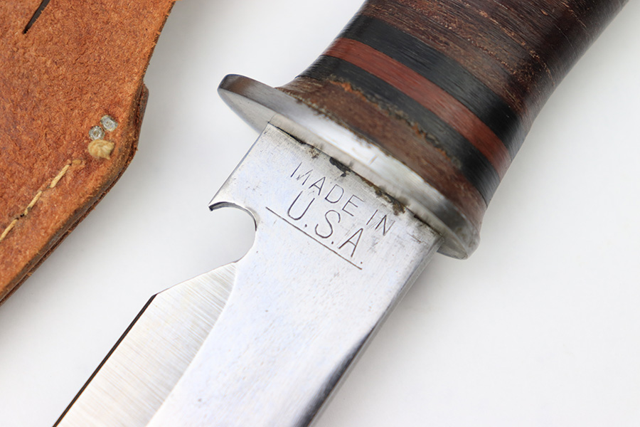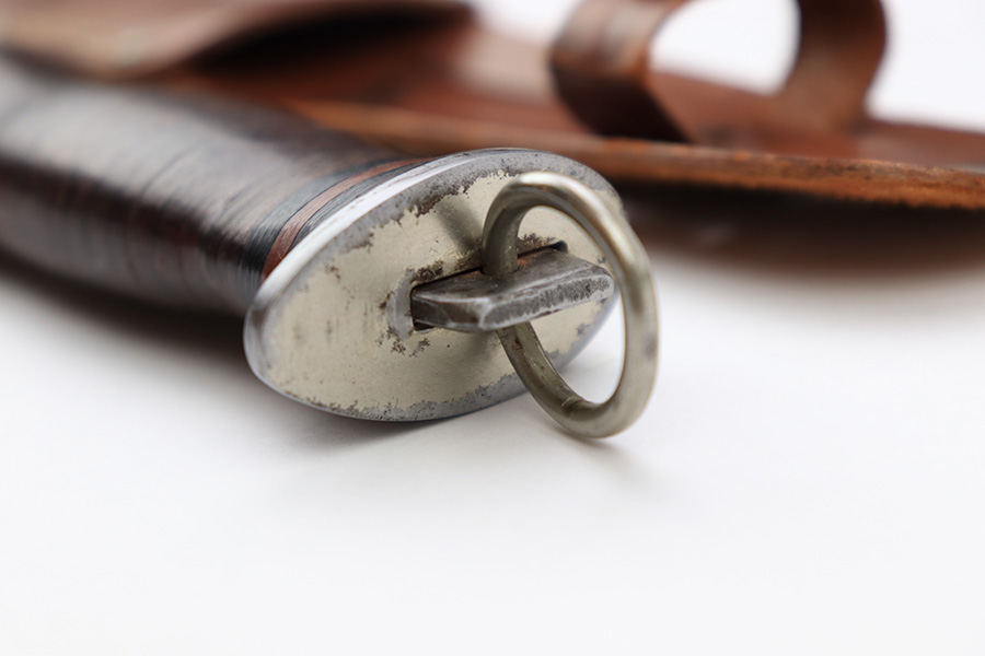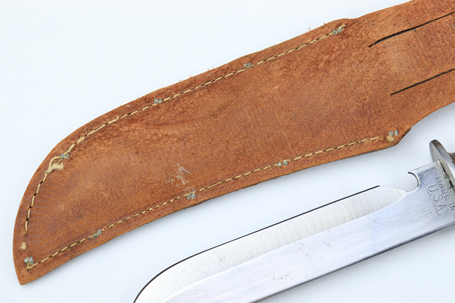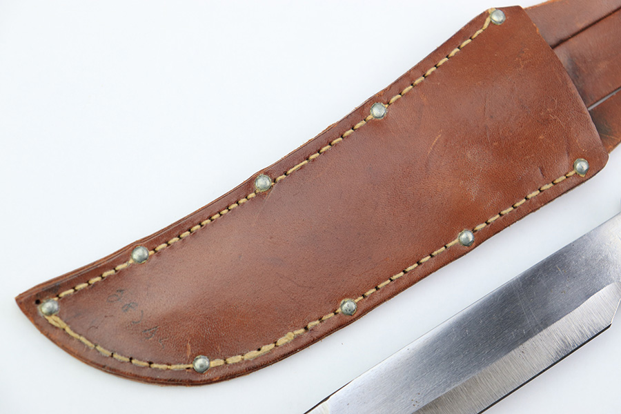7/7/22 – This is an original WW2 era US fighting / utility knife. The knife blade is in excellent condition with a maker stamp by “E.G.W.” on one side. The reverse is marked “Made in USA”. The edge is very sharp and shows no signs of sharpening. The leather handle is excellent with black and red spacers. Comes with an unmarked leather scabbard.