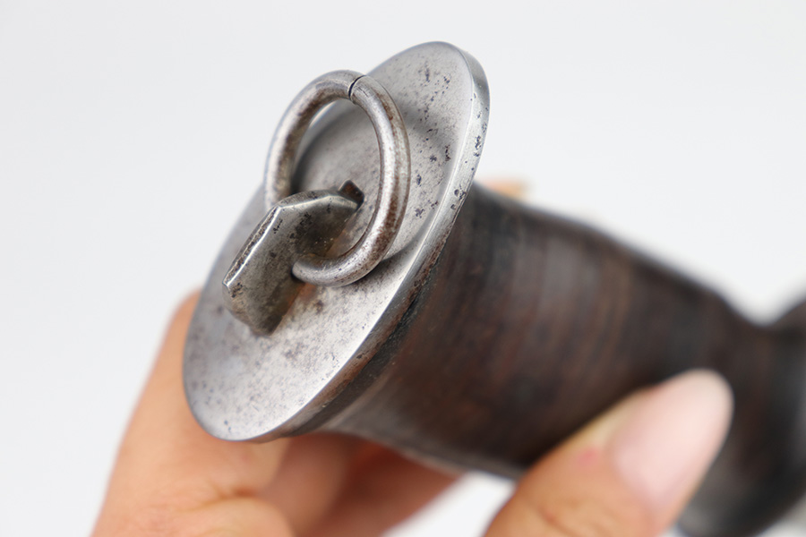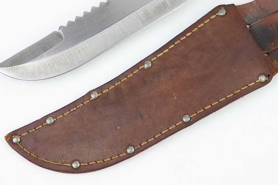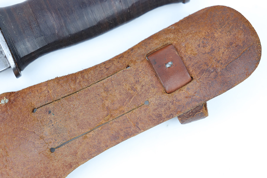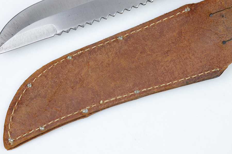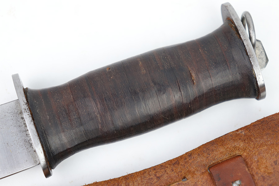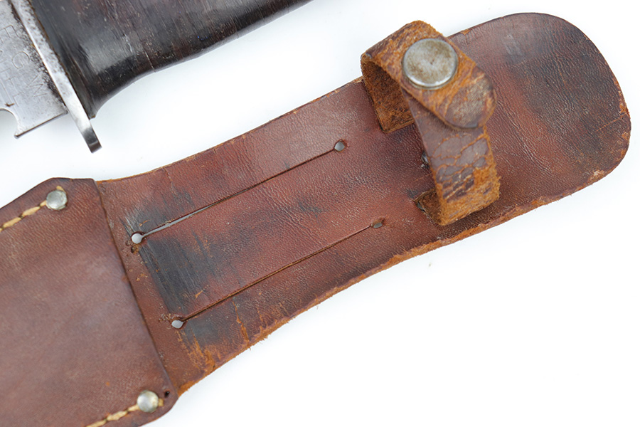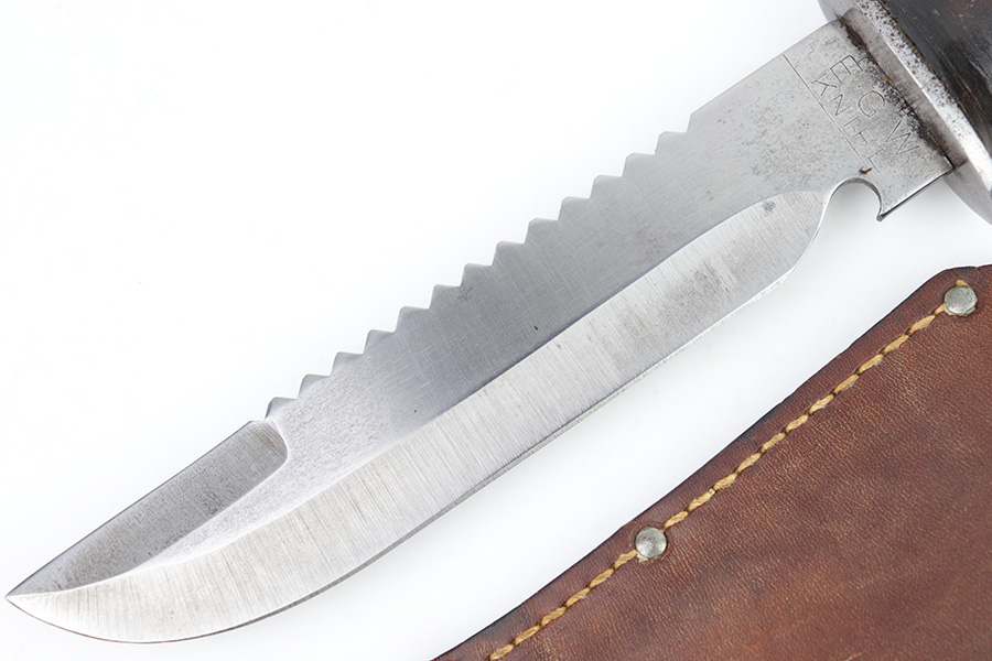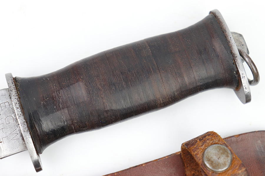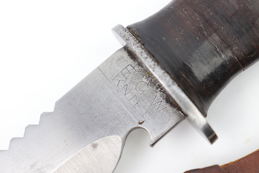 2/20/23 – This is an original WW2 era production Utility Knife by EG Waterman. These knives were often used by the US Navy as a utility / fighting knife. This blade features a hooked groove at the base of the edge, and a sawback utility blade as shown. The ricasso is maker stamped “EGW Knife”. No other markings. The blade has mild surface patina and some dark discoloration but no major issues and an excellent clean edge. The wood handle shows use and handling wear but no major issues. Comes with an unmarked leather sheath as shown.
