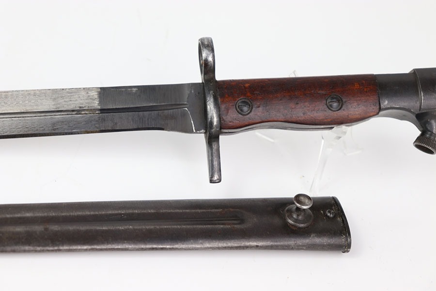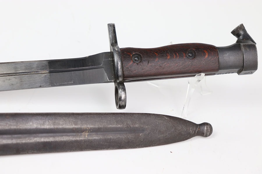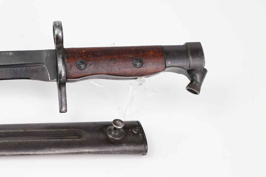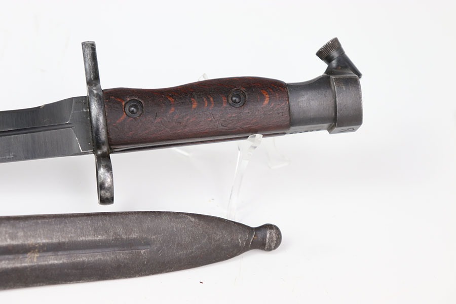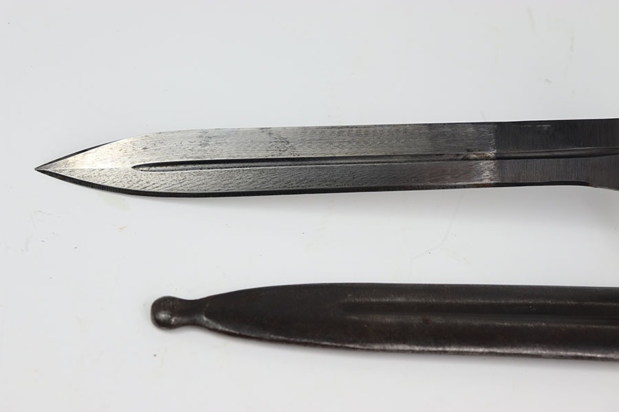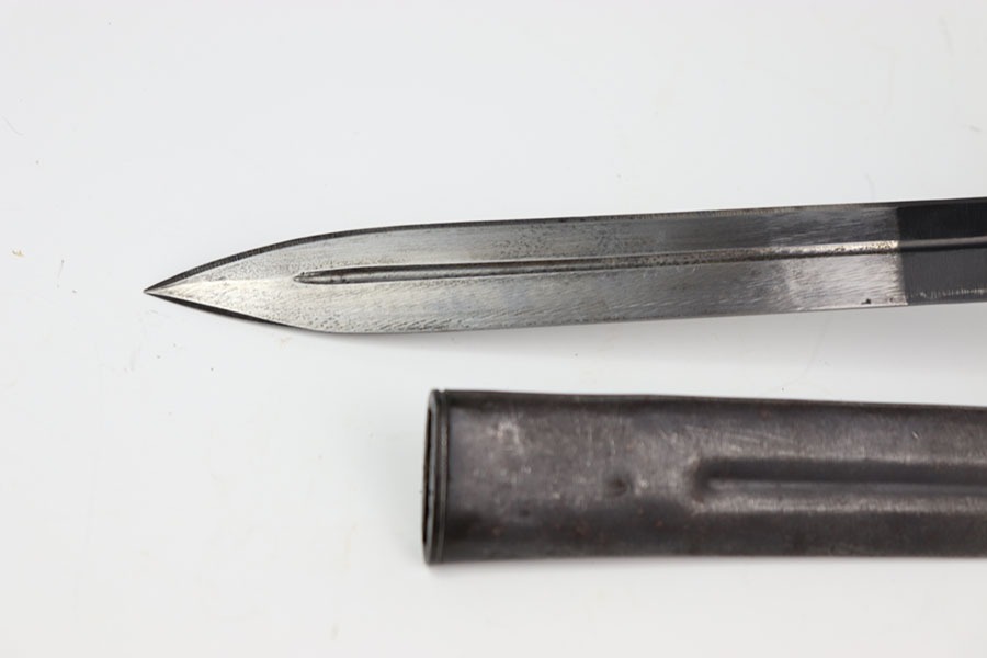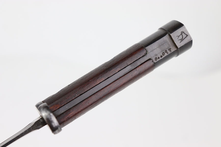 10/23/24 – This is an excellent and original condition Egyptian Hakim bayonet. This example comes in top condition, showing very little wear on the blade and clean sharpening. There is some minor finish loss on the cross guard and pommel, but no significant issues. The grips have nice coloration and are without splits or cracks. The scabbard is very clean, with only a tiny speckling of finish loss, but is without dents or cracks