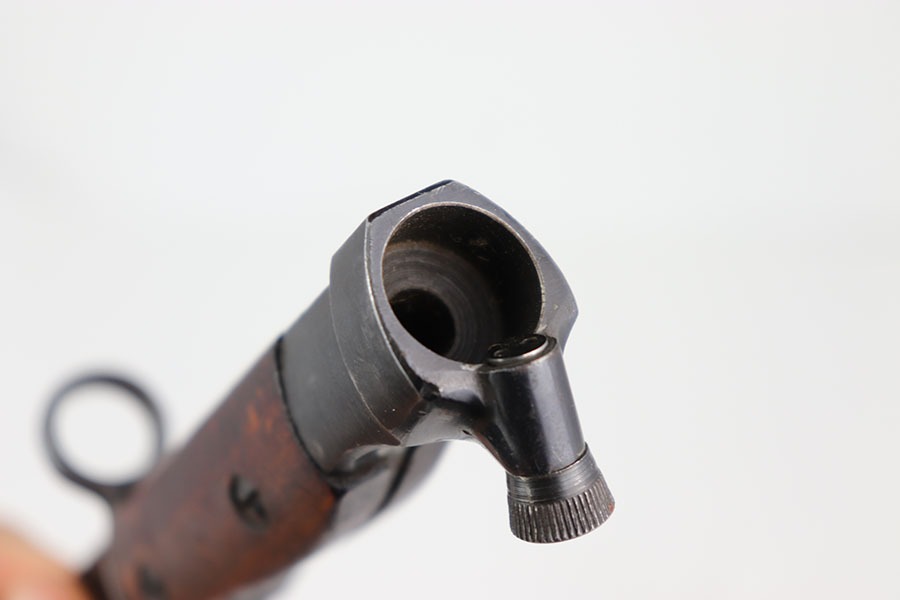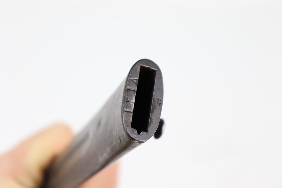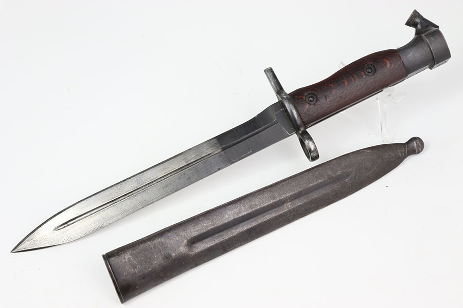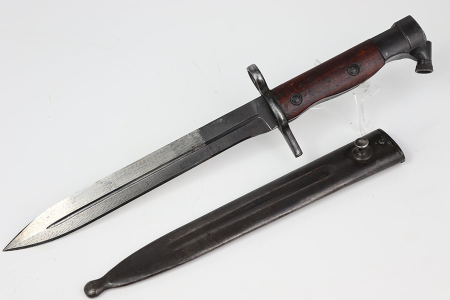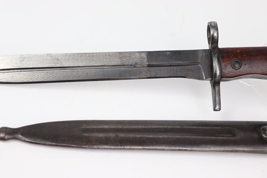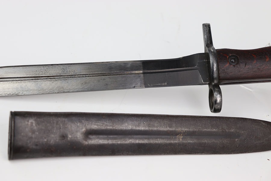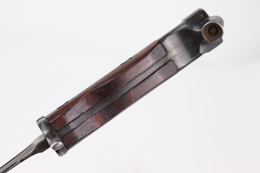 10/23/24 – This is an excellent and original condition Egyptian Hakim bayonet. This example comes in top condition, showing very little wear on the blade and clean sharpening. There is some minor finish loss on the cross guard and pommel, but no significant issues. The grips have nice coloration and are without splits or cracks. The scabbard is very clean, with only a tiny speckling of finish loss, but is without dents or cracks