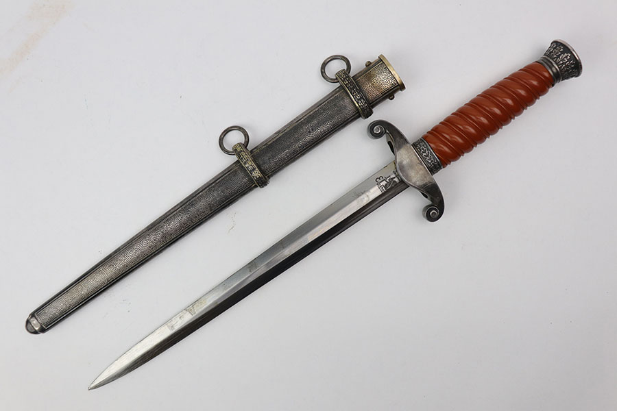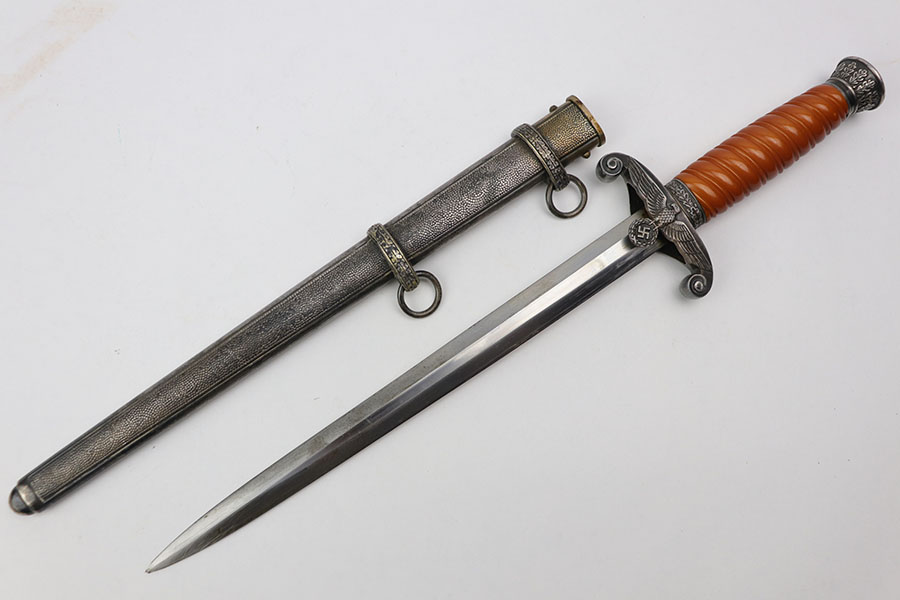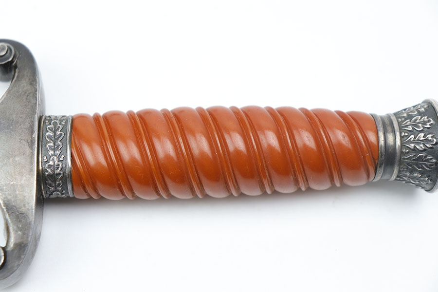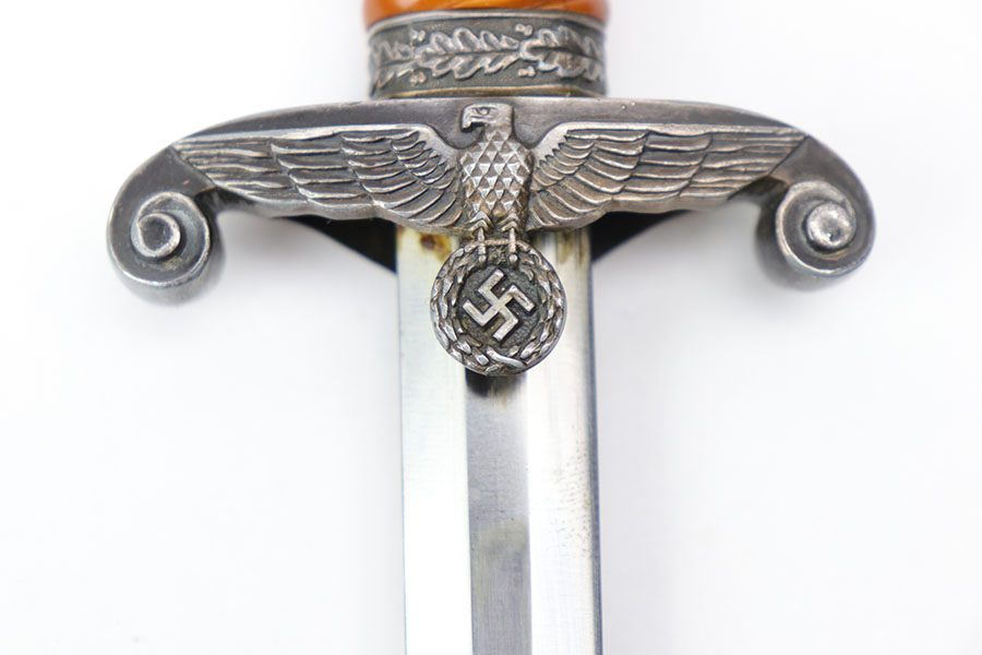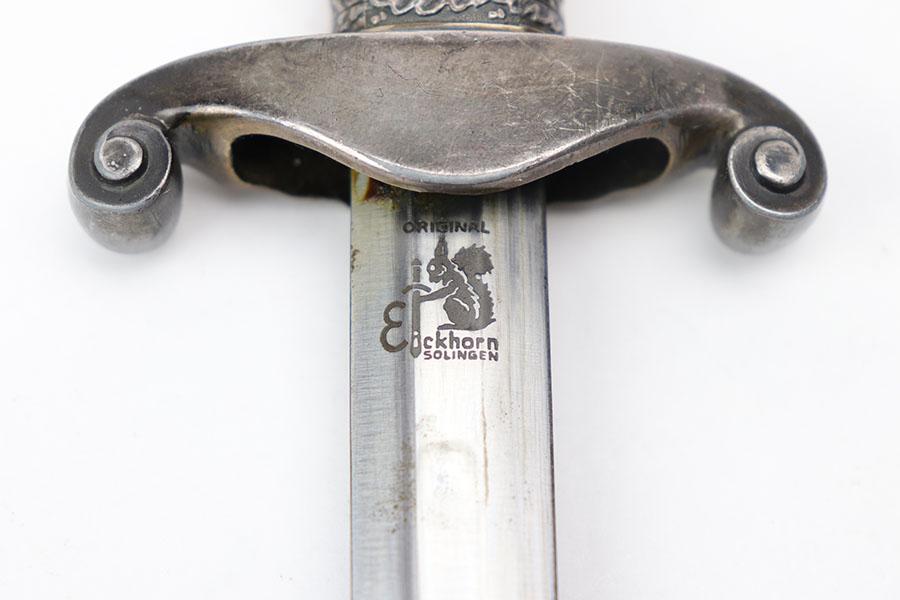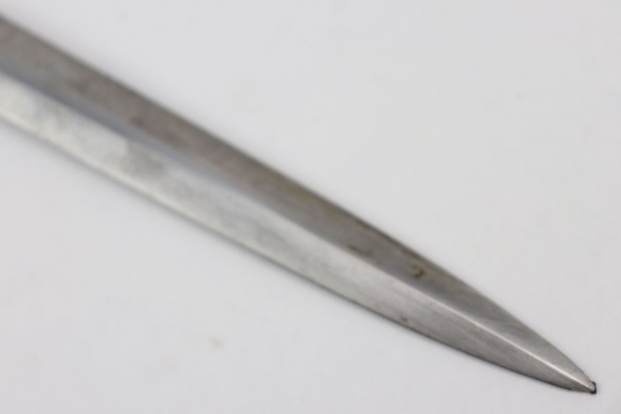 8/28/20 – This is an original WW2 nazi Eickhorn army dagger. The dagger comes with an original scabbard and dark orange handle. The blade is maker stamped and excellent with only some light oxidation and scabbard wear. Nice cross graining. No cracks or chips in the handle, and no dents in the scabbard.