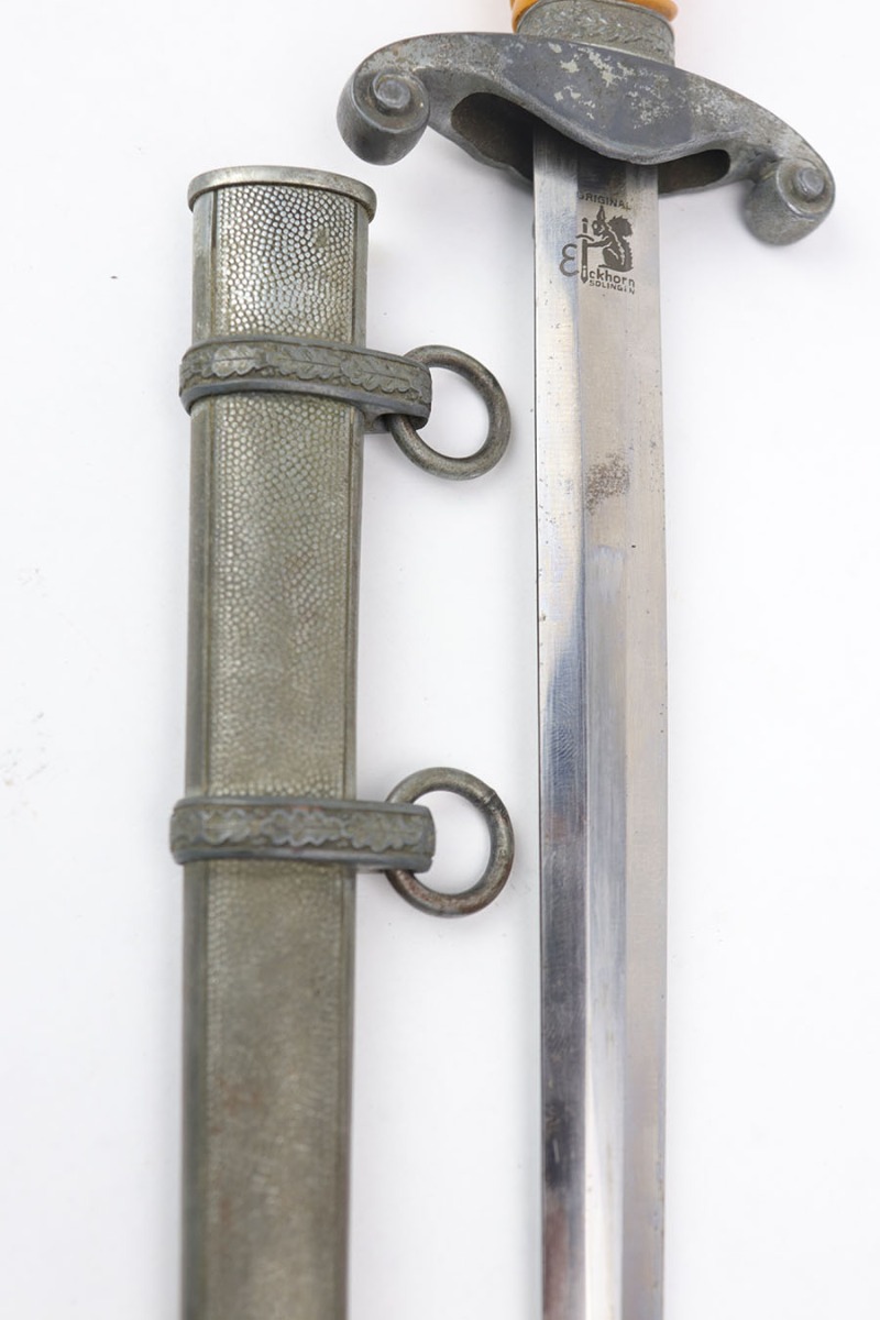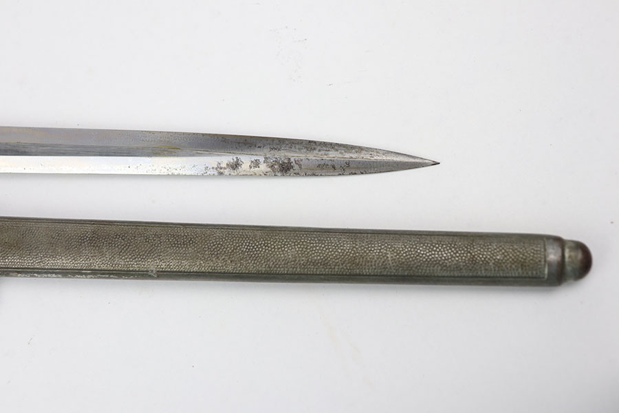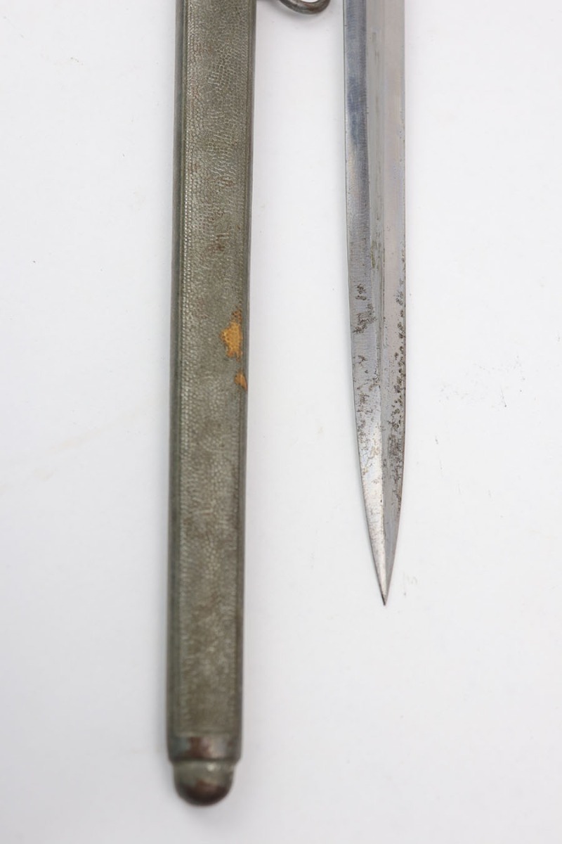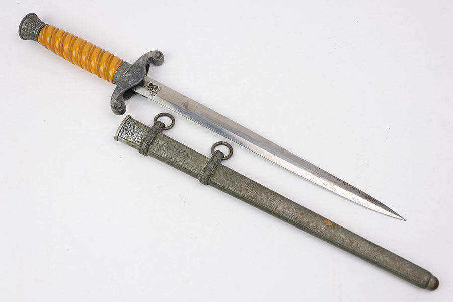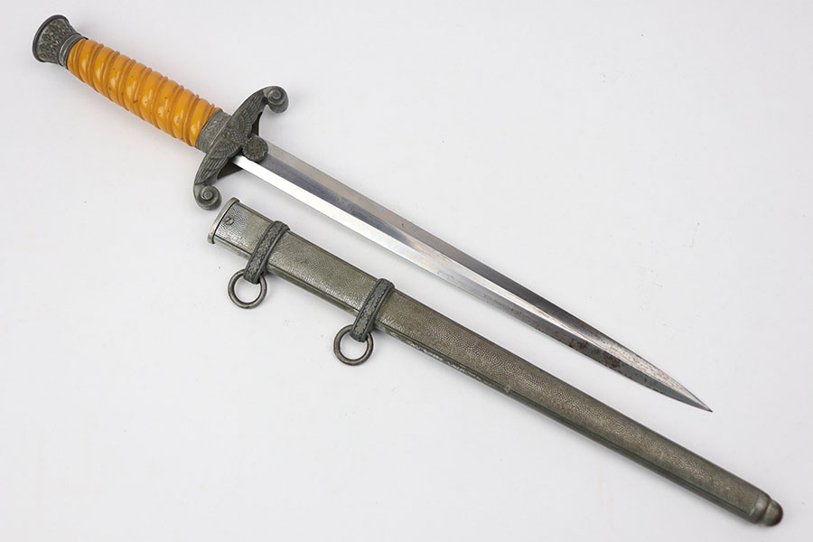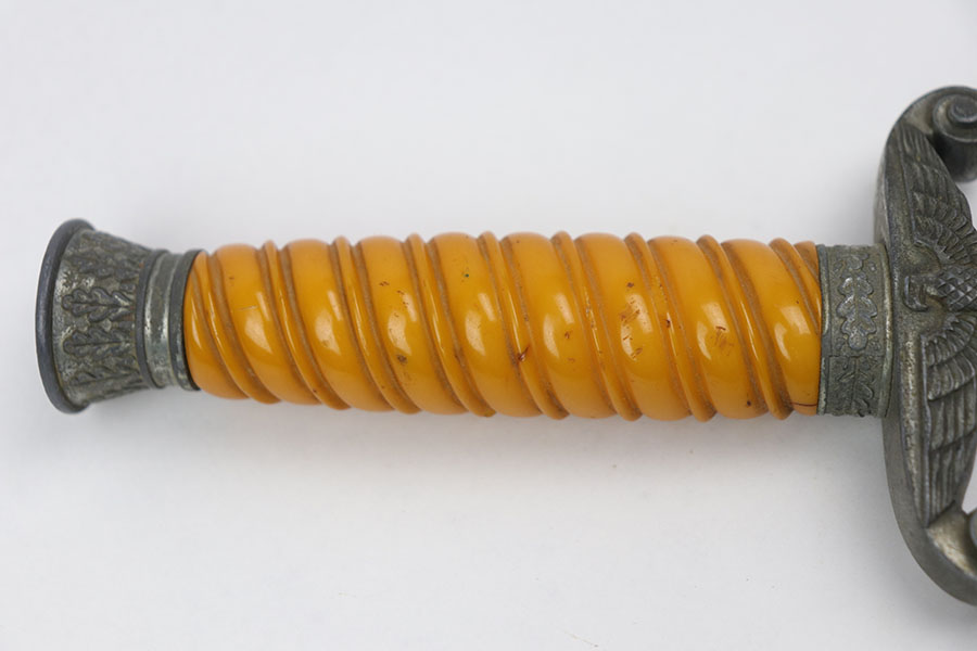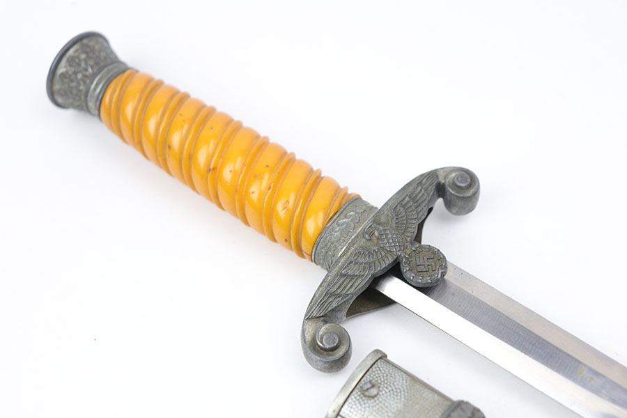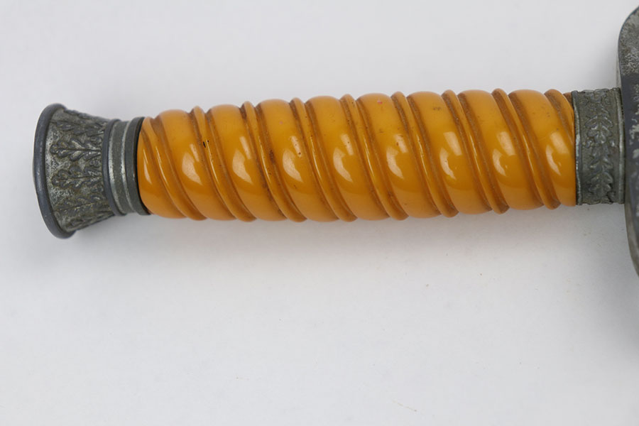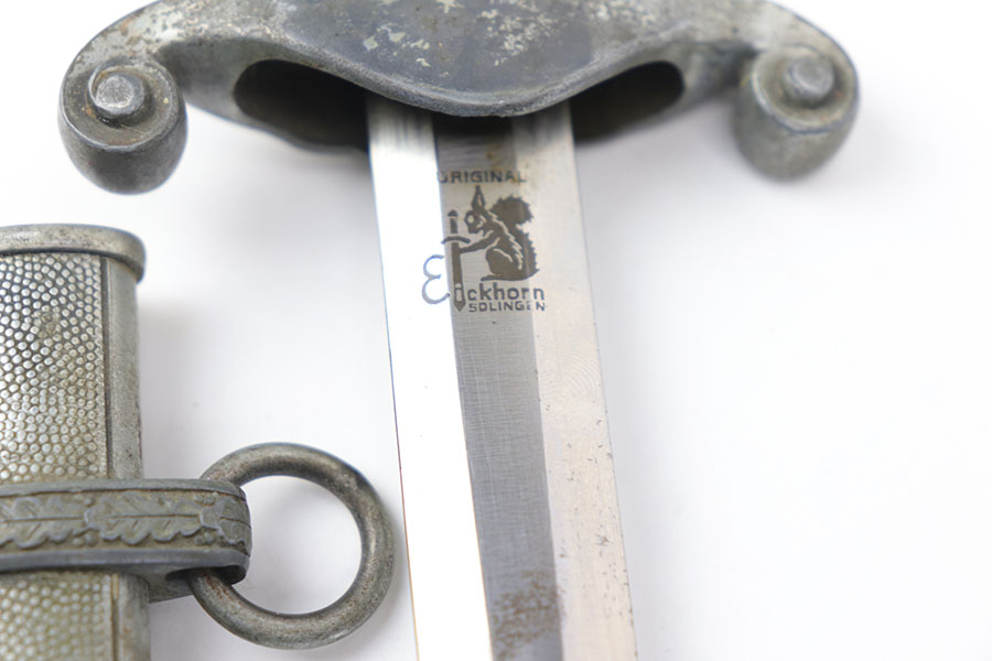 10/19/20 – This is an original army dress dagger made by Eickhorn during WW2. Comes with an original scabbard. The burnt orange handle has no cracks or chips. There is some light discoloration on the blade, mostly near the tip. Maker stamped on the reverse side. There is a small area of discoloration on the scabbard, but no dents or major issues.