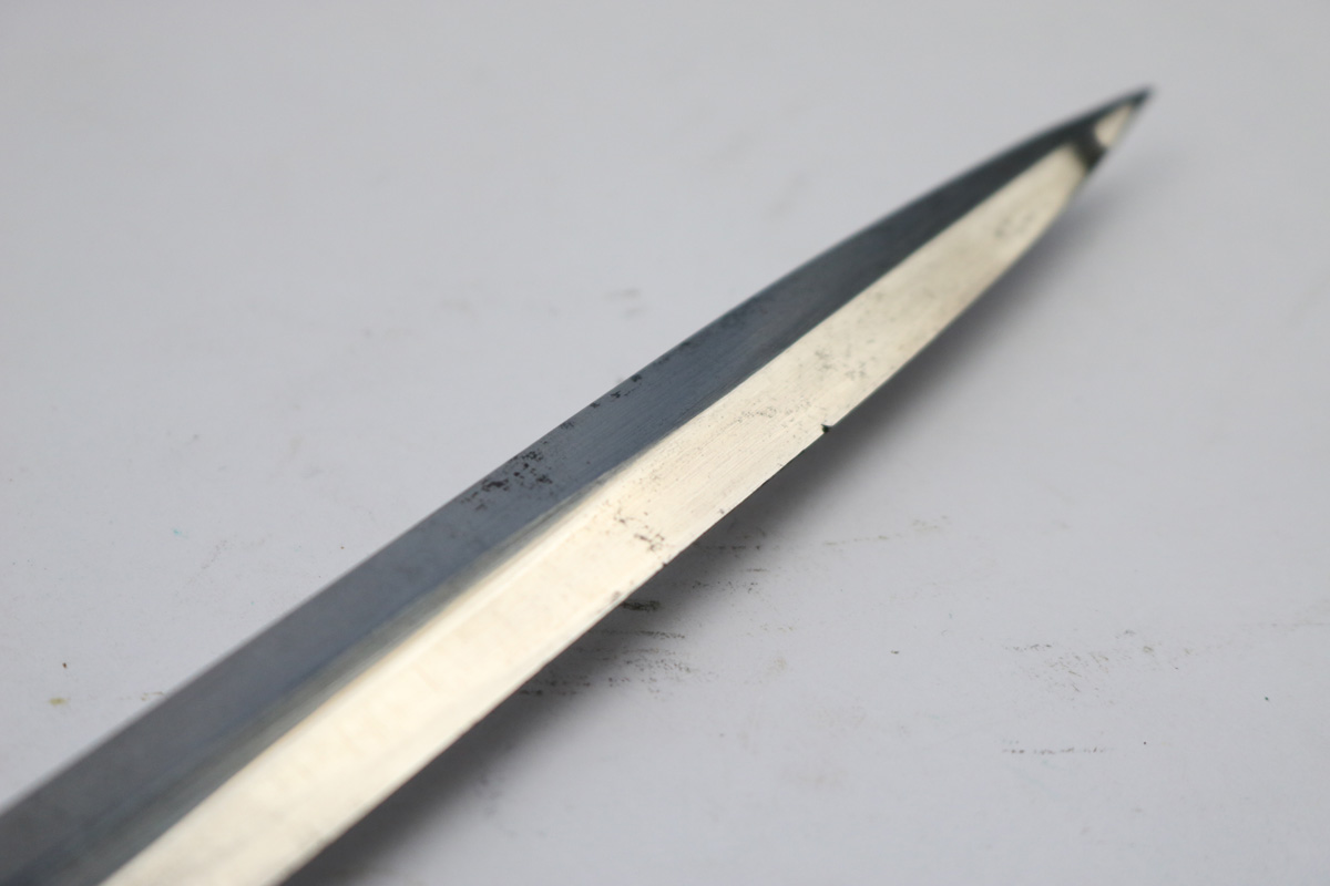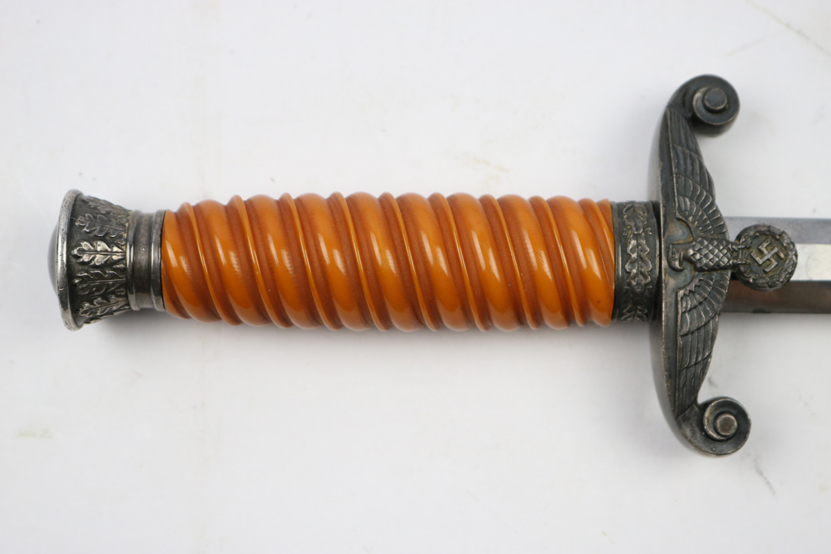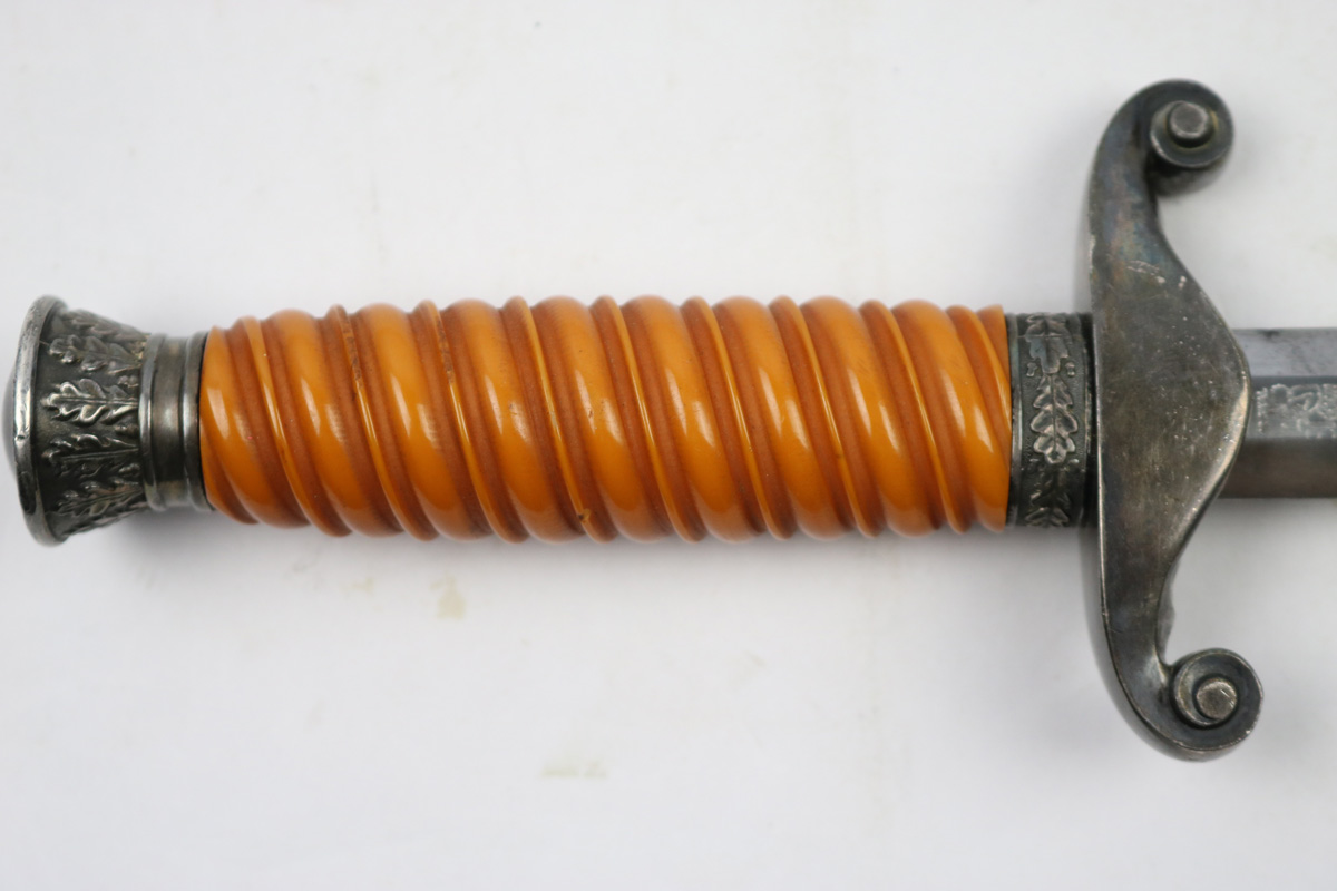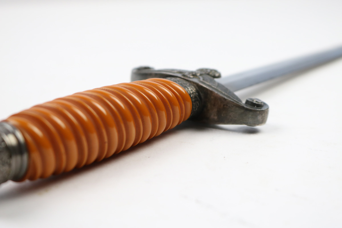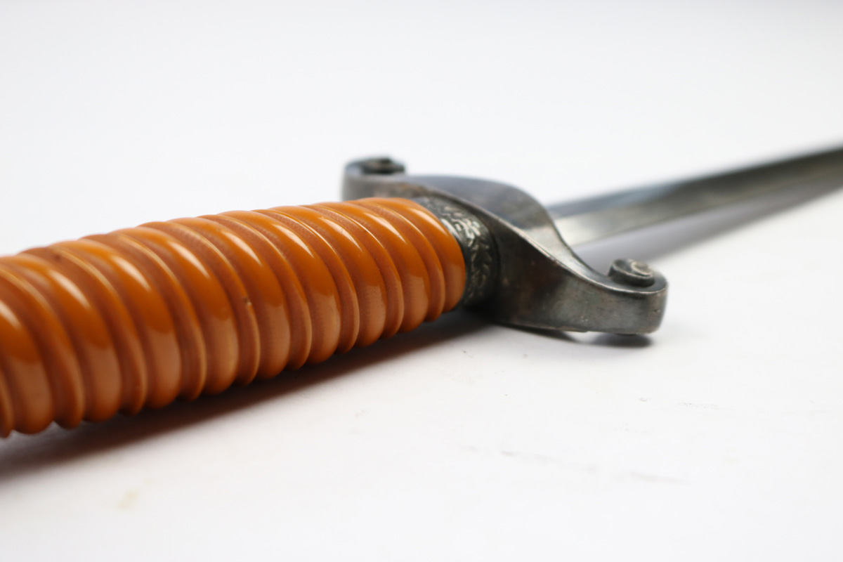 7/13/18 – This is an original WW2 nazi army dagger. The dagger is in great shape with a blade stamped by Carl Eickhorn. The maker stamp style was used from 1936-41. The blade shows some patina throughout – small speckling of light oxidation. There are a few spots were there’s some darker oxidation / wear on the blade as well. Most of this is near the tip. The tip also has a very slight bend or dent. Priced accordingly. The handle is excellent orange bakelite swirled with no cracks or chips. The scabbard shows finish loss (I believe the finish should be darker) but there are no dents or issues otherwise with the scabbard. Guaranteed original.