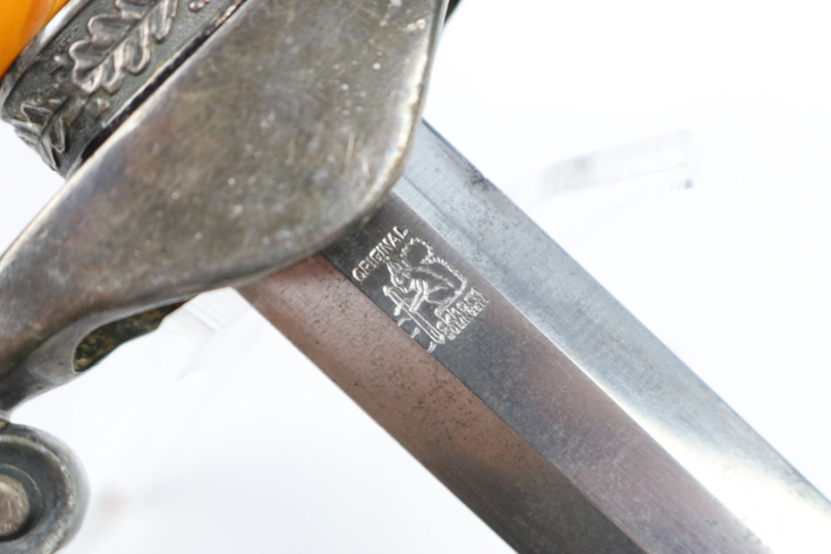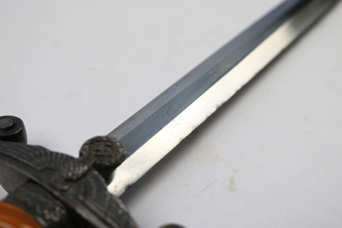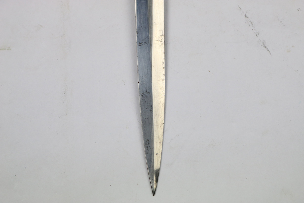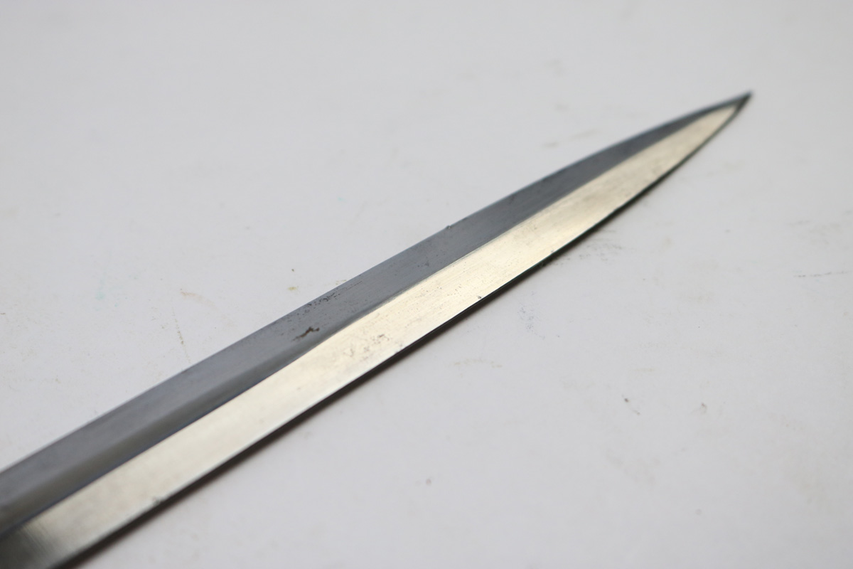 7/13/18 – This is an original WW2 nazi army dagger. The dagger is in great shape with a blade stamped by Carl Eickhorn. The maker stamp style was used from 1936-41. The blade shows some patina throughout – small speckling of light oxidation. There are a few spots were there’s some darker oxidation / wear on the blade as well. Most of this is near the tip. The tip also has a very slight bend or dent. Priced accordingly. The handle is excellent orange bakelite swirled with no cracks or chips. The scabbard shows finish loss (I believe the finish should be darker) but there are no dents or issues otherwise with the scabbard. Guaranteed original.