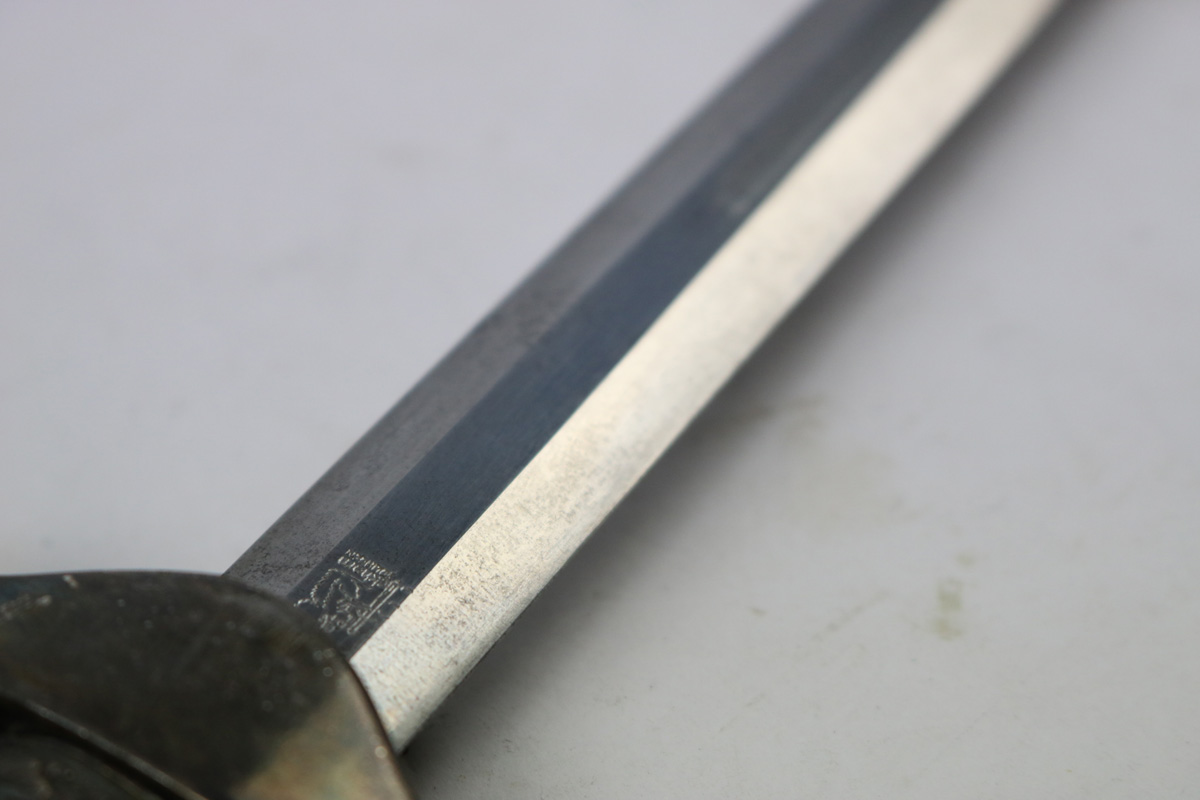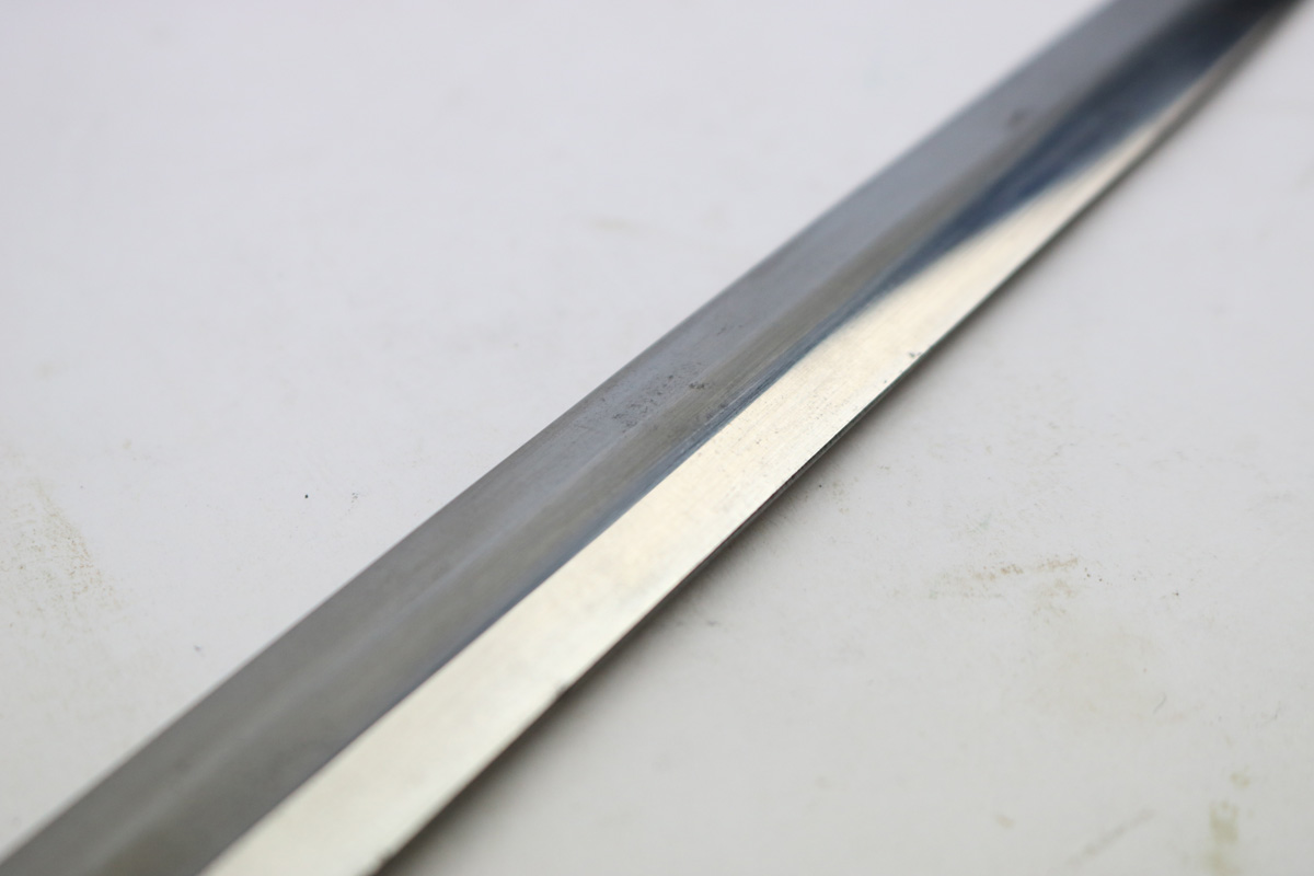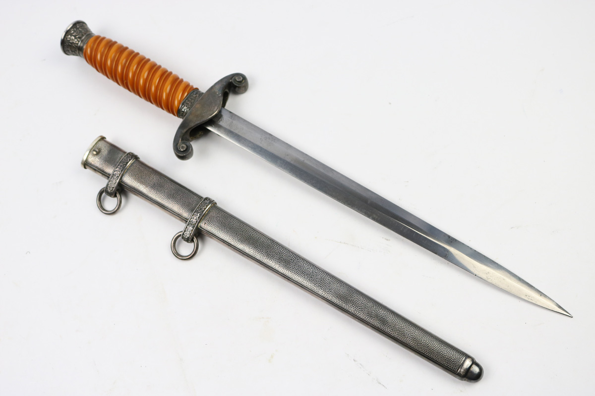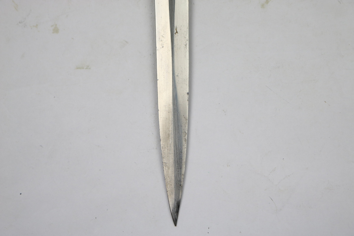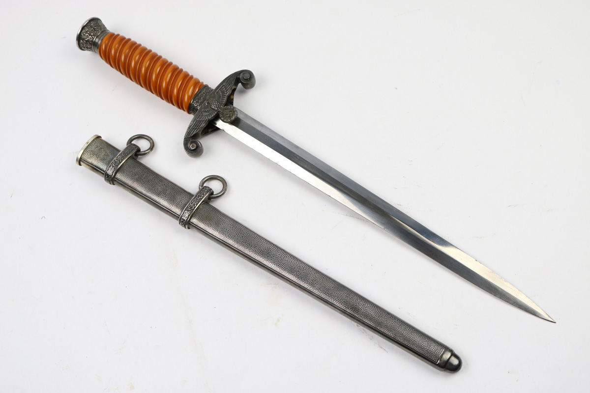 7/13/18 – This is an original WW2 nazi army dagger. The dagger is in great shape with a blade stamped by Carl Eickhorn. The maker stamp style was used from 1936-41. The blade shows some patina throughout – small speckling of light oxidation. There are a few spots were there’s some darker oxidation / wear on the blade as well. Most of this is near the tip. The tip also has a very slight bend or dent. Priced accordingly. The handle is excellent orange bakelite swirled with no cracks or chips. The scabbard shows finish loss (I believe the finish should be darker) but there are no dents or issues otherwise with the scabbard. Guaranteed original.