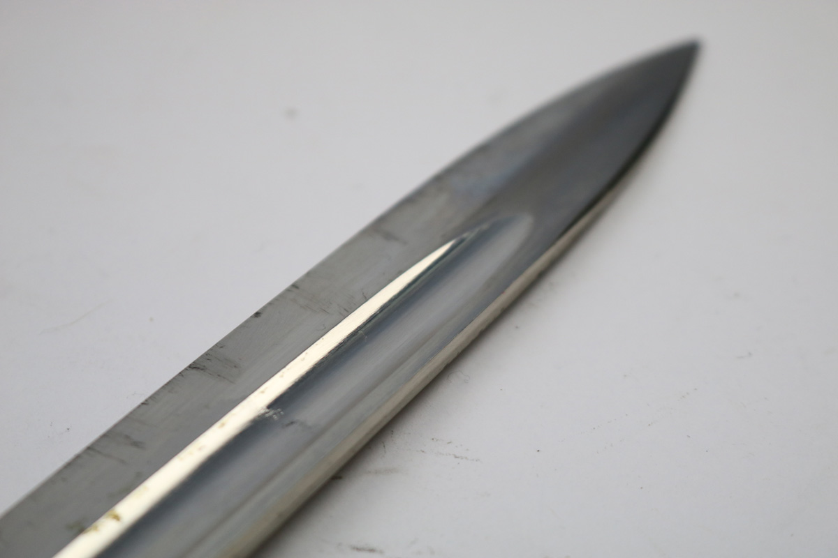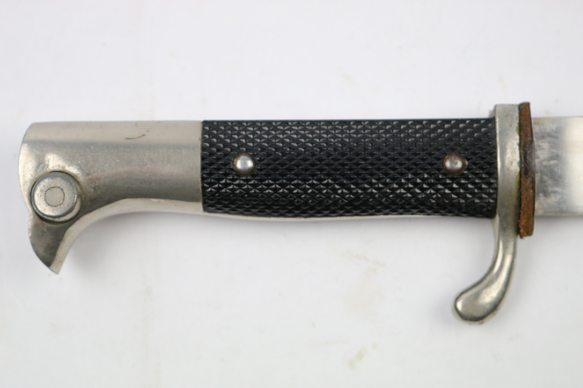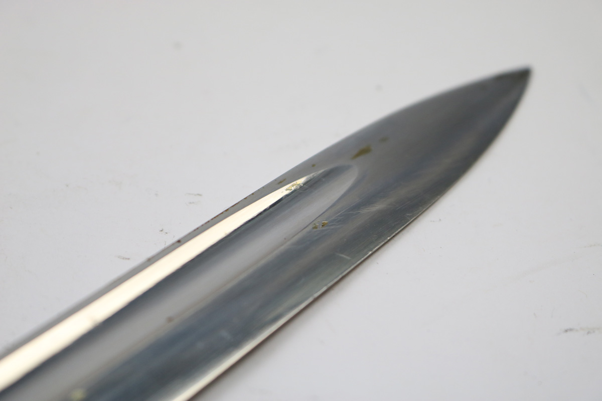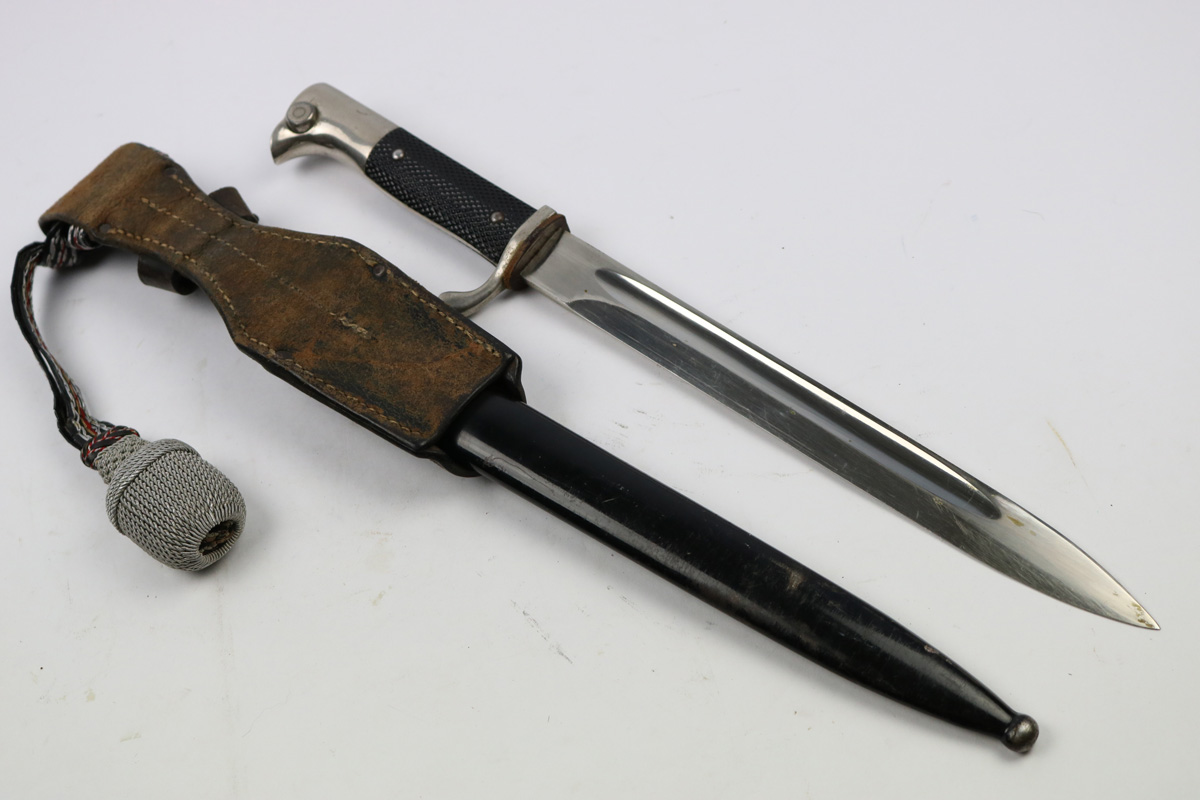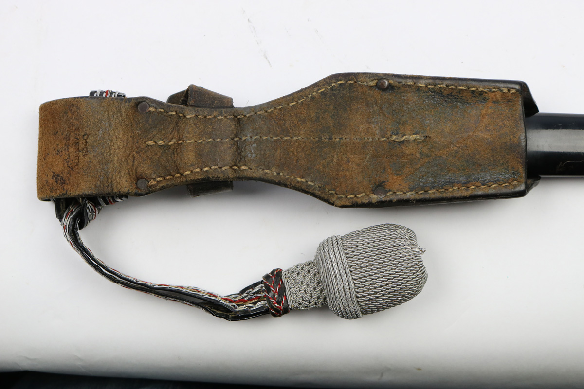 7/18/18 – This is an original WW2 German dress bayonet. The bayonet was made by Eickhorn between 1936 and 1941. The blade is clean and excellent with some minor signs of use / surface scuffing near the blade edge in a few spots. The handle is excellent with no issues. The leather stopper is in tact. Comes with an original scabbard that has normal surface wear but no dents. The leather frog is in tact and original with a 1940 date stamp on the back (the maker is hard to decipher). Comes with a portepee in excellent condition.