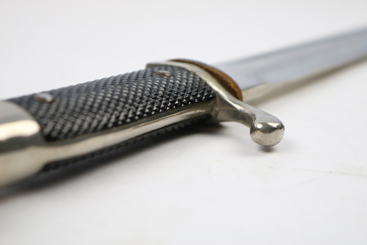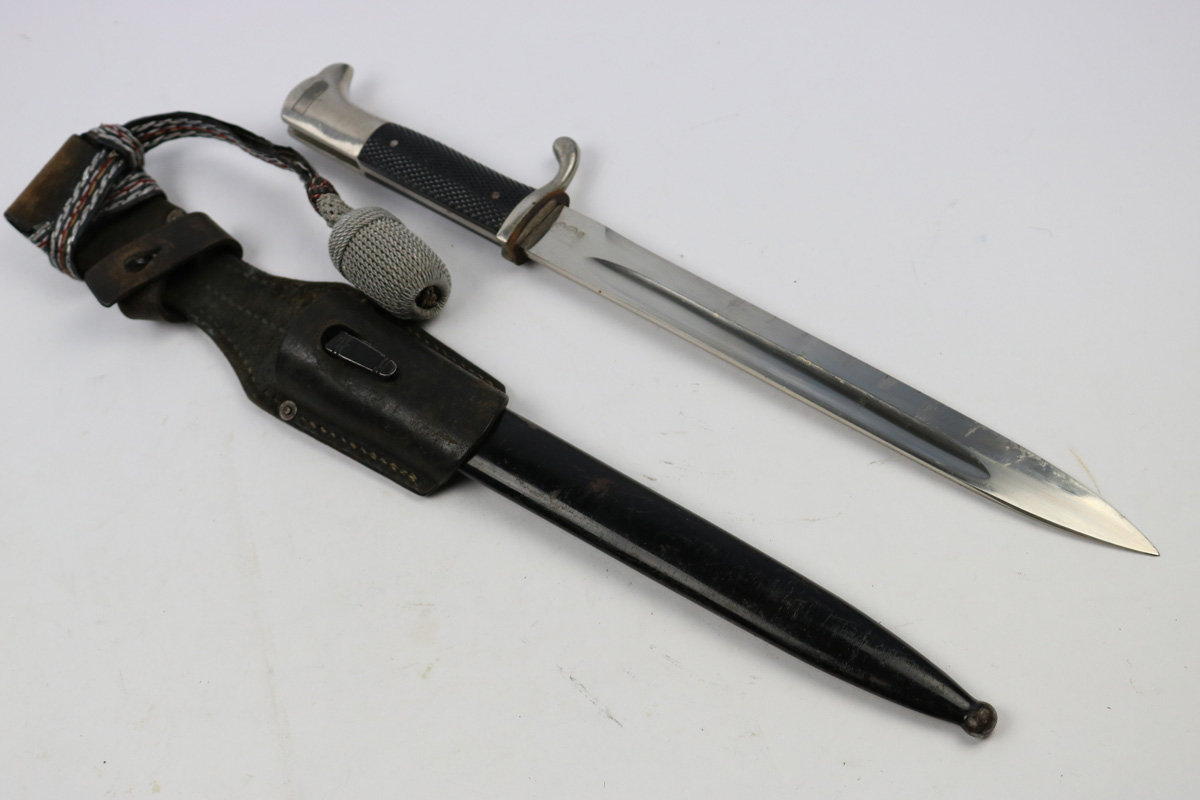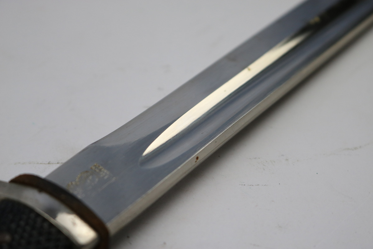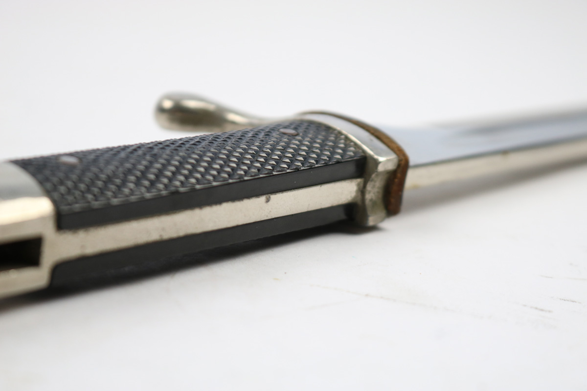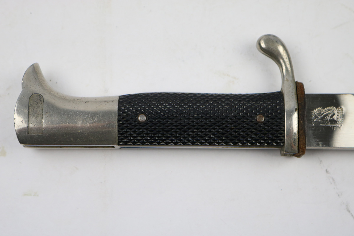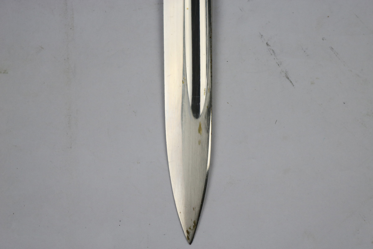7/18/18 – This is an original WW2 German dress bayonet. The bayonet was made by Eickhorn between 1936 and 1941. The blade is clean and excellent with some minor signs of use / surface scuffing near the blade edge in a few spots. The handle is excellent with no issues. The leather stopper is in tact. Comes with an original scabbard that has normal surface wear but no dents. The leather frog is in tact and original with a 1940 date stamp on the back (the maker is hard to decipher). Comes with a portepee in excellent condition.