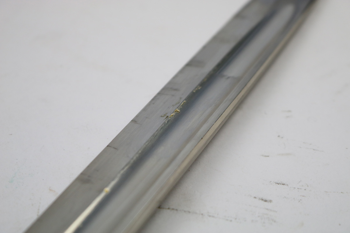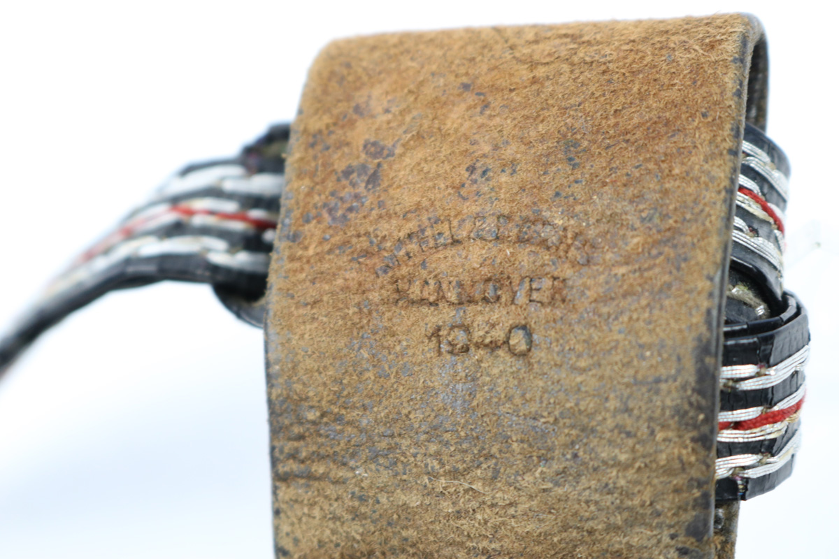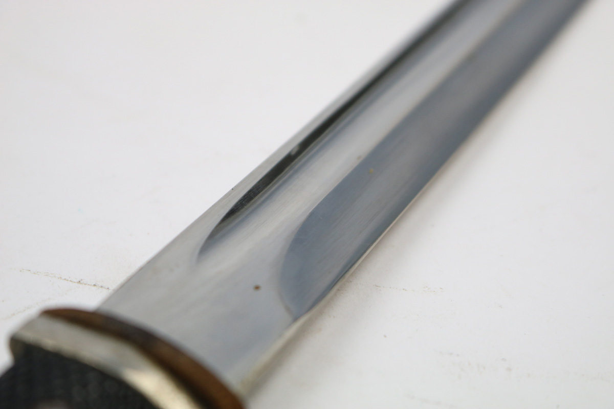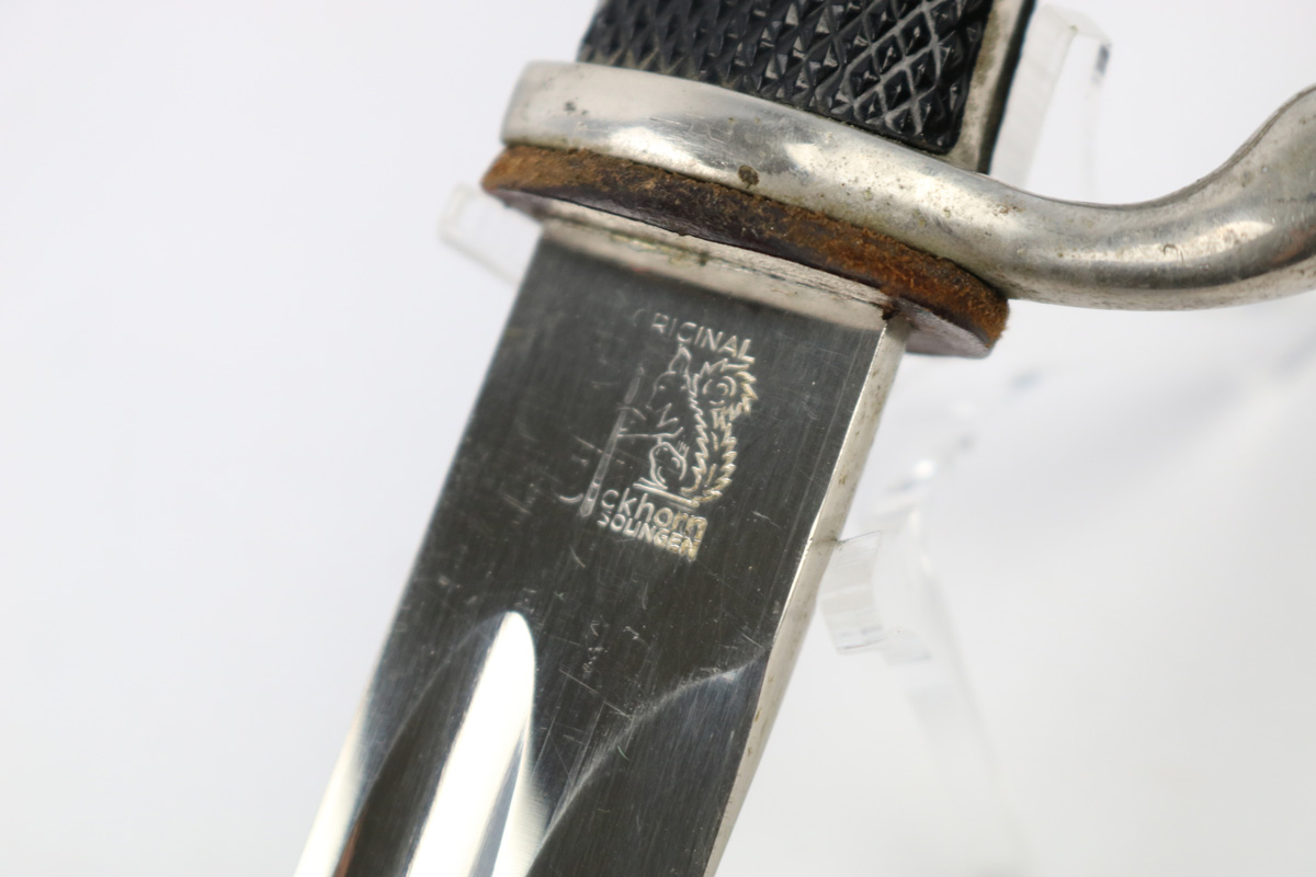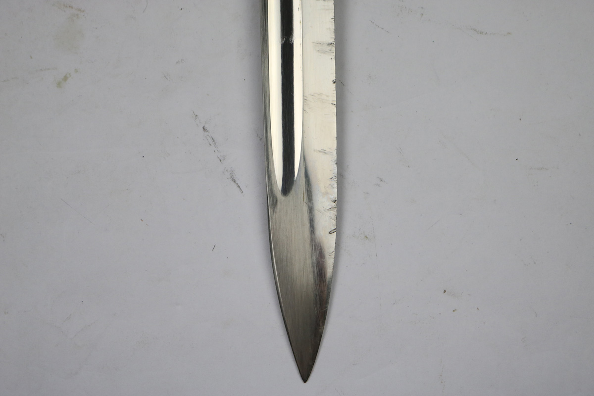 7/18/18 – This is an original WW2 German dress bayonet. The bayonet was made by Eickhorn between 1936 and 1941. The blade is clean and excellent with some minor signs of use / surface scuffing near the blade edge in a few spots. The handle is excellent with no issues. The leather stopper is in tact. Comes with an original scabbard that has normal surface wear but no dents. The leather frog is in tact and original with a 1940 date stamp on the back (the maker is hard to decipher). Comes with a portepee in excellent condition.