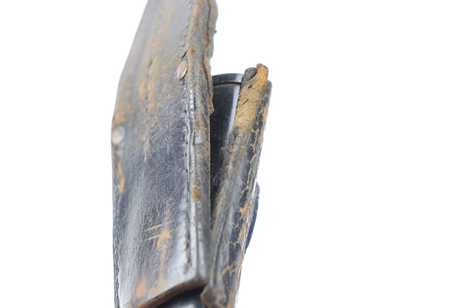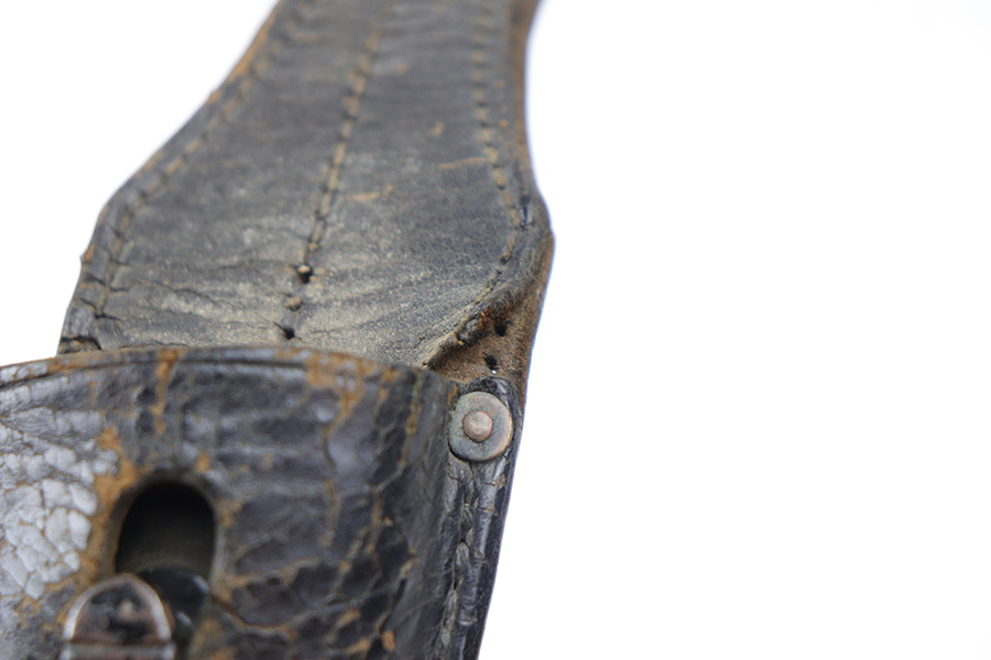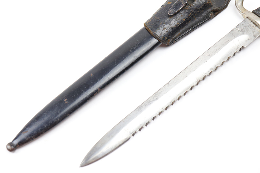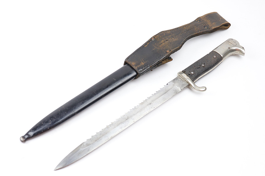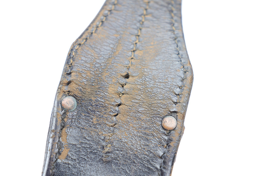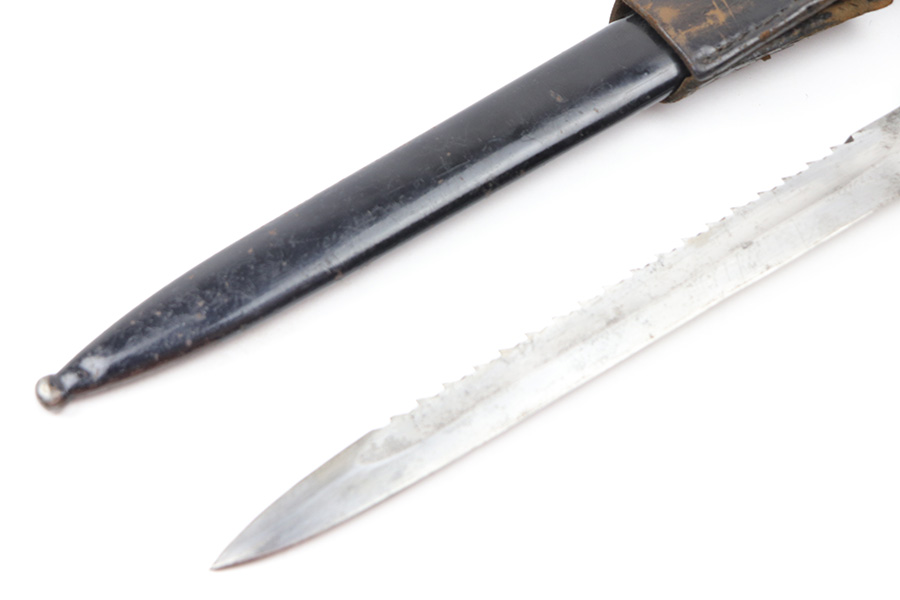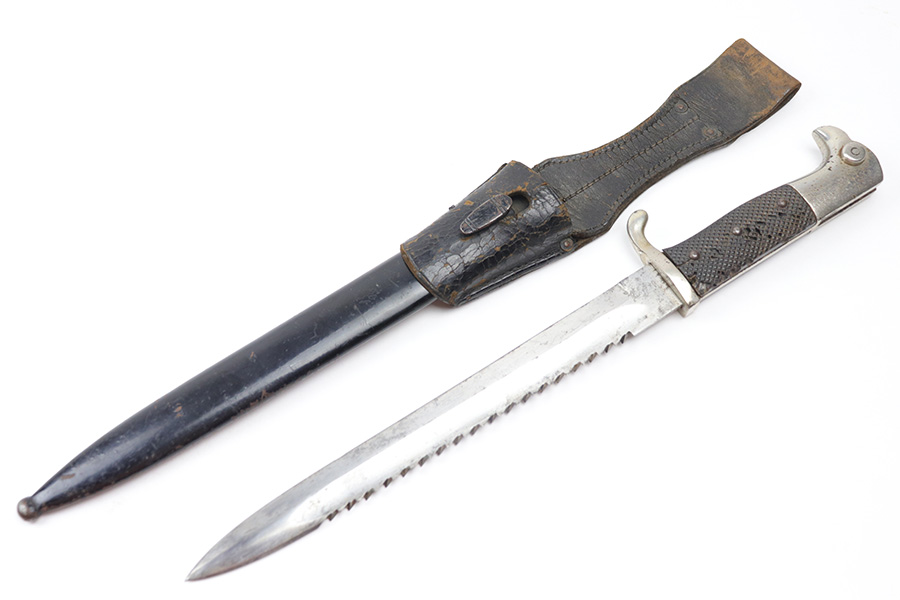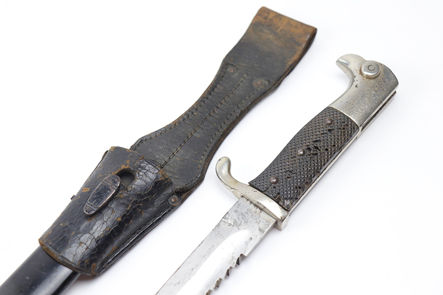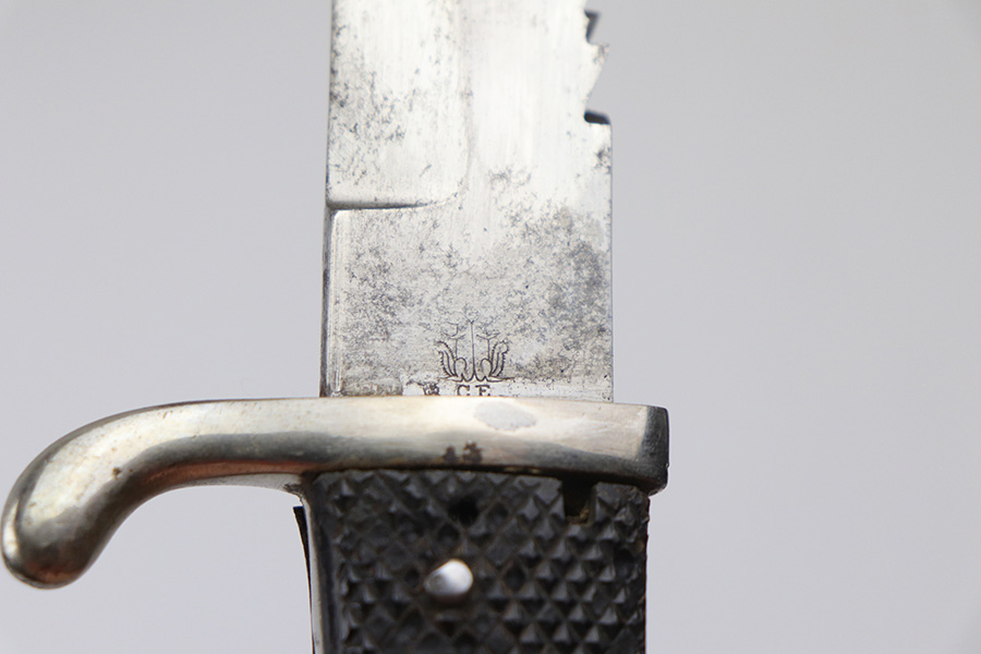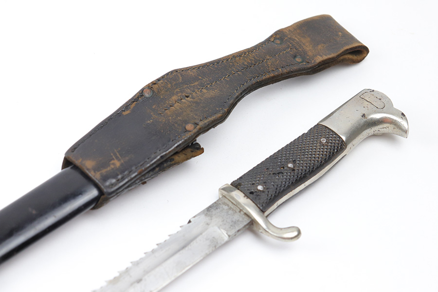 10/22/21 – This is an early Eickhorn production, later WW1 era Sawback rifle bayonet. The bayonet comes with a scabbard and leather frog, as shown. The blade has minor oxidation spots throughout each side, and some mild signs of sharpening / use. There is an Eickhorn maker marking on one side. The handle has various small chips and “chew” marks on each grip panel. The metal pommel has light patina throughout. The scabbard is unmarked with most of the black painted finish in tact. The scabbard has surface wear throughout and a faint maker stamp on the back.