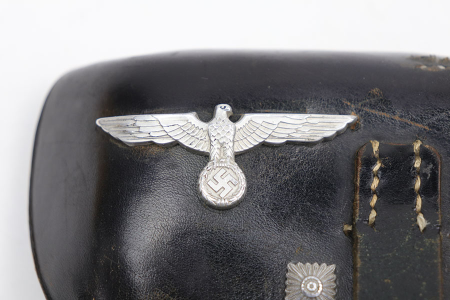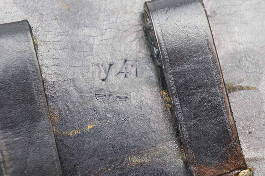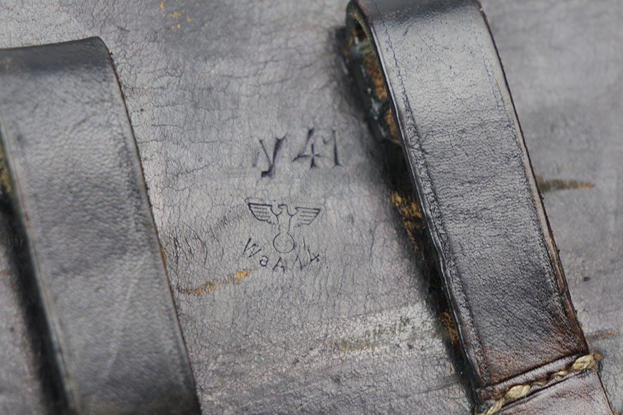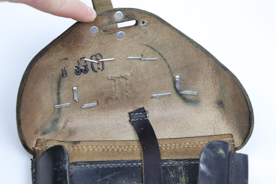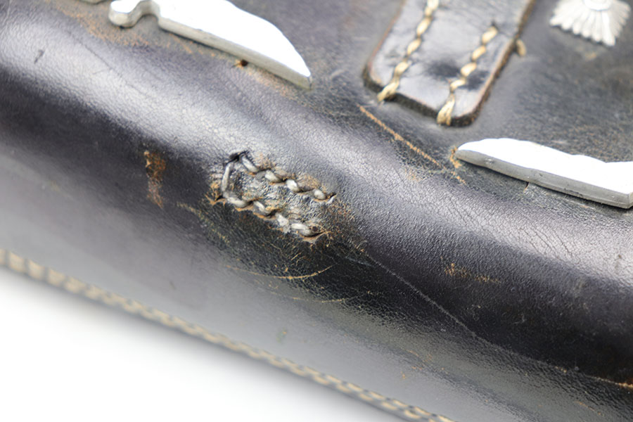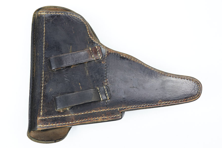 11/23/20 – This is an excellent condition CZ vz. 39 holster. The holster has been embellished on the front leather with German uniform tabs, as shown. The aluminum tabs / embellishments are original. The black leather is very clean and strong with minimal pliability. The stitching is all in tact although there appears to be replacement stitching on the lift strap – see photos. This is a very minor flaw on an otherwise clean, excellent holster. Ink stamped on the interior leather. Maker stamped and dated on the back leather.
