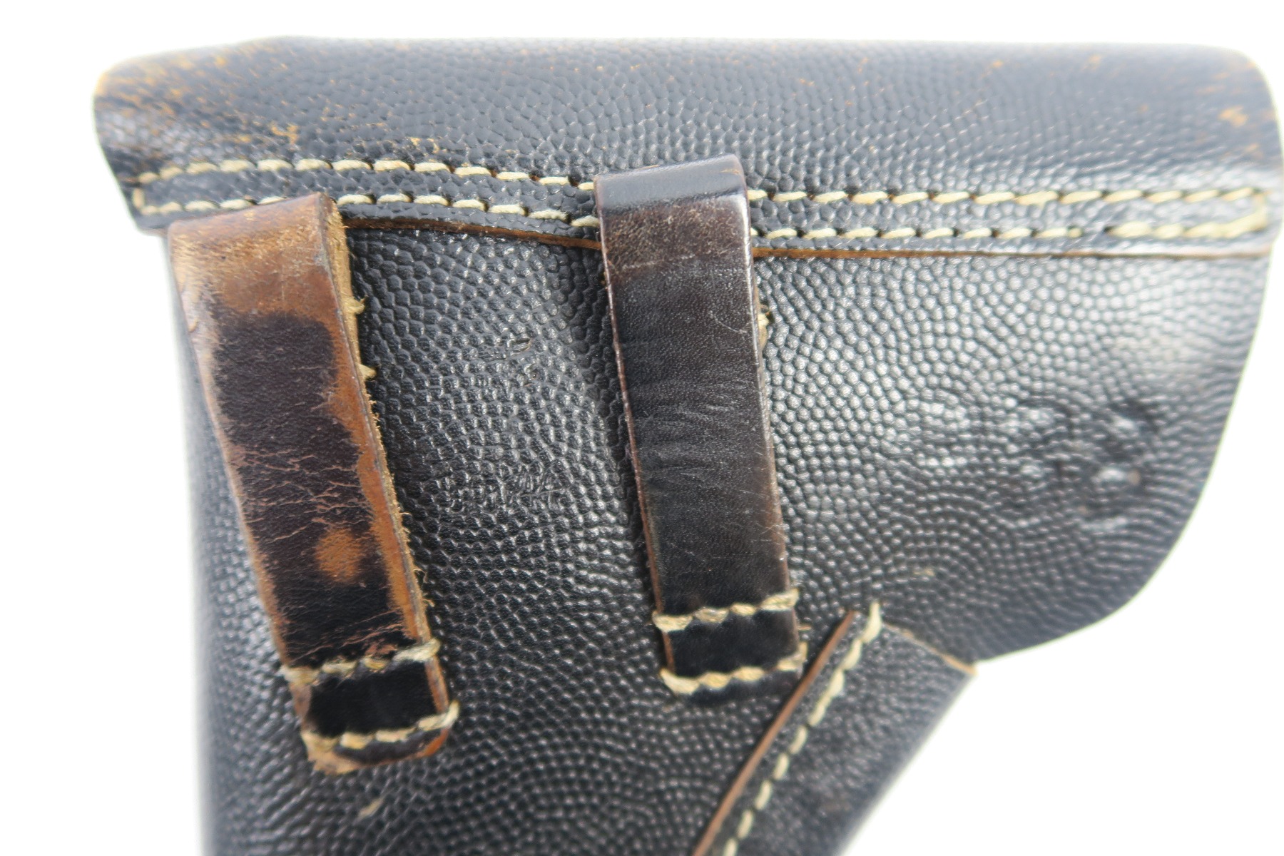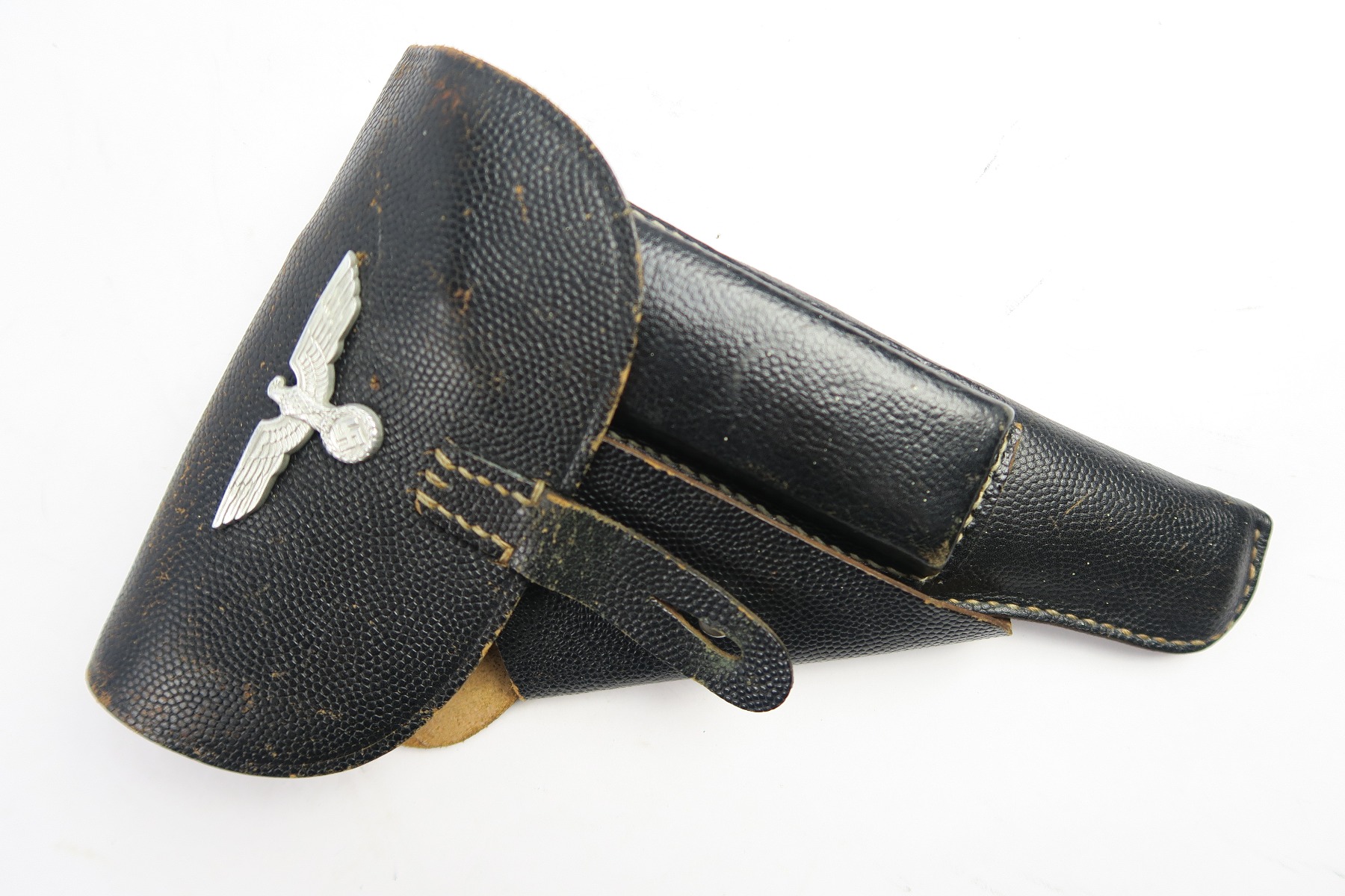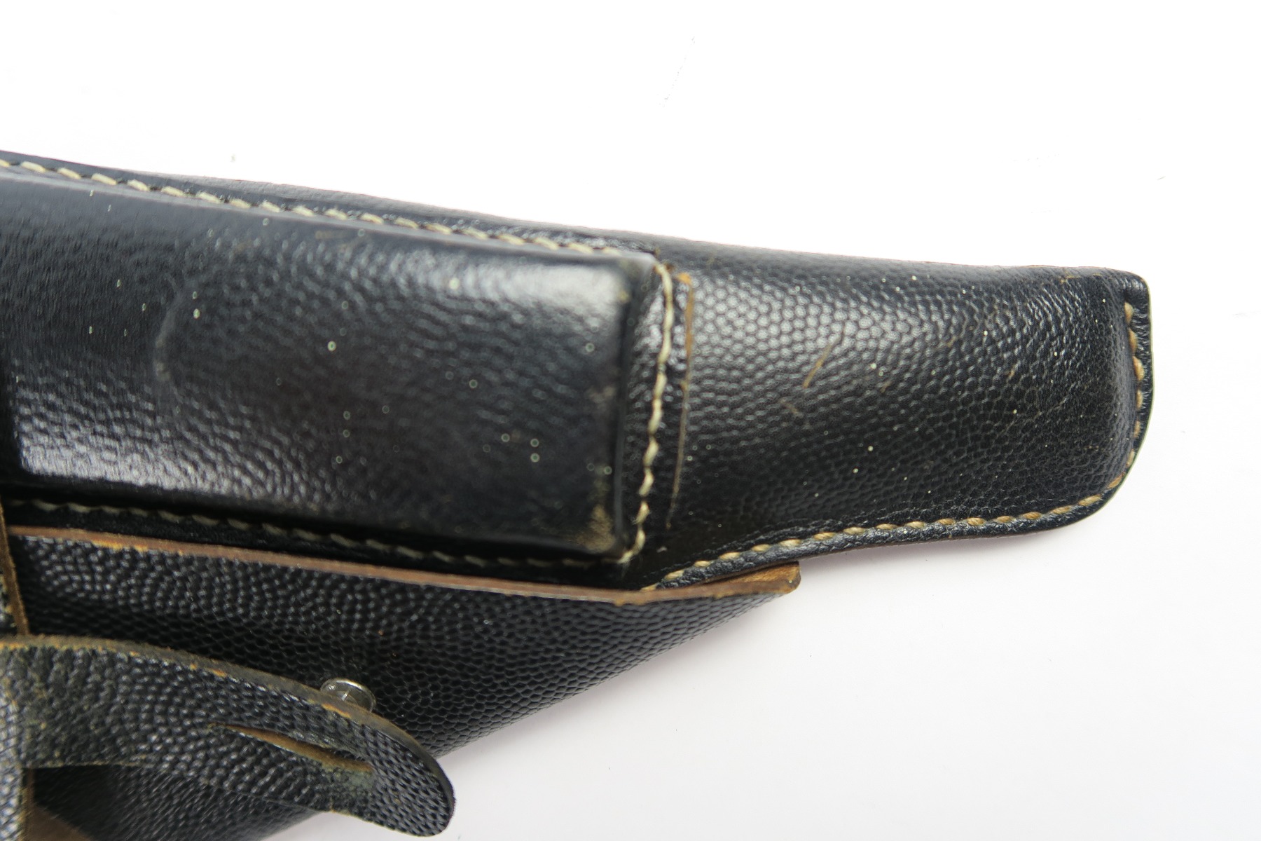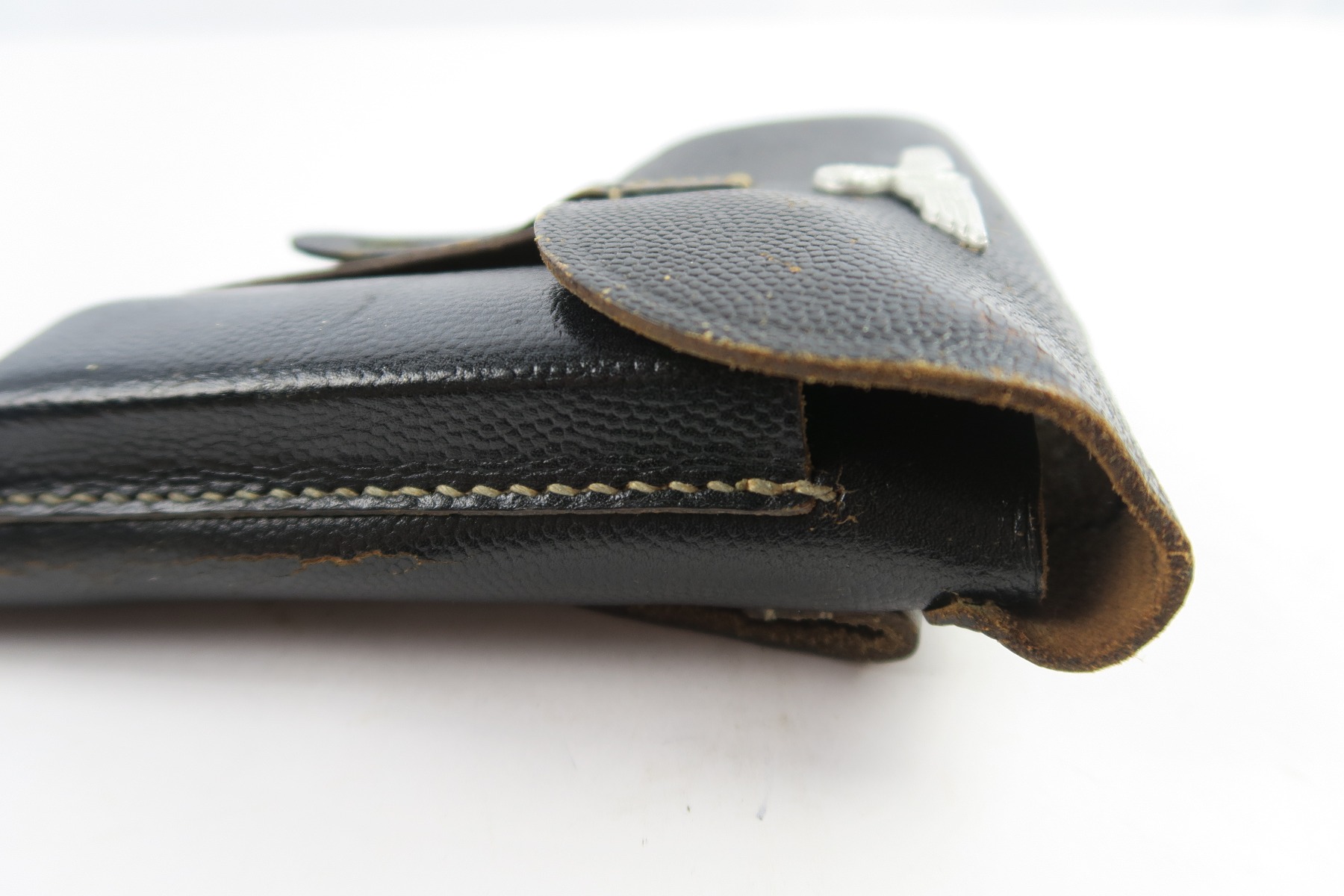 4/27/18 – This is an original soft shell P.38 holster from the end of WW2. The holster is pebble grain leather with a nazi army uniform pin stuck into the front leather. GIs often did this as they looted the Germans. The holster is in great condition overall with soft and pliable leather, but overall it’s clean. The stitching is all in tact and original as well. The back leather is “bml” maker stamped and 1944 dated with a waffen eagle military proof and P.38 stamp. Guaranteed original and authentic.
