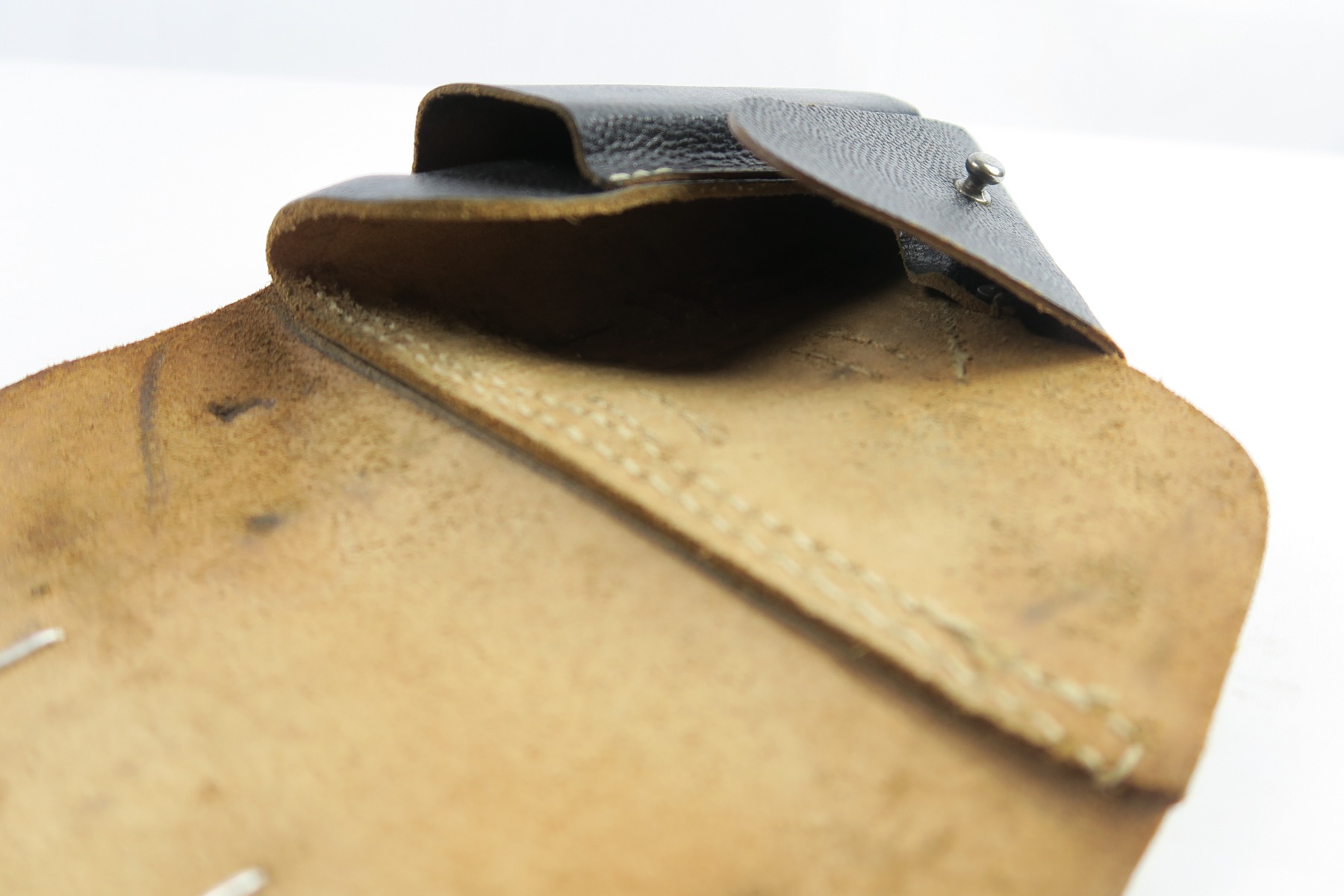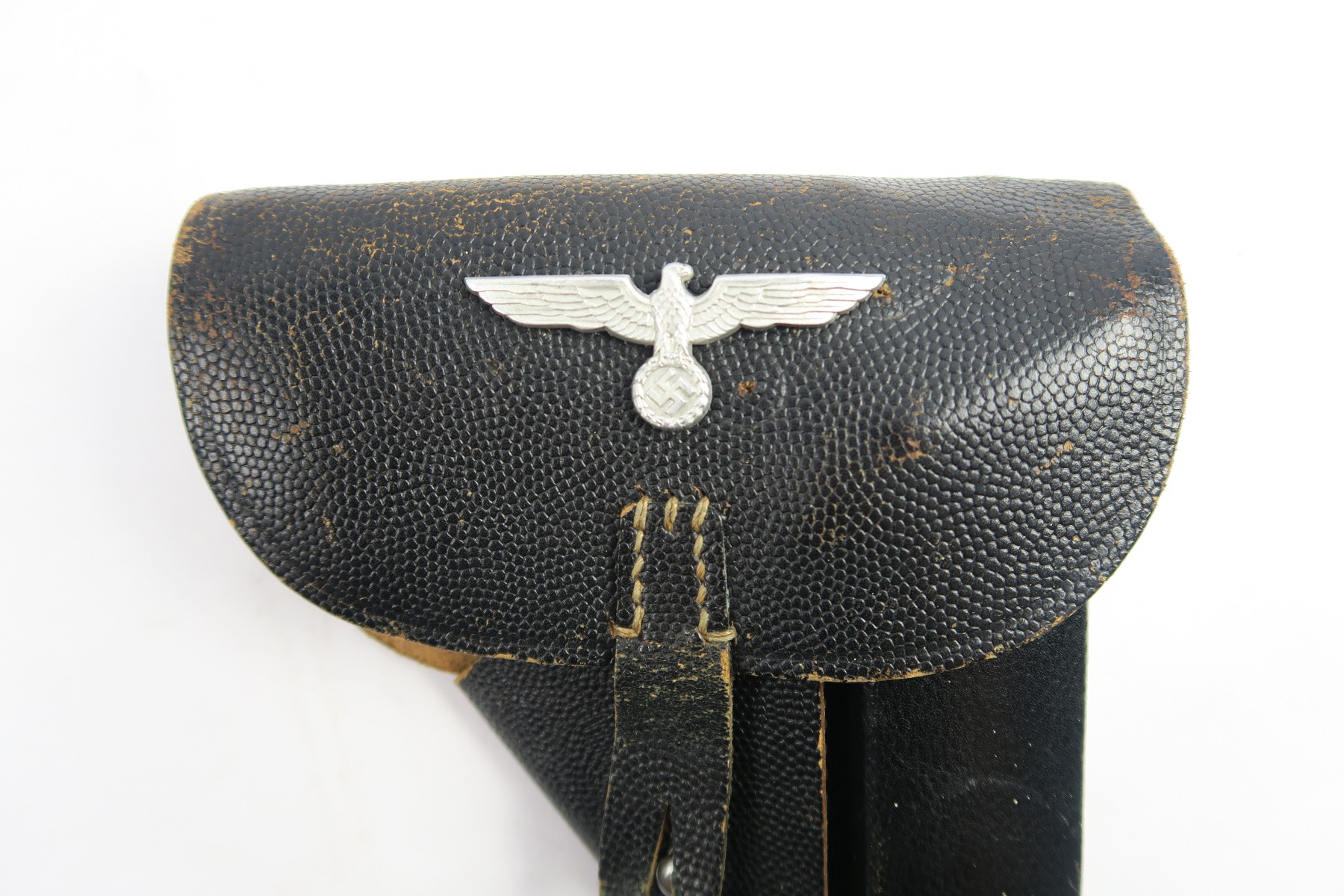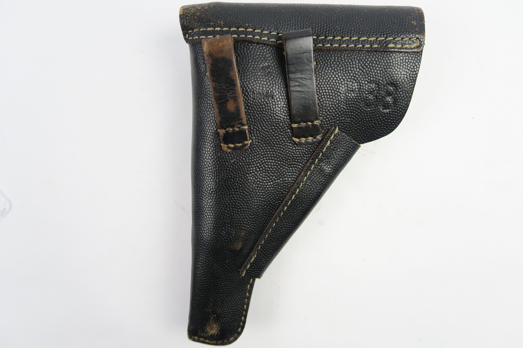 4/27/18 – This is an original soft shell P.38 holster from the end of WW2. The holster is pebble grain leather with a nazi army uniform pin stuck into the front leather. GIs often did this as they looted the Germans. The holster is in great condition overall with soft and pliable leather, but overall it’s clean. The stitching is all in tact and original as well. The back leather is “bml” maker stamped and 1944 dated with a waffen eagle military proof and P.38 stamp. Guaranteed original and authentic.