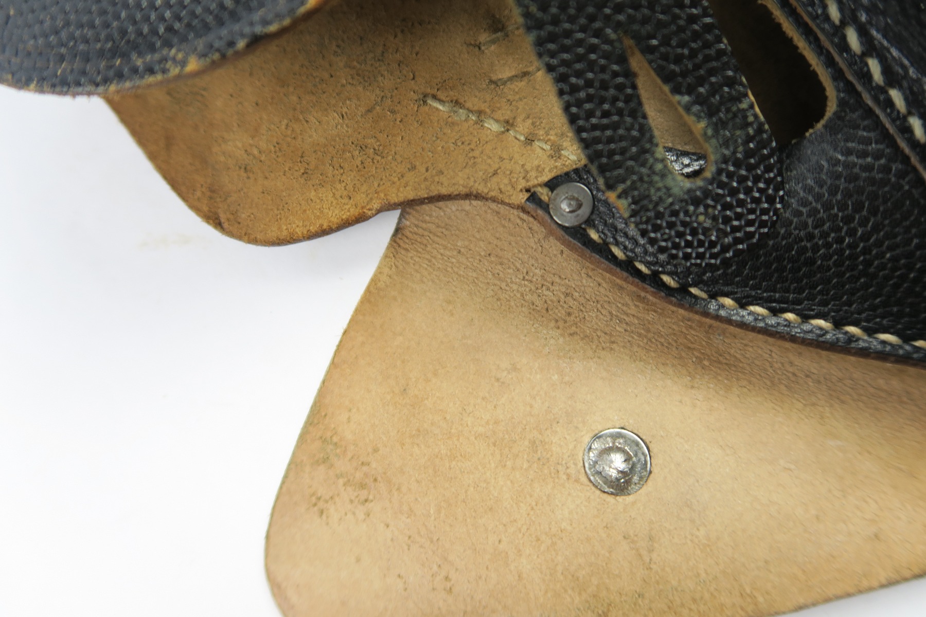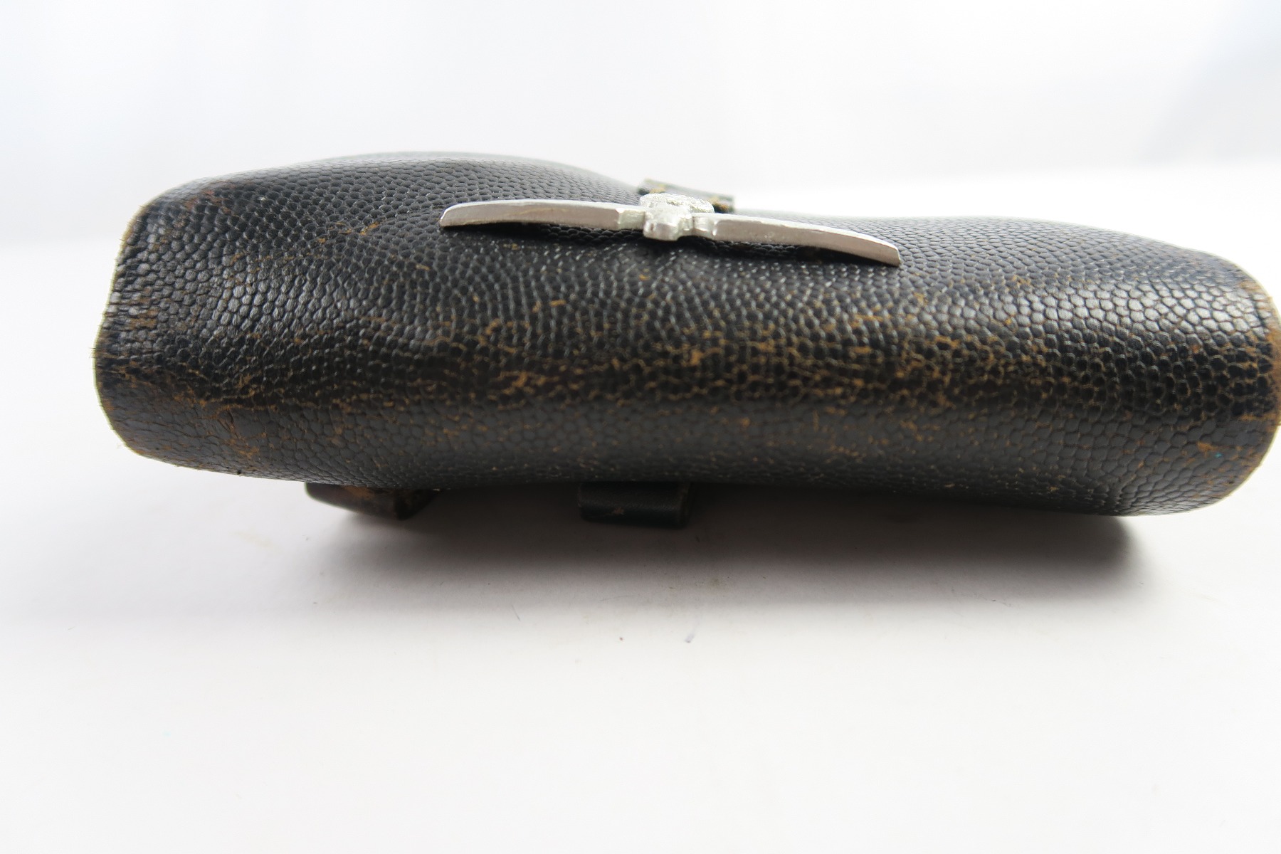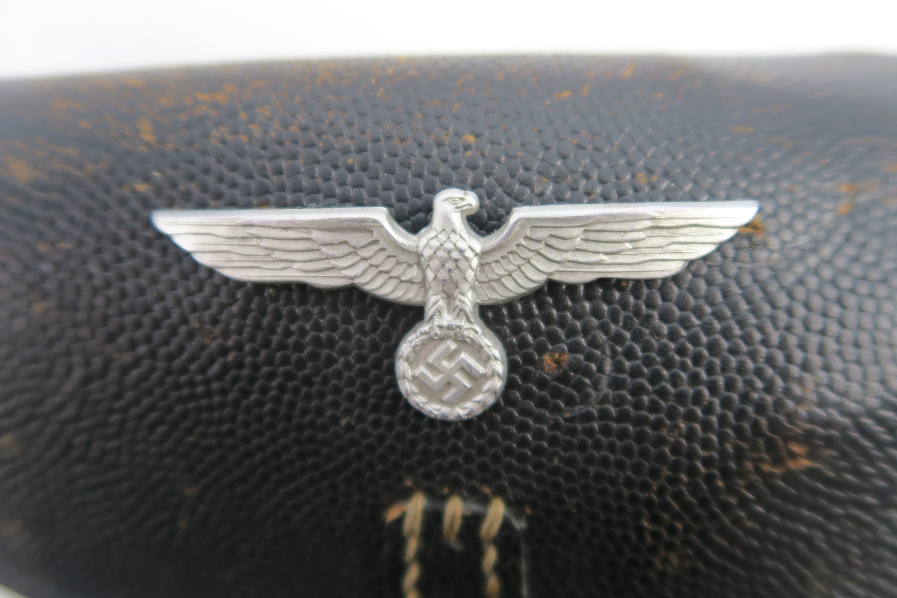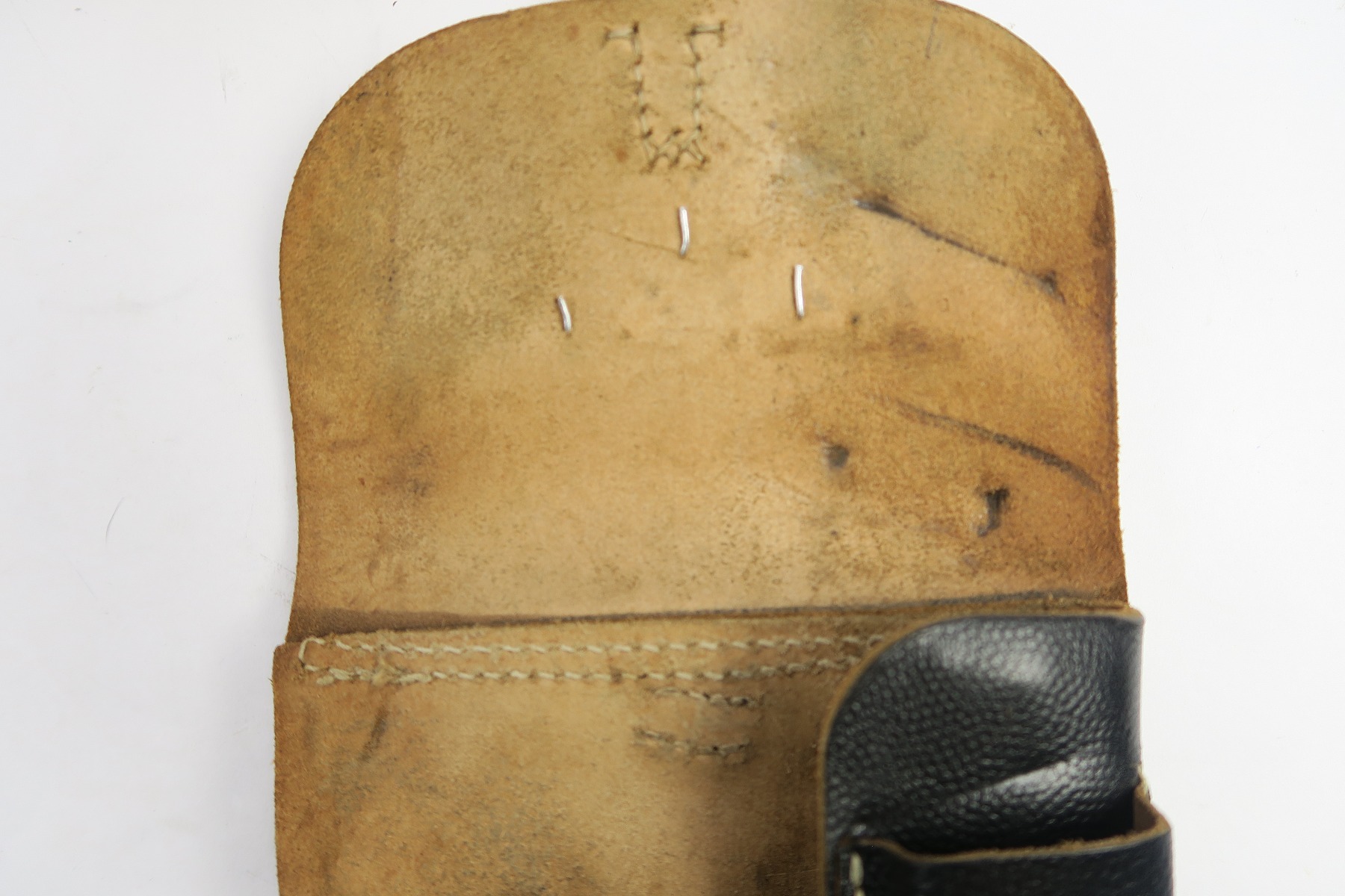 4/27/18 – This is an original soft shell P.38 holster from the end of WW2. The holster is pebble grain leather with a nazi army uniform pin stuck into the front leather. GIs often did this as they looted the Germans. The holster is in great condition overall with soft and pliable leather, but overall it’s clean. The stitching is all in tact and original as well. The back leather is “bml” maker stamped and 1944 dated with a waffen eagle military proof and P.38 stamp. Guaranteed original and authentic.