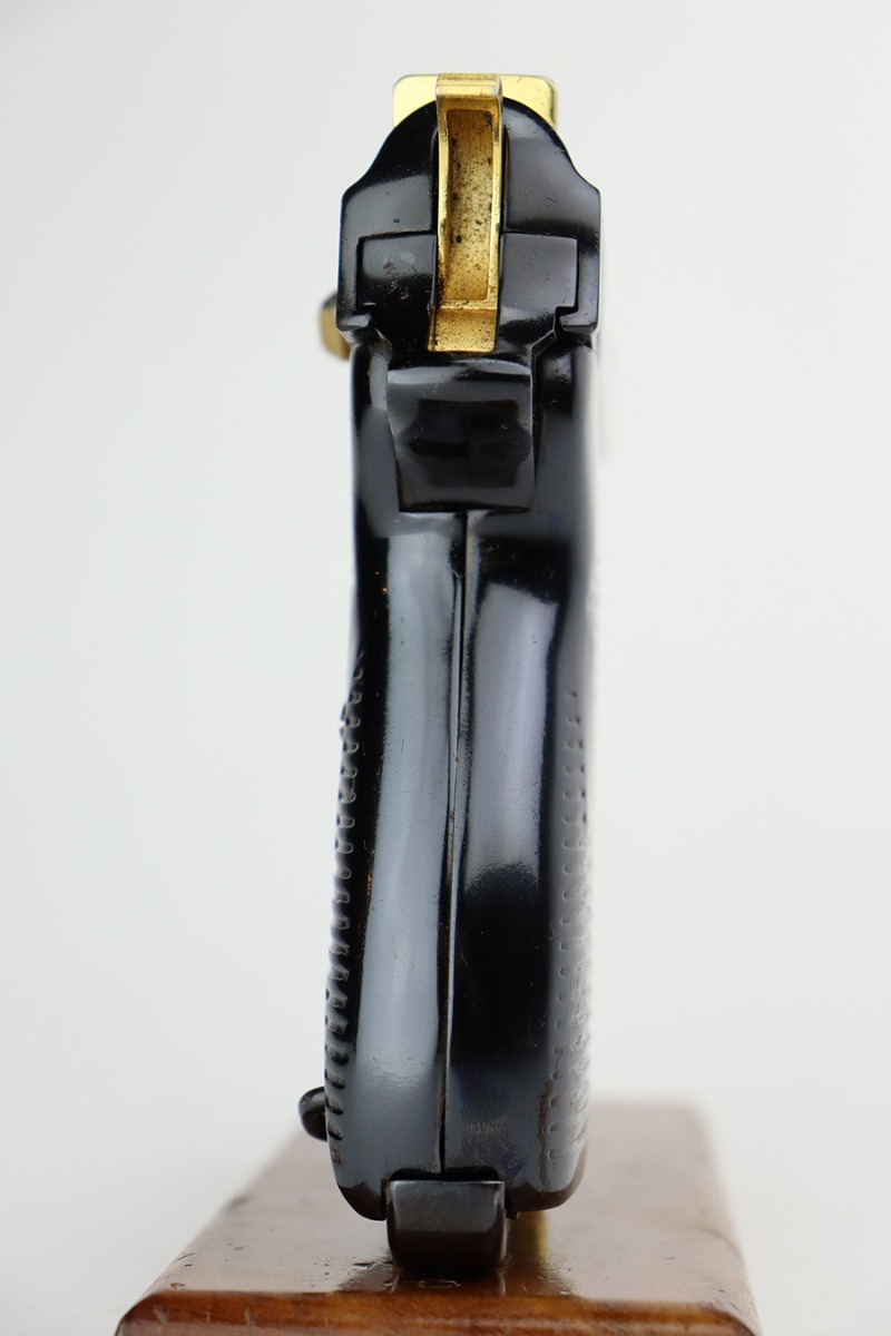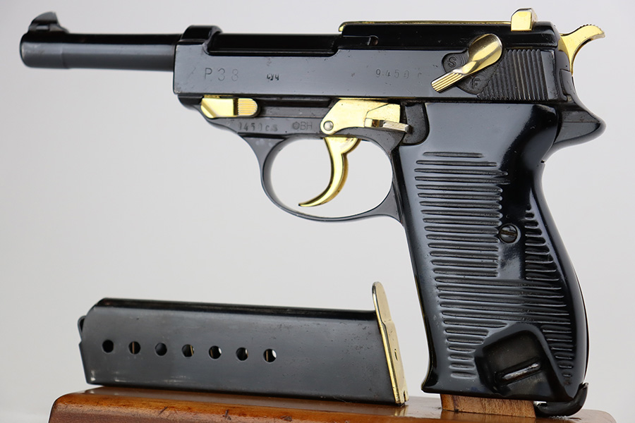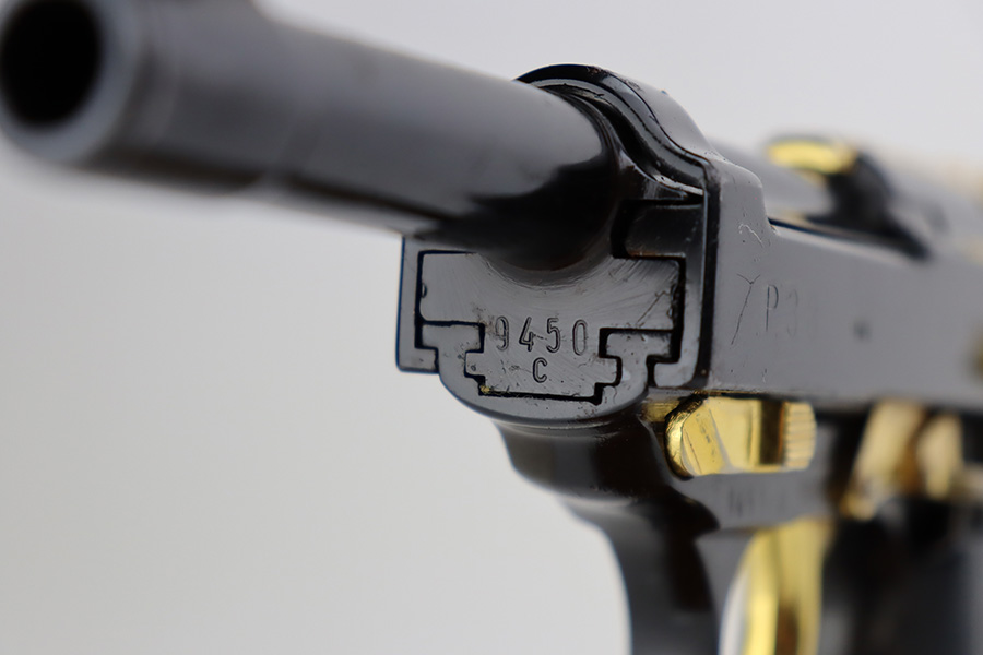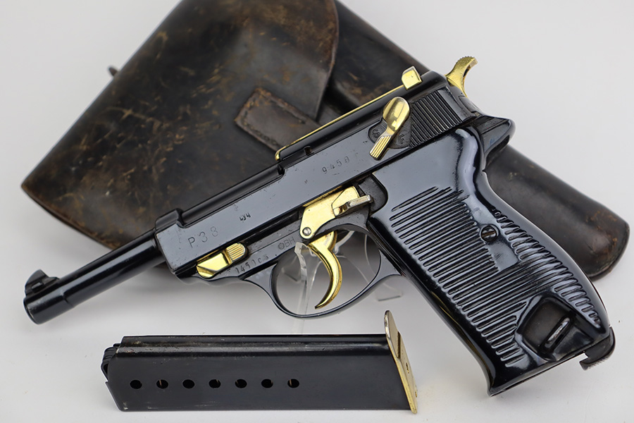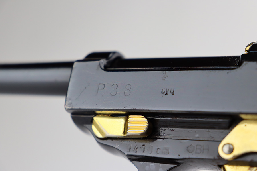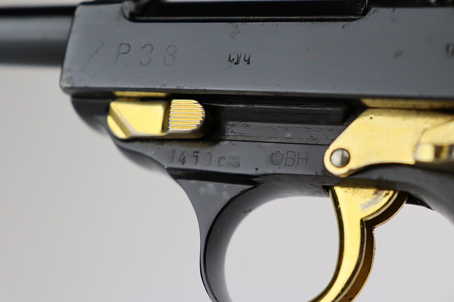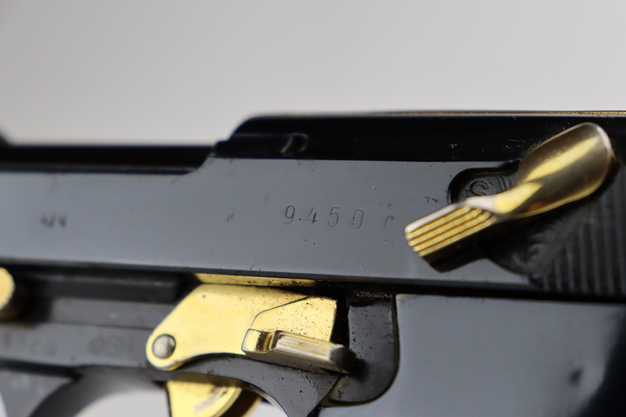 8/8/23 – This is a nice example of a Spreewerk P.38 originally issued to the Nazi military in June of 1943. Import mark on the right side of the frame. There is an “Eagle BH” marking on the left side of the frame, indicating it was issued to the Austrian military after the war. It comes as a rig with a 1960-dated magazine and a post war holster. The holster has been modified to accept a belt clip. There is an ink stamp on the inside that appears to be dated 1957. The entire gun has been refinished. Most of the parts are blued, but the small parts have a nice gold-colored wash. Fitted with blackish metal grips. There is not much actual finish loss, but there is an obvious area of spotty discoloration and minor pitting on the right side of the slide. The bore has decent rifling, but there is minor pitting throughout. De-cocker is functional.