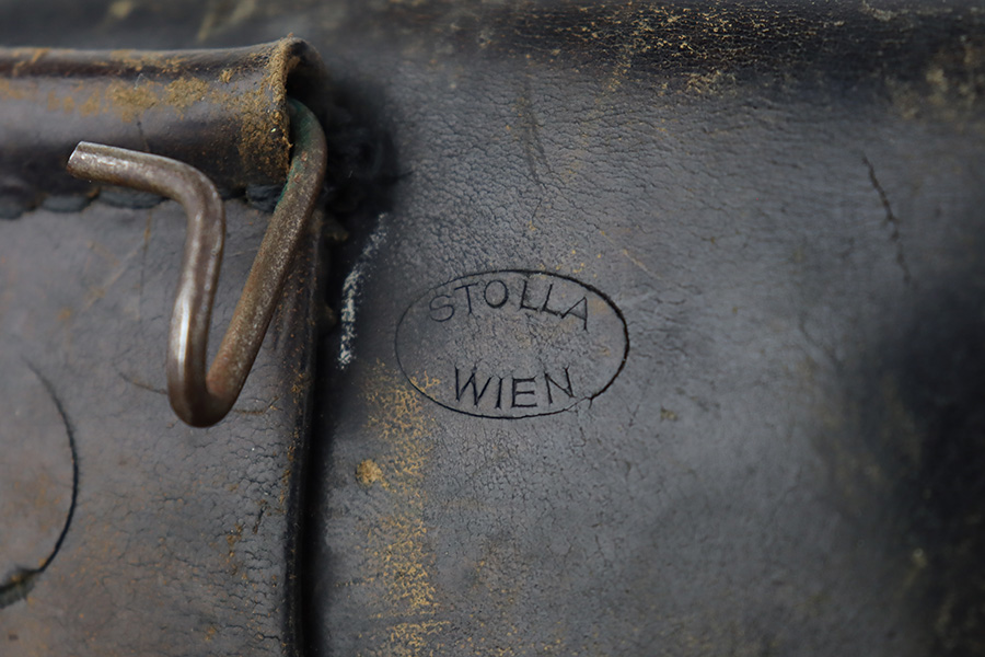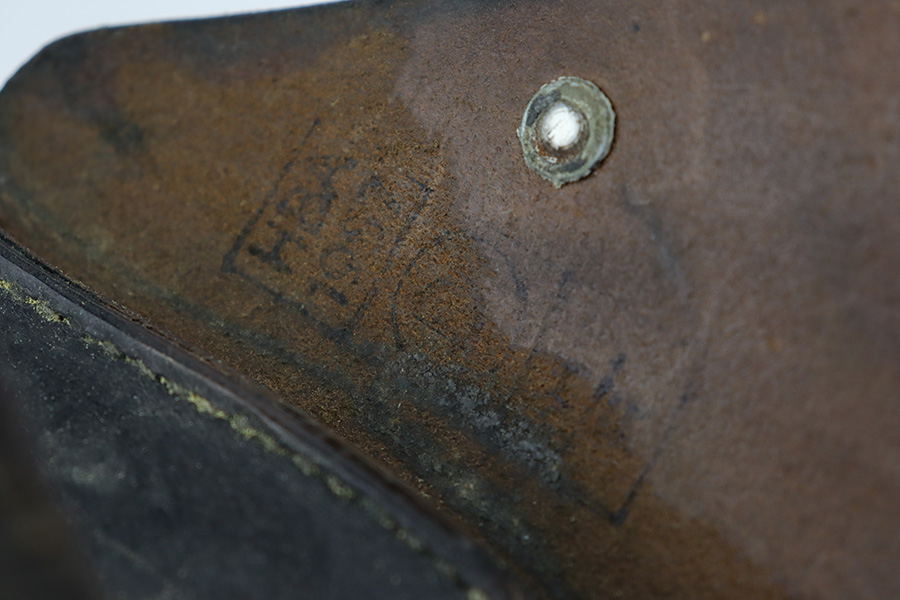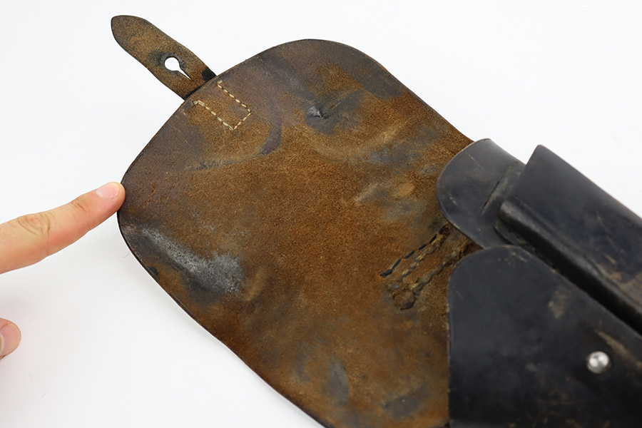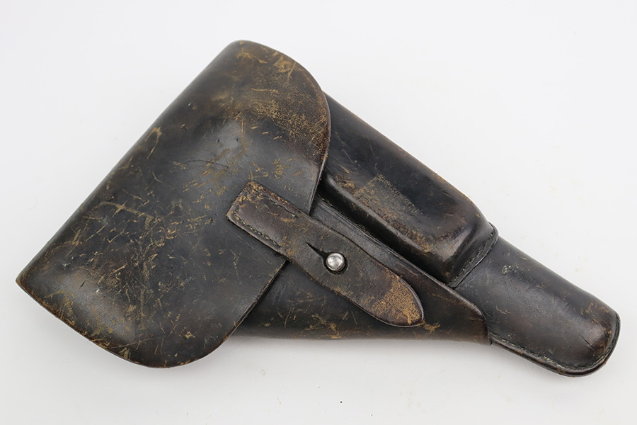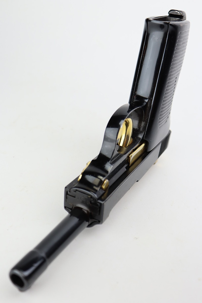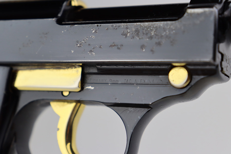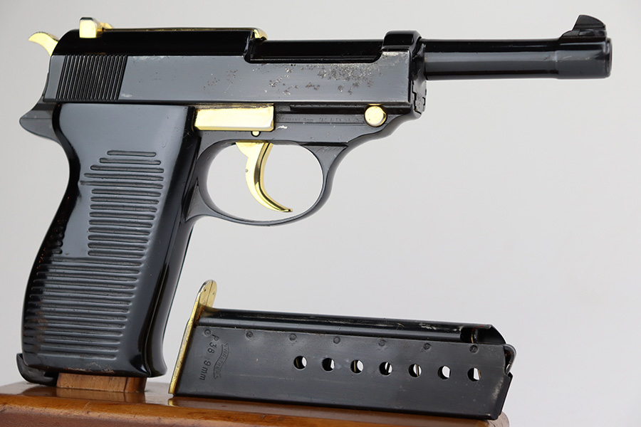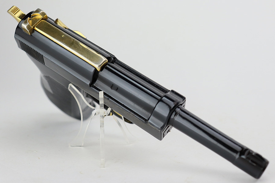 8/8/23 – This is a nice example of a Spreewerk P.38 originally issued to the Nazi military in June of 1943. Import mark on the right side of the frame. There is an “Eagle BH” marking on the left side of the frame, indicating it was issued to the Austrian military after the war. It comes as a rig with a 1960-dated magazine and a post war holster. The holster has been modified to accept a belt clip. There is an ink stamp on the inside that appears to be dated 1957. The entire gun has been refinished. Most of the parts are blued, but the small parts have a nice gold-colored wash. Fitted with blackish metal grips. There is not much actual finish loss, but there is an obvious area of spotty discoloration and minor pitting on the right side of the slide. The bore has decent rifling, but there is minor pitting throughout. De-cocker is functional.