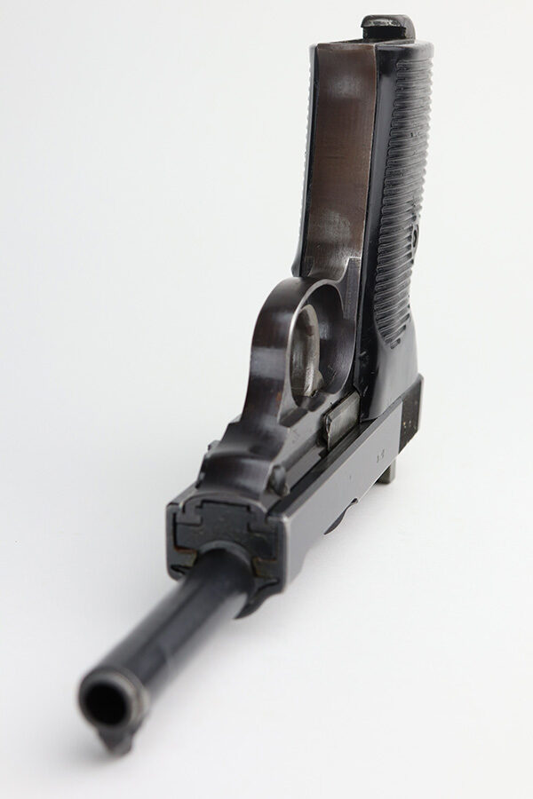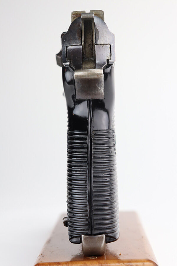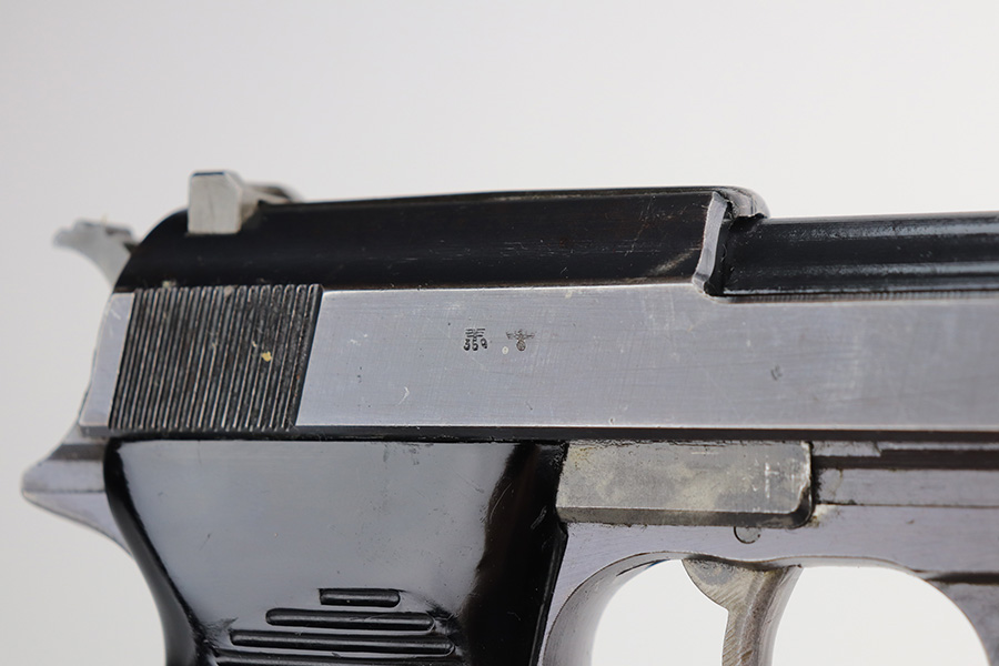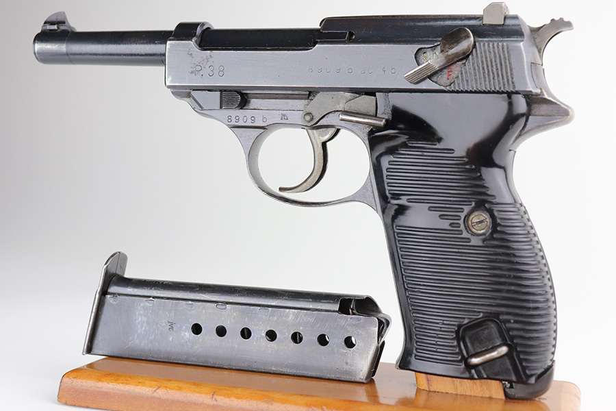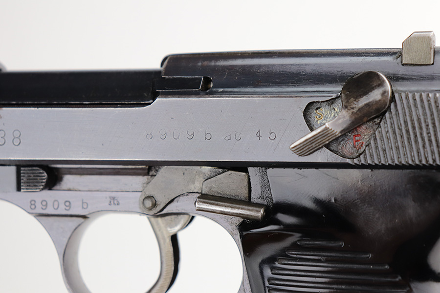8/16/21 – This is a very nice example of an AC 45 Walther P.38 made at the very end of WW2. It is all matching and has only one “Eagle 359” military proof on the right side of the barrel, indicating it was never actually issued to the Nazi military. This one has a late-war cog hammer and a mixture of phosphate small parts, typical of end-of-war guns. This one also has a rare FNH barrel. It has retained about 91-92% of its original finish. Most of the finish loss is on the front strap where there is also some brown patina. There is minor wear on the high edges of the slide and around the muzzle. Some light scratches and minor spotty wear on the right side of the slide. Comes with excellent grips and a period-correct magazine. Minty bore. De-cocker is functional.