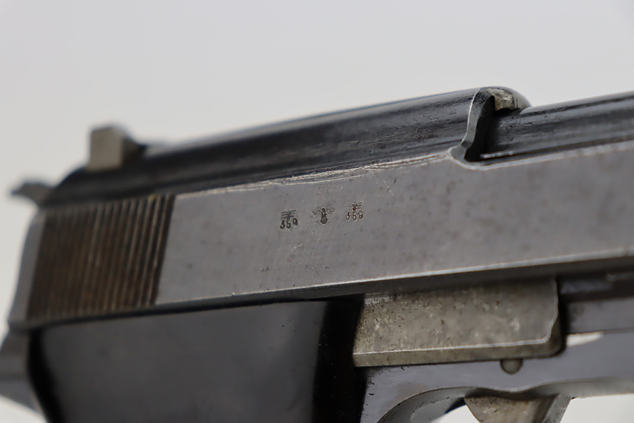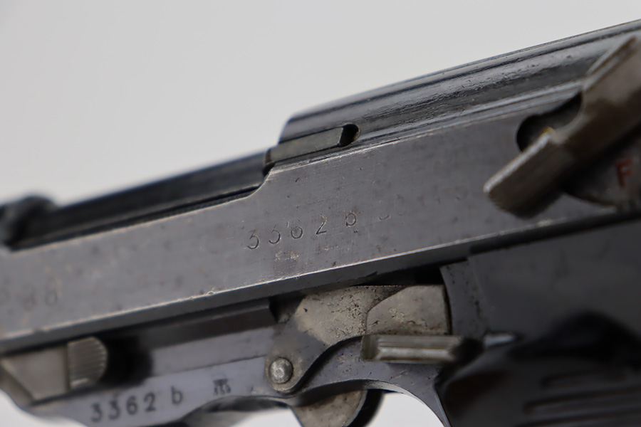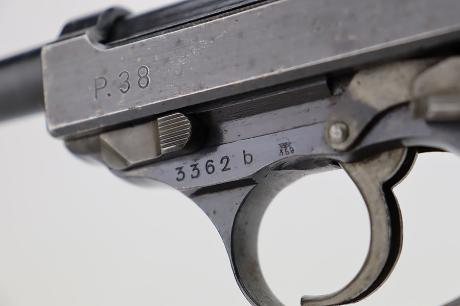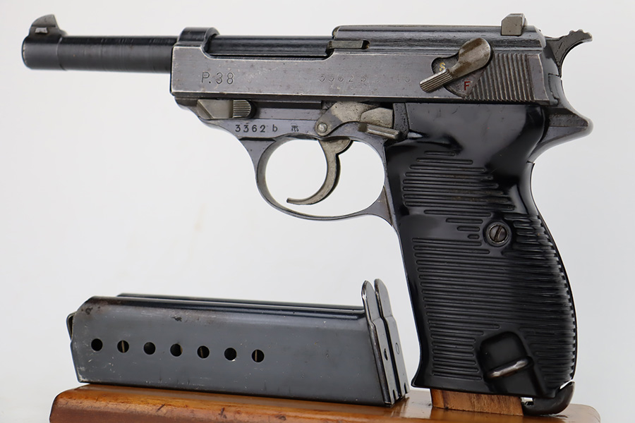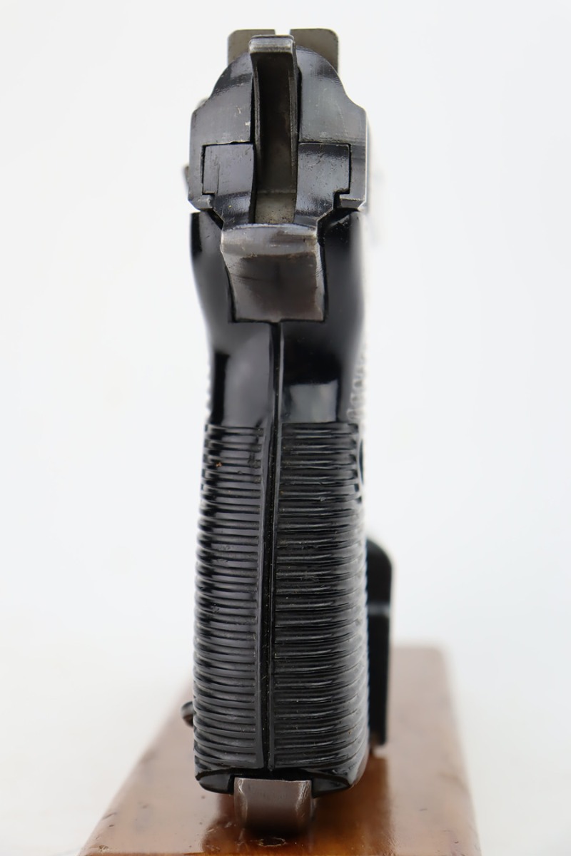 10/18/23 – This is an excellent example of an end-of-war AC 45 Walther P.38 issued to the Nazi military in 1945. It is all matching and has the proper “Eagle 359” military acceptance proofs. This one has a rare “Waffen 76” marked barrel, indicating it was made at the Czech FNH factory. It has all the proper late-war features, such as rough machining, cog-style hammer, and phosphate small parts. The bluing rates about 96% with very minor wear around the muzzle and on the front edges of the slide. Light spotty oxidation along both sides of the slide. Fitted with black plastic grips. Stone-mint bore. De-cocker is functional. Comes as a rig with a very nice soft shell holster, one “Eagle 359” marked Walther magazine, and one jvd magazine.