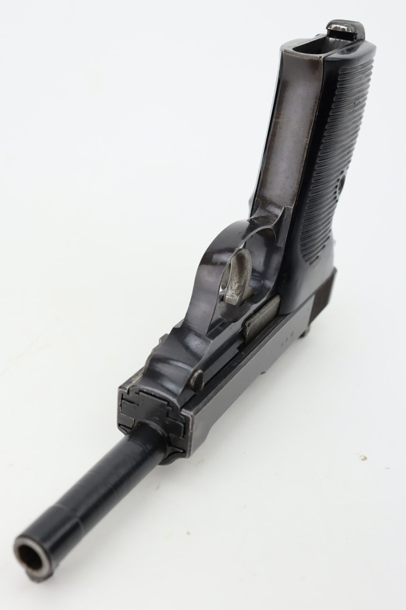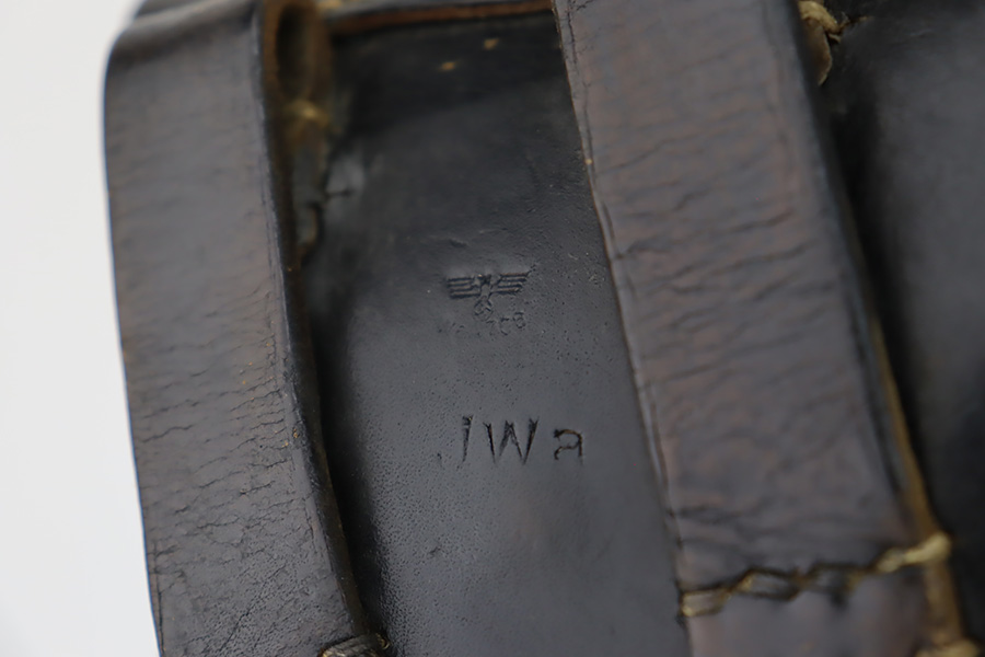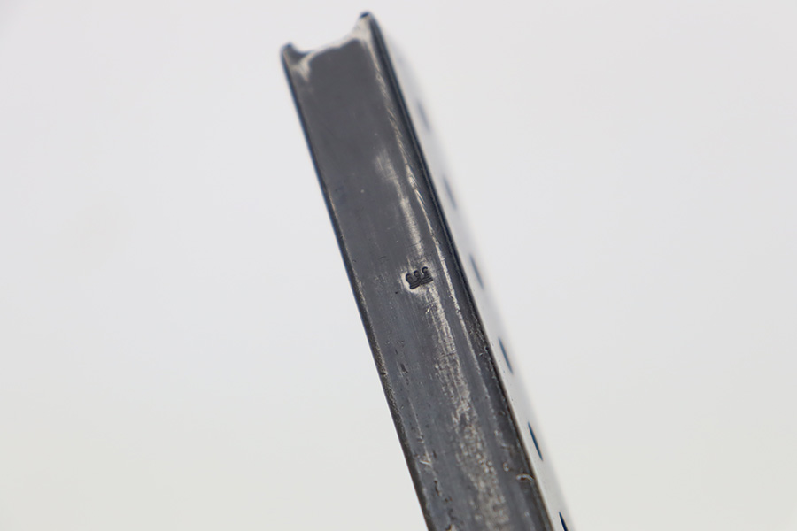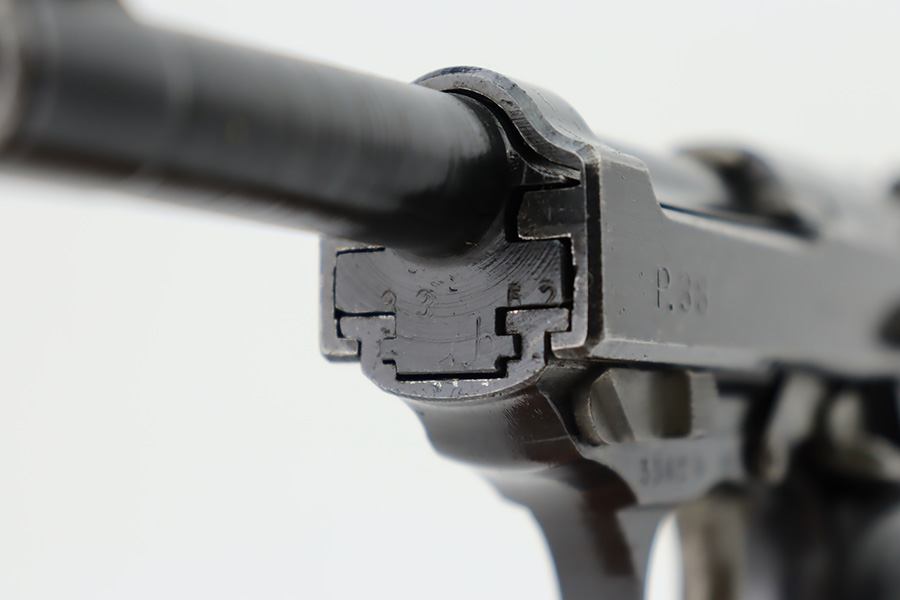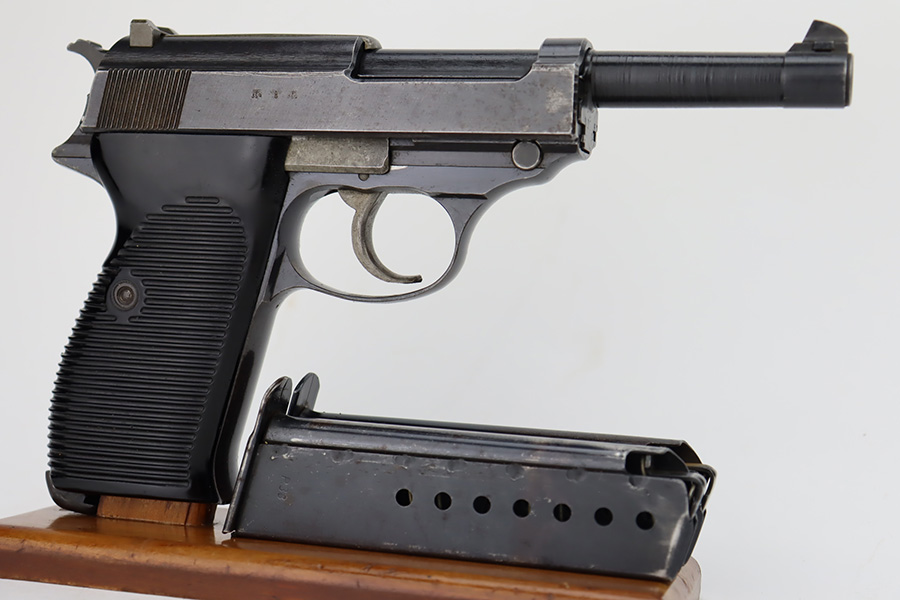 10/18/23 – This is an excellent example of an end-of-war AC 45 Walther P.38 issued to the Nazi military in 1945. It is all matching and has the proper “Eagle 359” military acceptance proofs. This one has a rare “Waffen 76” marked barrel, indicating it was made at the Czech FNH factory. It has all the proper late-war features, such as rough machining, cog-style hammer, and phosphate small parts. The bluing rates about 96% with very minor wear around the muzzle and on the front edges of the slide. Light spotty oxidation along both sides of the slide. Fitted with black plastic grips. Stone-mint bore. De-cocker is functional. Comes as a rig with a very nice soft shell holster, one “Eagle 359” marked Walther magazine, and one jvd magazine.