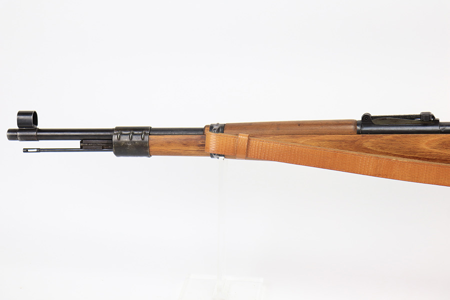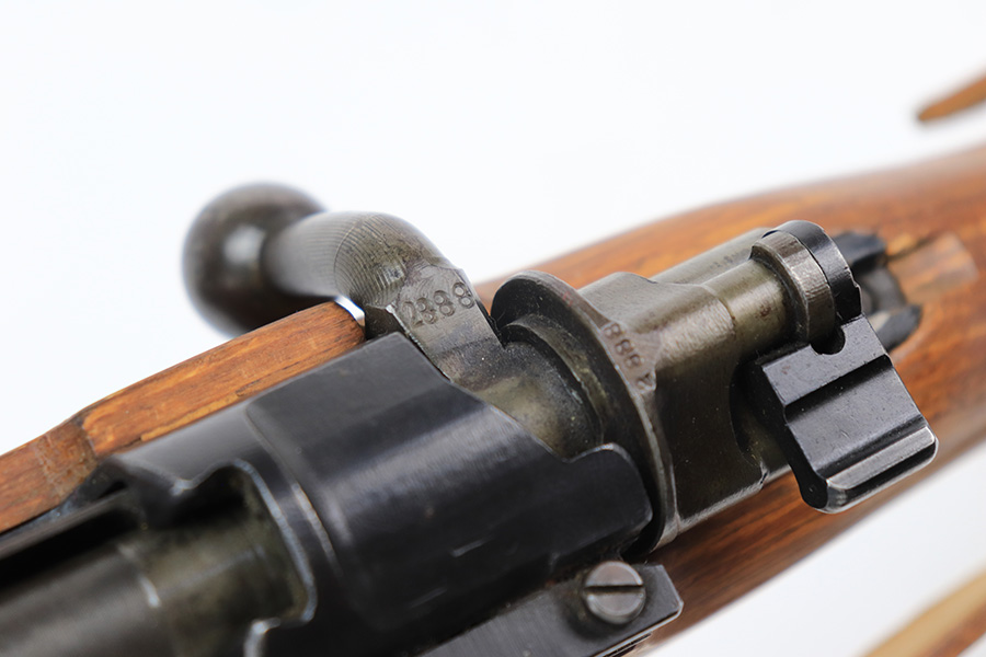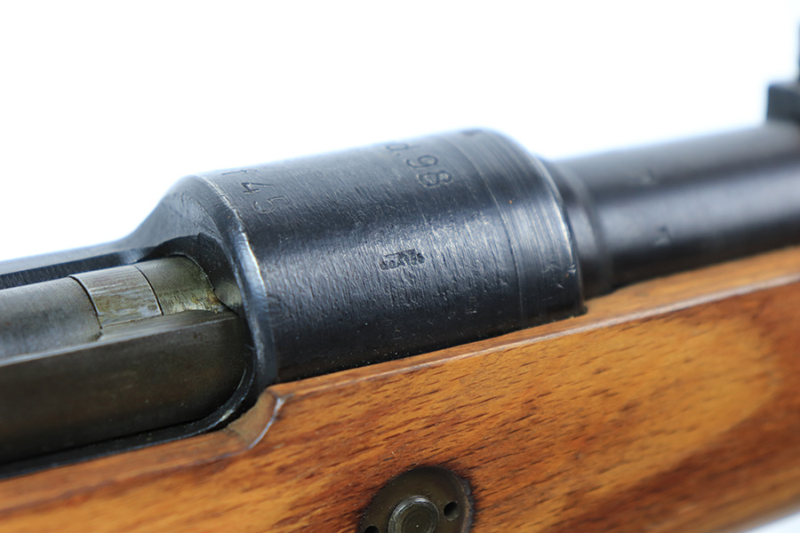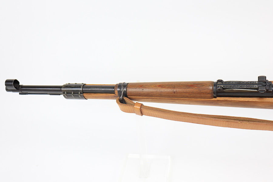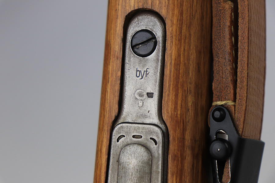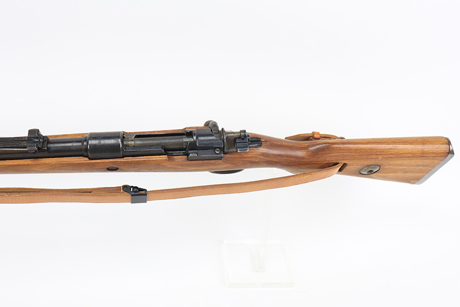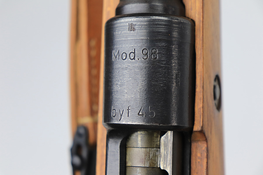 4/1/22 – This is a late WW2 production Mauser K98. The rifle features late war features and an attractive blonde stock. The receiver is BYF 45 stamped, and numbered 42888. The bolt assembly is matching numbered “2888” and has a desirable phosphate finish on parts of the bolt assembly, as shown. Unfortunately, the stock is not matching numbered to the gun (mis-matched internally, and an unmarked hand guard). The wood is excellent throughout however with a waffen proof stamp on the right side of the buttstock. The front barrel band is also mis-matched (4388) but at least has the last two digits correct. Various other small parts are waffen eagle 135 or BYF proof stamped, which is correct for these last-ditch examples. The bore rates 7.5/10 with strong rifling throughout and normal patina / signs of aging within the grooves. Also comes with a reproduction leather K98 sling.