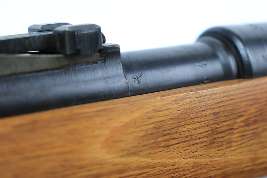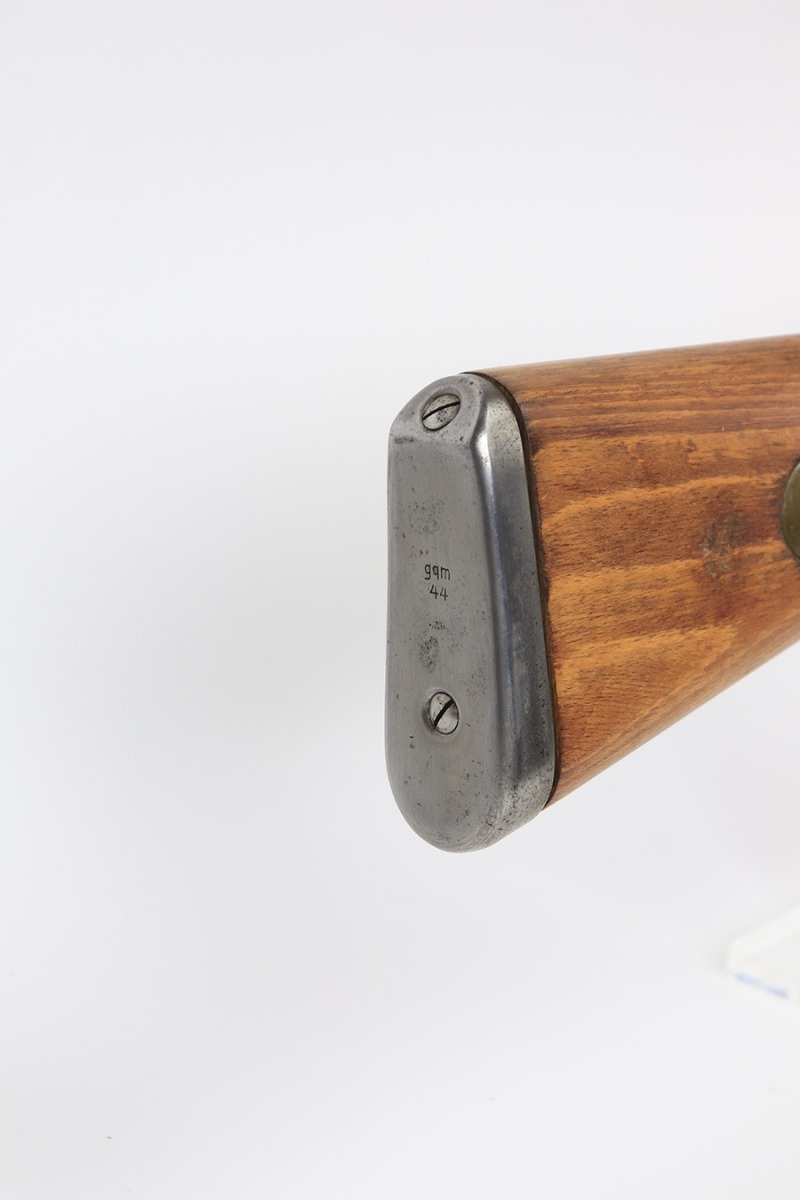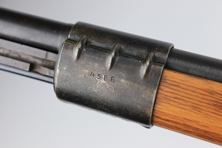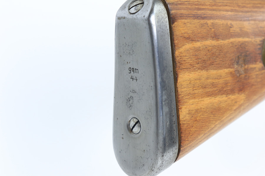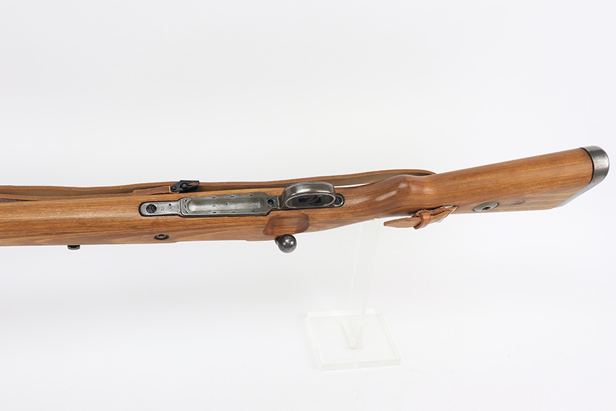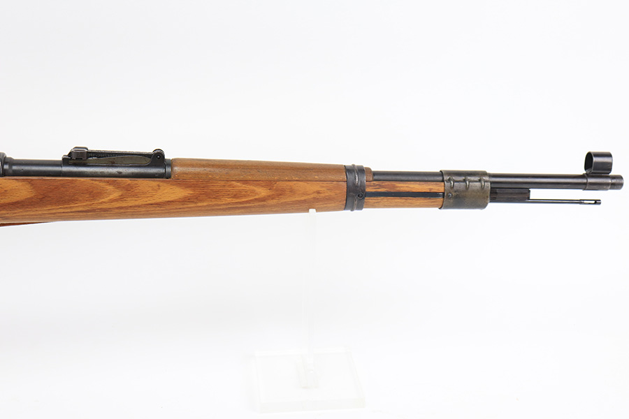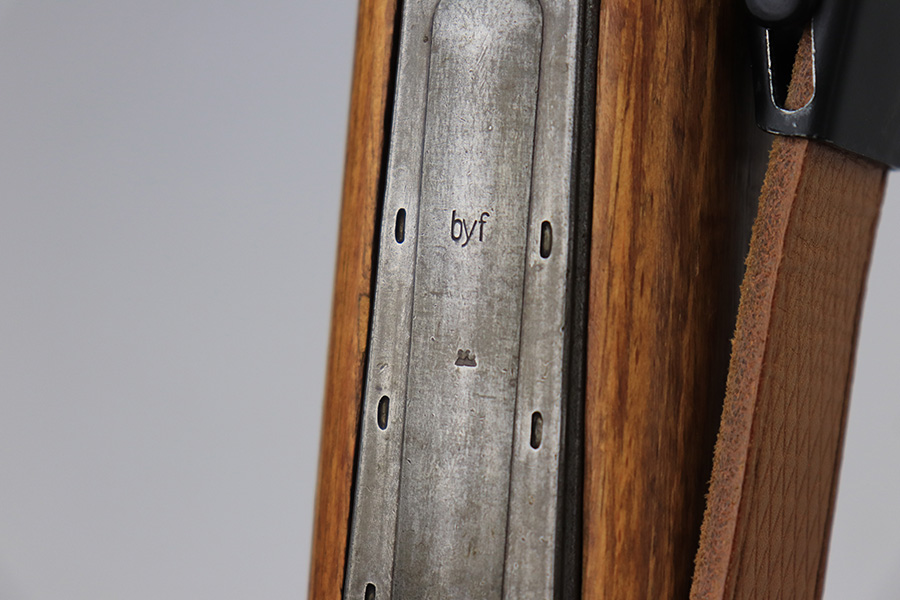 4/1/22 – This is a late WW2 production Mauser K98. The rifle features late war features and an attractive blonde stock. The receiver is BYF 45 stamped, and numbered 42888. The bolt assembly is matching numbered “2888” and has a desirable phosphate finish on parts of the bolt assembly, as shown. Unfortunately, the stock is not matching numbered to the gun (mis-matched internally, and an unmarked hand guard). The wood is excellent throughout however with a waffen proof stamp on the right side of the buttstock. The front barrel band is also mis-matched (4388) but at least has the last two digits correct. Various other small parts are waffen eagle 135 or BYF proof stamped, which is correct for these last-ditch examples. The bore rates 7.5/10 with strong rifling throughout and normal patina / signs of aging within the grooves. Also comes with a reproduction leather K98 sling.