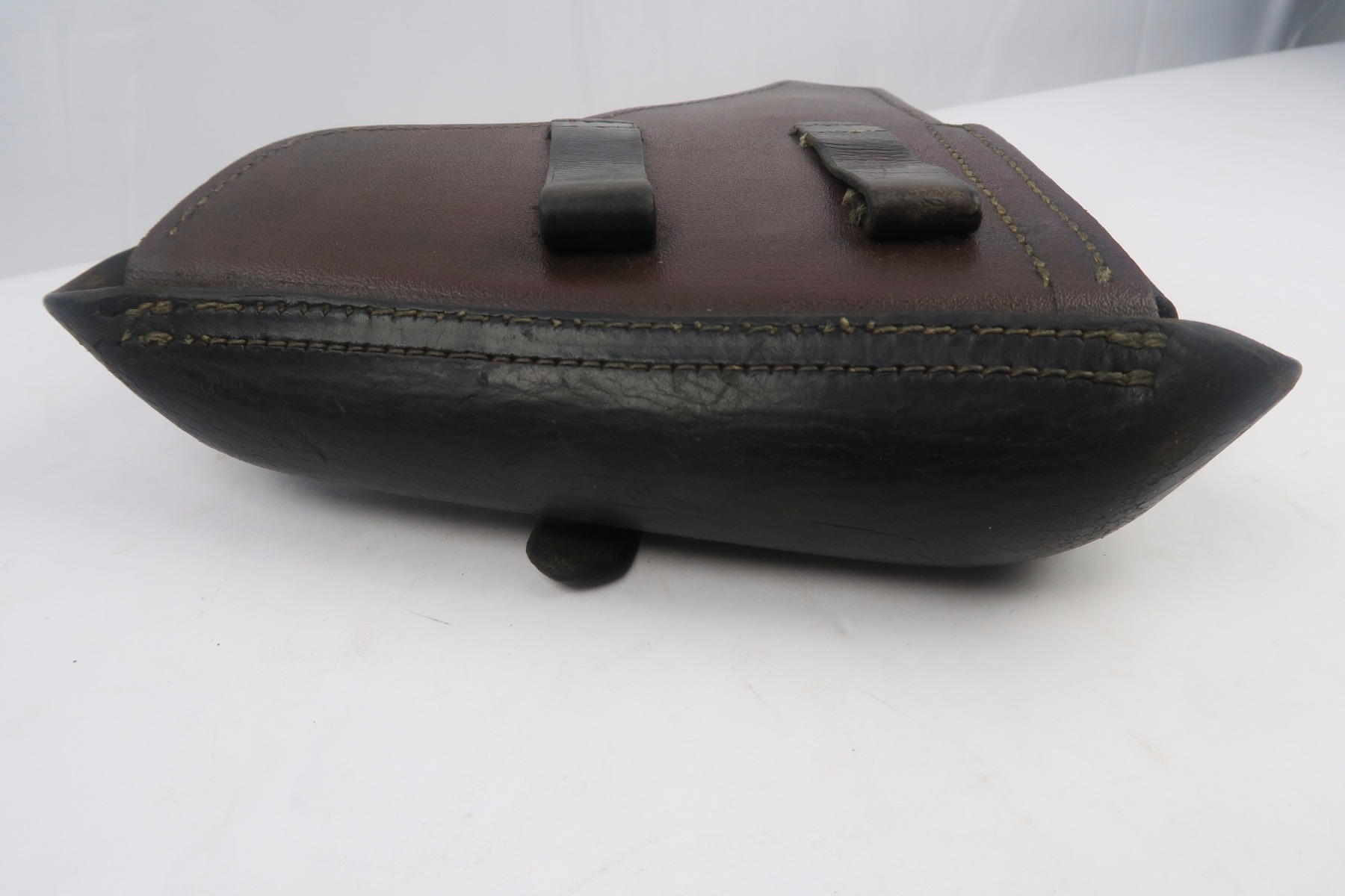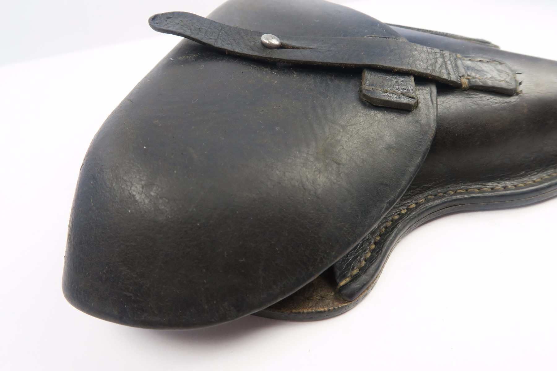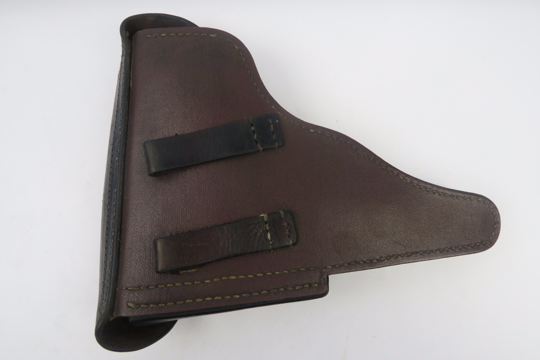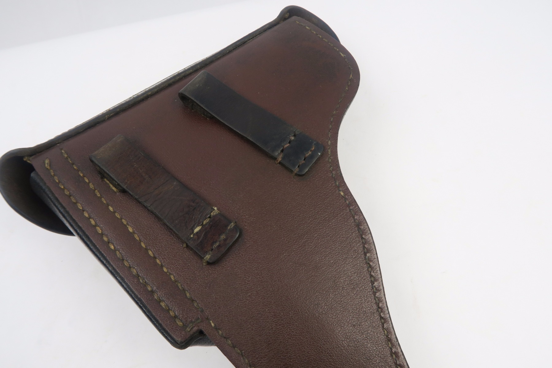 12/1/17 – This is a “last ditch” production Luger holster made from leftover factory materials. This is evident from looking at the different types of leather that make up this holster. The back leather is ersatz style (pressed paper material), while the lid, front body, and closure strap are leather. Finally the magazine pouch and closure strap holding tab are an even different style/cut of leather from the other two styles. The stitching is all in tact and there are no markings. A fairly unique piece of history helps to paint the picture of what was going on at the end of WW2 in terms of production quality.