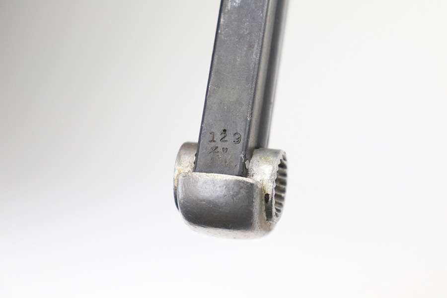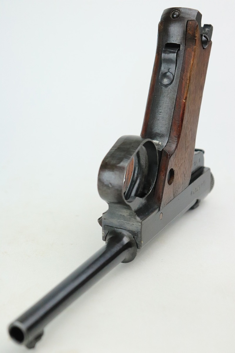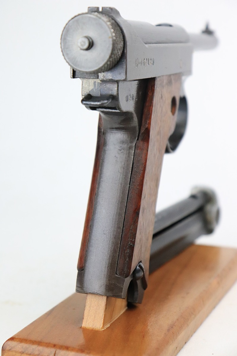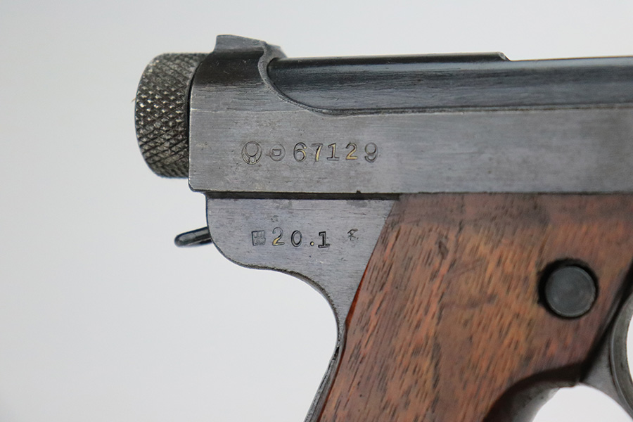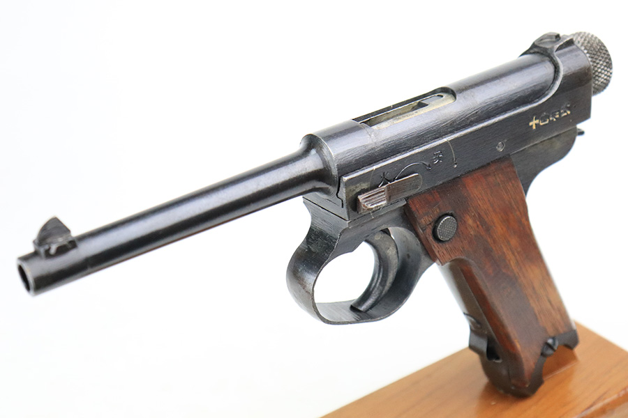 8/24/22 – This is an excellent example of an end-of-war Nambu Type 14 issued to the Japanese military in January of 1945. It is all matching and comes with one original matching-numbered magazine. It has retained roughly 95% of its finish. There is very little actual wear, but there are a few spots of splotchy discoloration on both sides of the frame (mainly on the left side, typical of these late-war finishes). Comes with excellent late-war slab-side grips that are matching to the gun. Stone-mint bore.