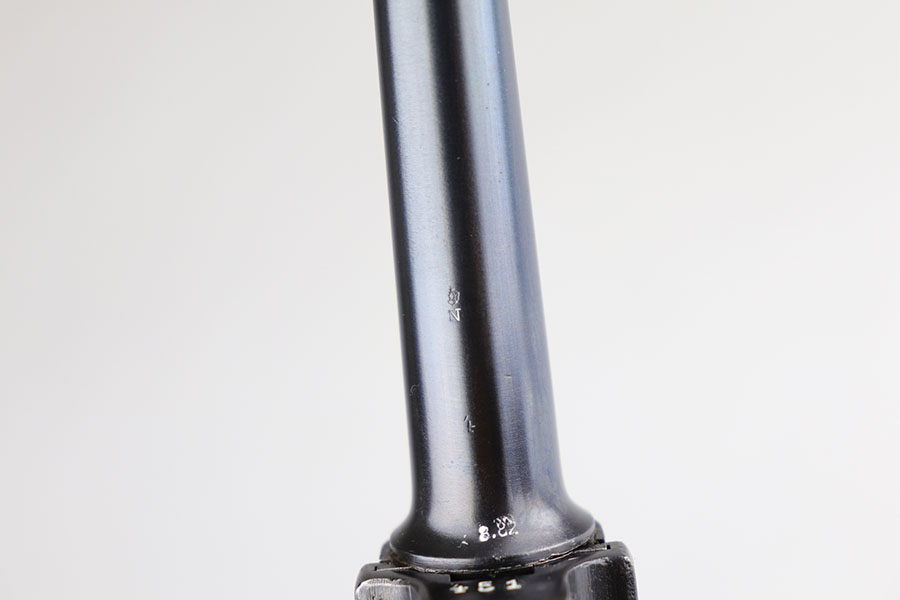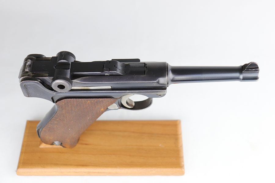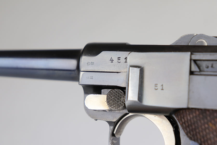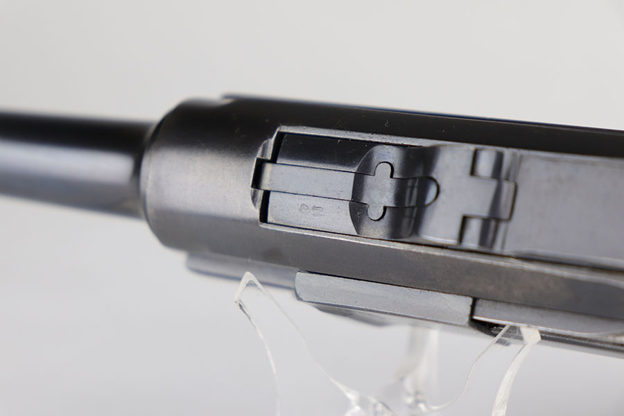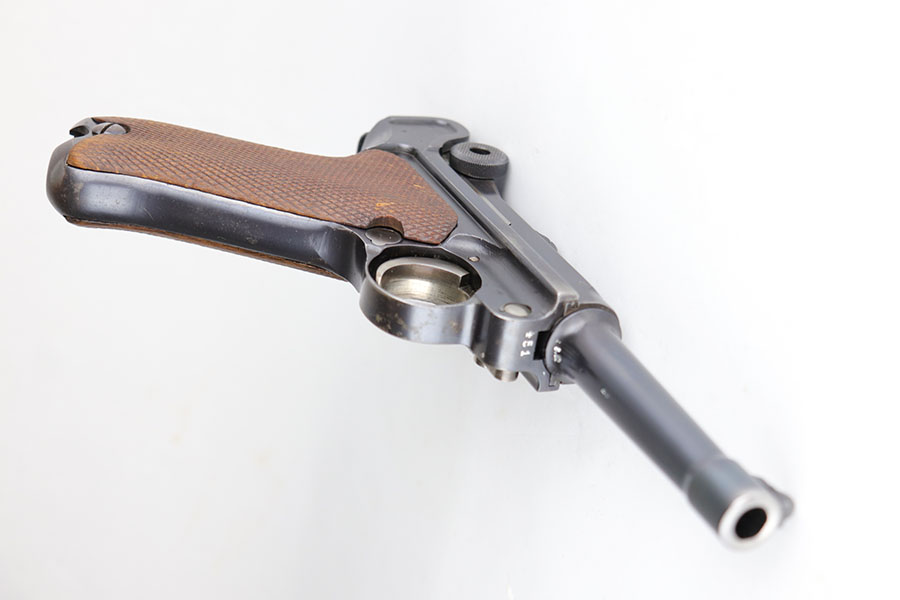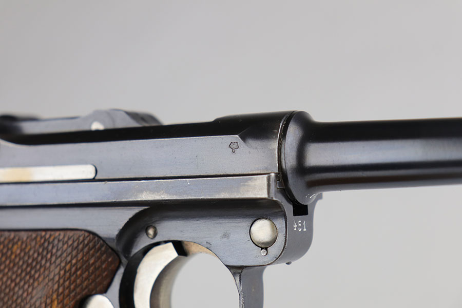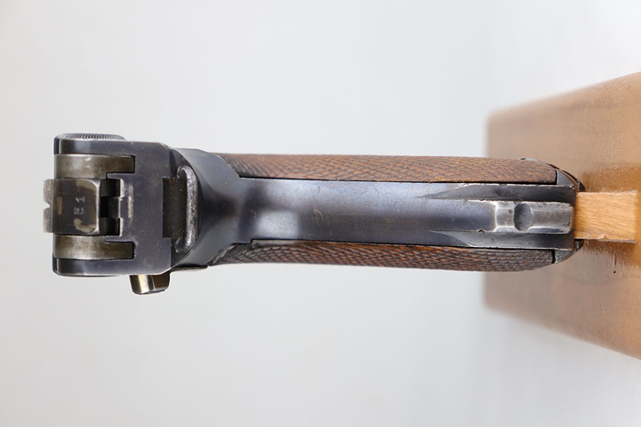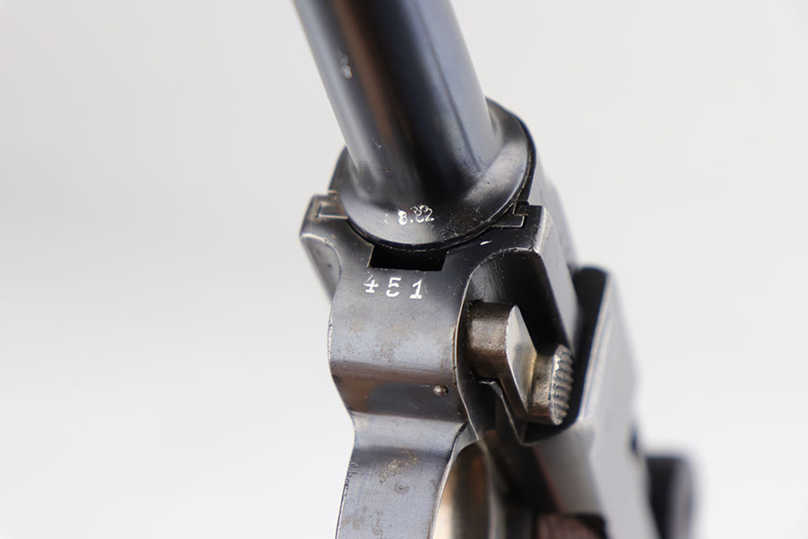 7/2/20 – This gun has very few markings and looks like an end of war “parts” gun with left over parts from DWM, Mauser and Krieghoff. The is no date on the receiver, and the rear toggle has no factory code. The frame looks to be Krieghoff or DWM made. The barrel seems to be DWM. Other parts look like Mauser made. One thing for sure though is the right side of the receiver has a Krieghoff proof, and therefore we believe the final assembly was made at the Krieghoff factory. All of the parts are matching, both internal and external, with the exception of the magazine. We describe this gun as a Frankenstein since it was put together from parts in or around 1944 / 45. It has retained about 96% of its finish. There is thinning on the underside of the side plate, minor muzzle wear, and spots of wear at the bottom of the straps. The straw is worn on the small parts. The bore is shiny with great rifling – just minor frosting. The grips are a little worn but in good condition. It has a leftover WW1 magazine that is numbered to a different gun.
