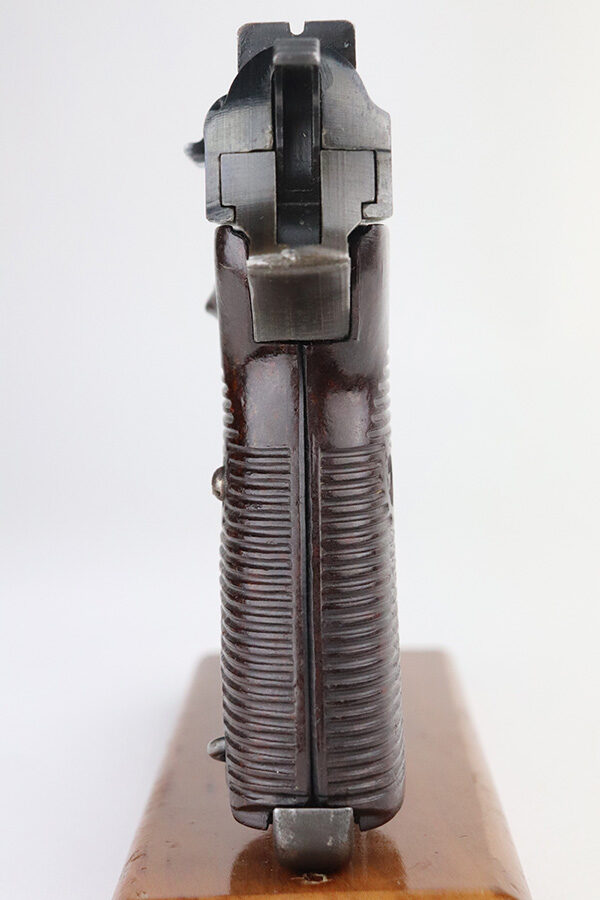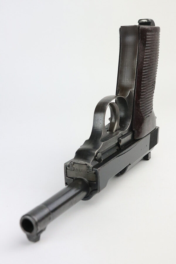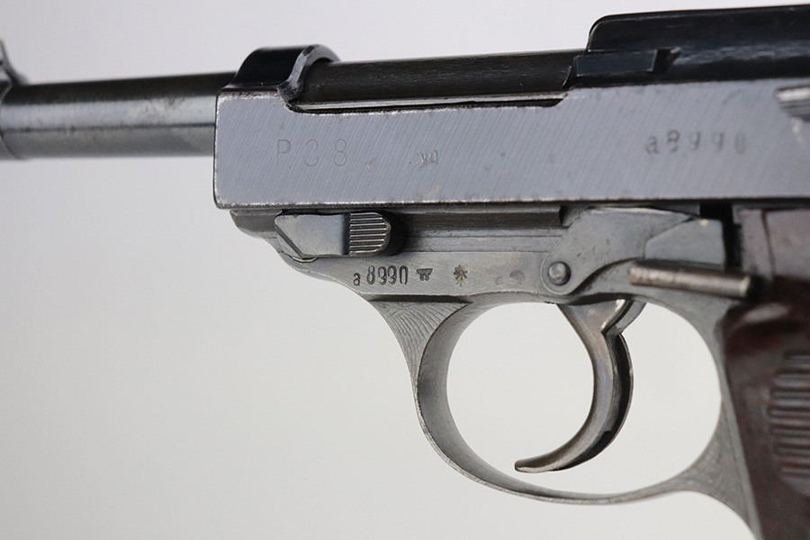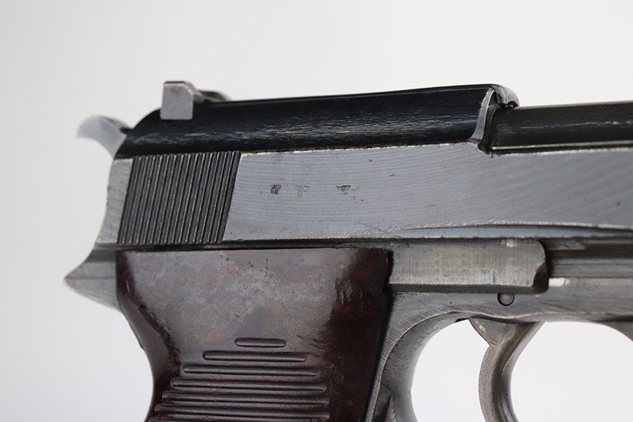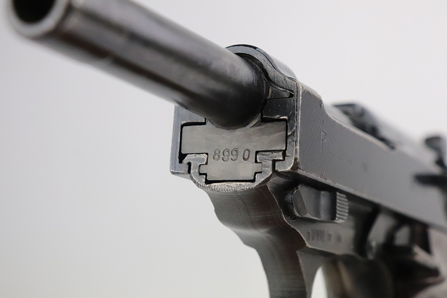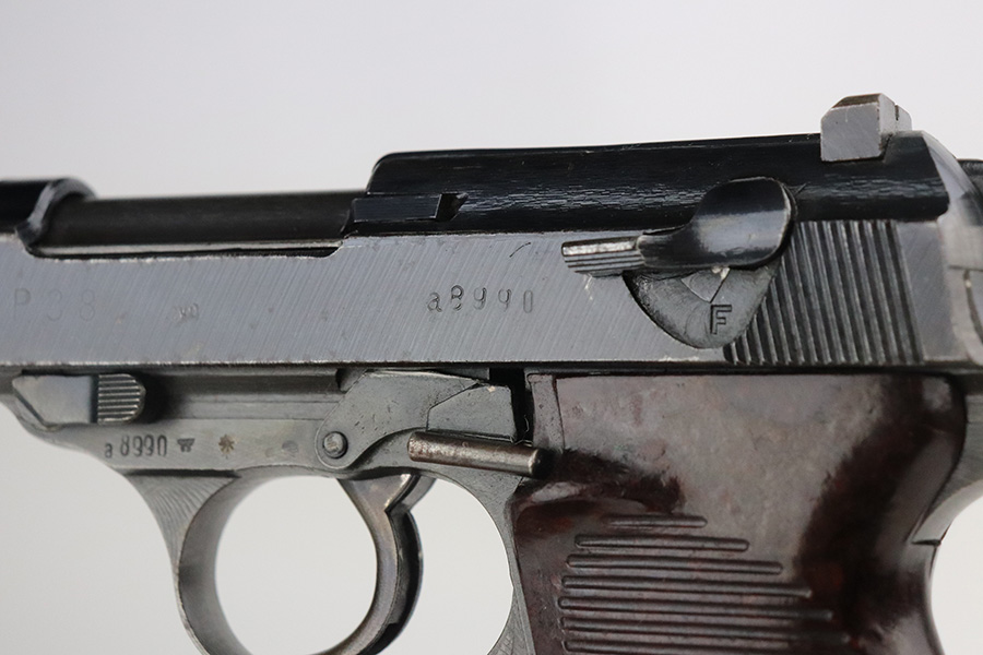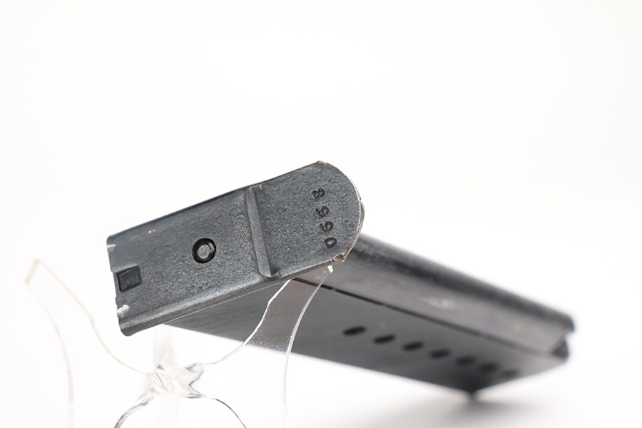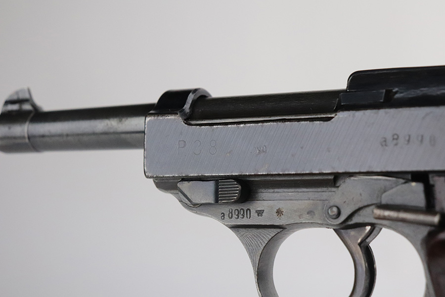 8/2/21 – This is an excellent example of an “a” prefix Spreewerk P.38 issued to the Nazi military just before the end of the war in 1945. It is all matching except for the locking block and has the proper “Eagle 88” military proofs. The frame has an asterisk proof, indicating it failed initial inspection and was sent back to the factory for repair. The barrel has a Mauser proof but is numbered to match. It has retained about 96% of its finish. There is minor wear and tiny dots of freckling along the high edges of the slide and minor thinning and brown patina on the front strap. Comes with excellent grips and a matching-numbered magazine. We assume this magazine was numbered to match after the war, likely used by a police arsenal. The bore has relatively worn rifling with minor pitting throughout. De-cocker is functional.