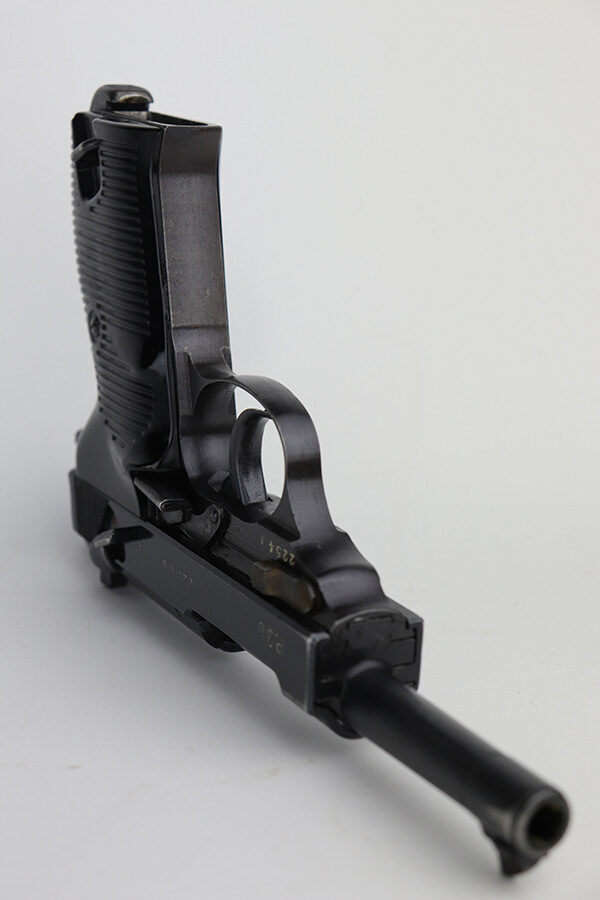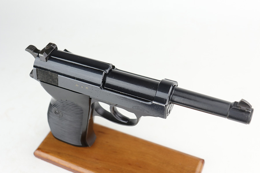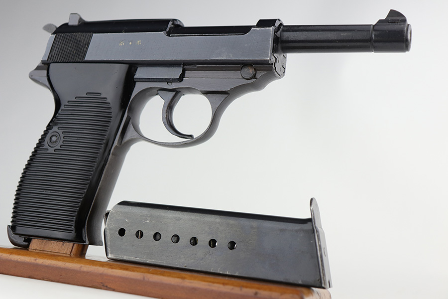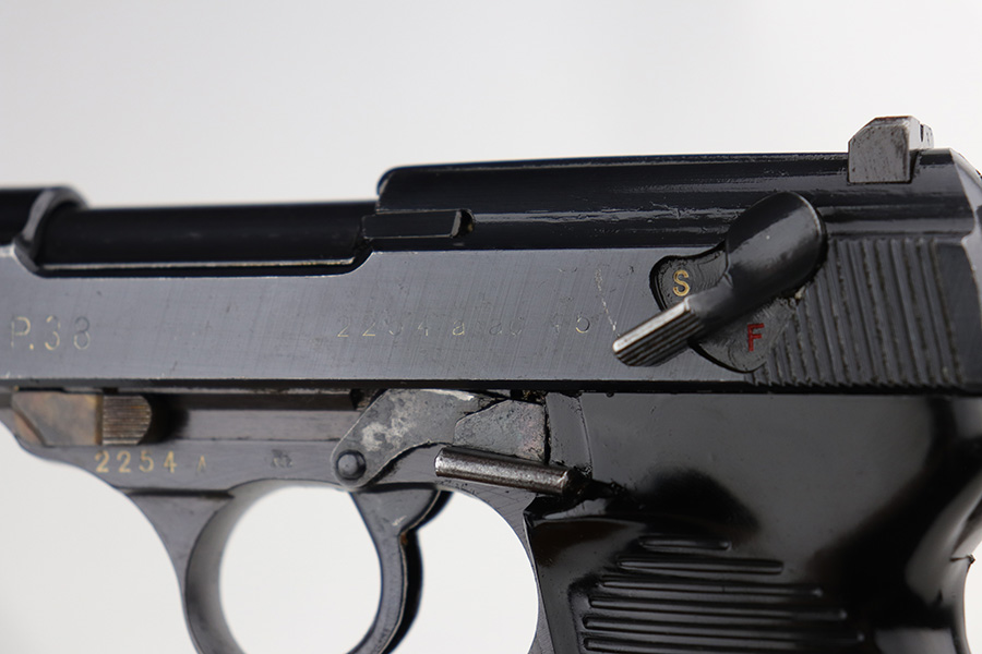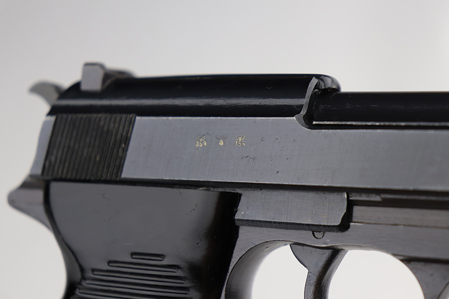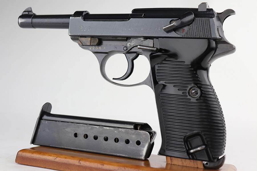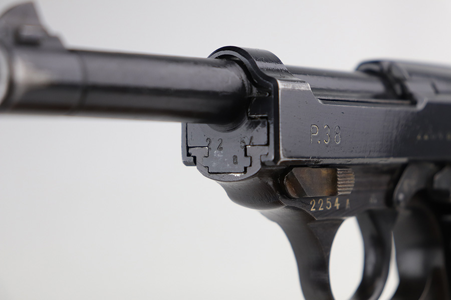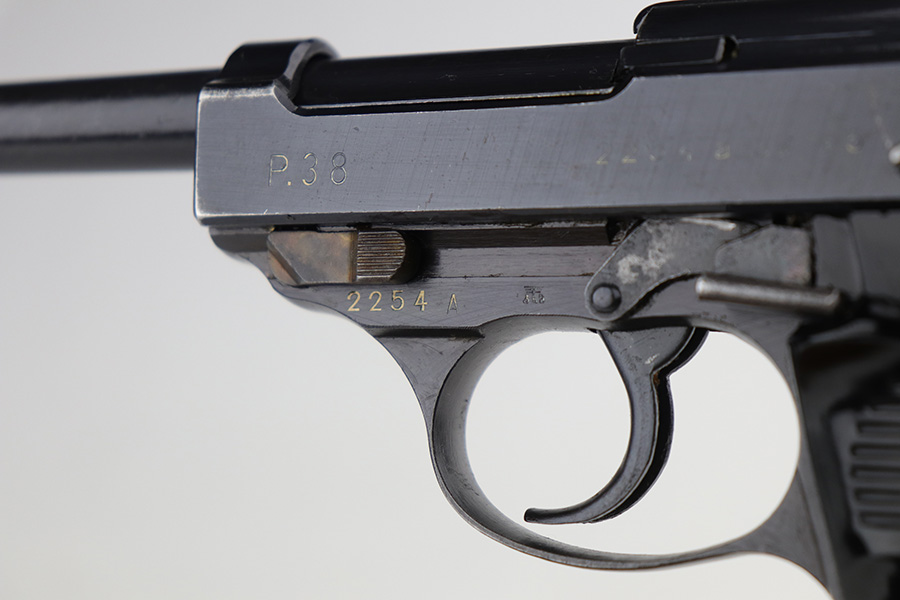 10/4/21 – This is an excellent example of a Walther P.38 issued to the Nazi military in 1945. It is all matching and has proper “Eagle 359” military acceptance proofs on the right side of the slide. The serial number on the left side of frame has a capital “A” suffix. The takedown lever and slide stop have almost a case-hardened finish. The gun has retained about 96% of its finish. There is very minor thinning and patina on the front strap and minor wear on the high edges of the slide and around the muzzle. A few very light surface scratches on the right side of the slide. Comes with excellent black bakelite grips and a rare late-war “U”-marked Walther magazine. Excellent bore with strong rifling with just a few areas of minor freckling. De-cocker is functional.